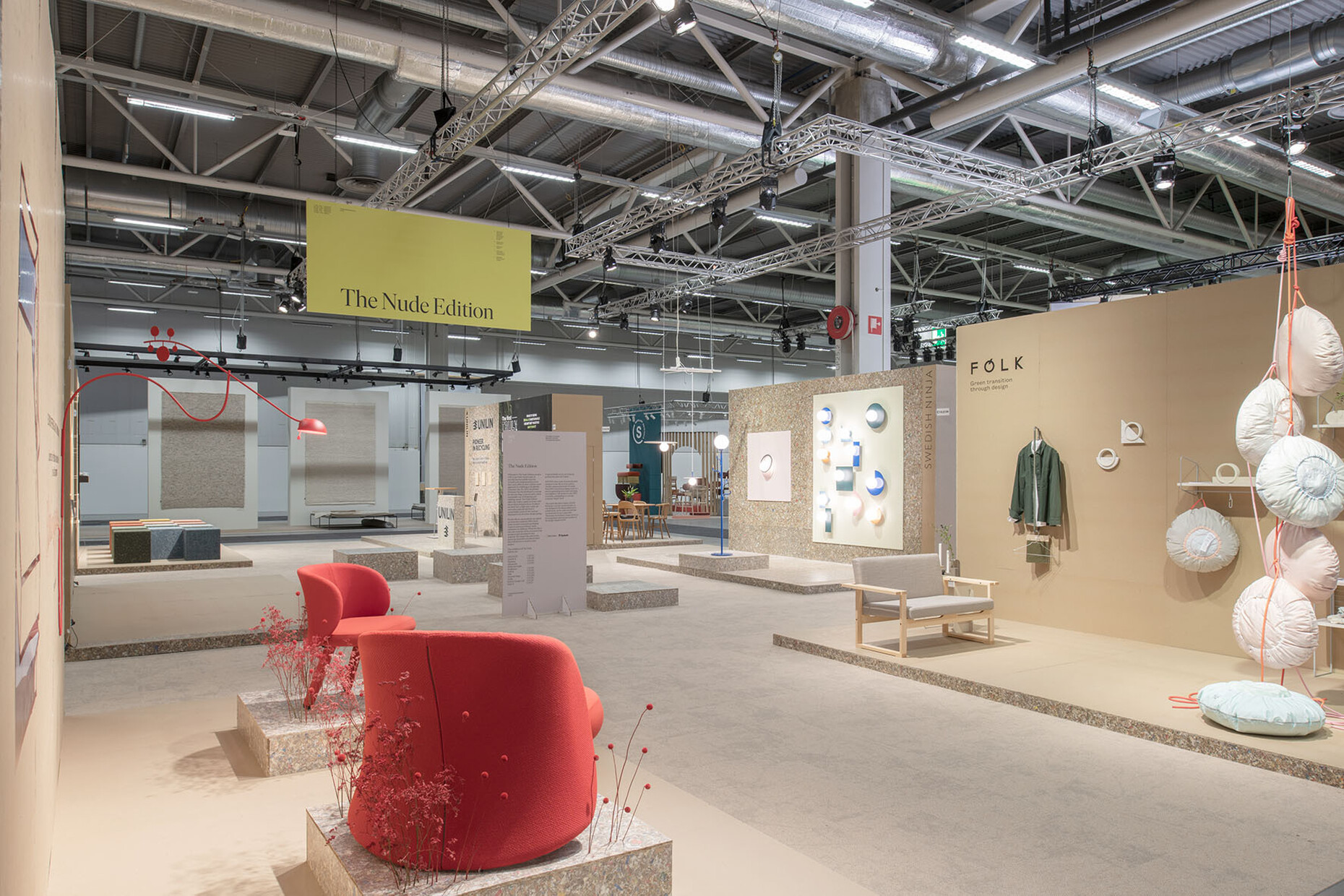 The necessary change of the classic fair structure in favour of a more environmentally friendly offer was addressed in detail by the Stockholm Furniture Fair with the "Nude Edition": In cooperation with the material partners Recoma and Tarkett, the pilot project showed eleven prefabricated stands made of recycled and recyclable material on a small scale. Thus, away from elaborate backdrops, the curated space offered visitors a quick overview of the products on display, which are ideally intended to be just as sustainable. "We listened to our exhibitors. Many of them were seeking a scaled-down alternative to an ordinary exhibition stand, with less effort in planning and, above all, to reduce their climate footprint", says Project Area Manager Hanna Nova Beatrice, who took up the challenge in 2021 to give the Stockholm Furniture Fair and Stockholm Design Week a new boost in the midst of the pandemic.