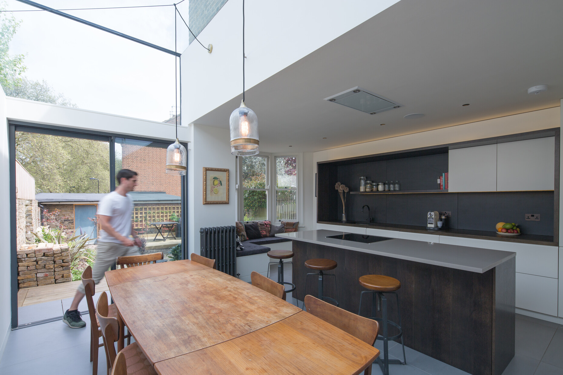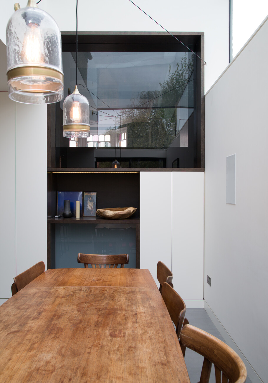 In this project, the architects opened up the dining area to the garden – and the sky. They did so by positioning the long dining table under the glass box, so it now gets ample daylight even in typical English weather. The dining area is linked to the kitchen, the light surfaces of which, together with light floor tiles, give the room a pleasant atmosphere. (as)