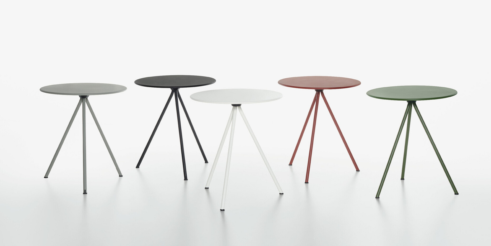 Three legs that look like lines drawn at an angle, positioned under a round tabletop. That's all it takes for a good form, which Biagio Cisotti and Sandra Laube have also provided with a clever function for Plank with "Randevu": Thanks to the mechanism that connects the legs to the tabletop, one of the legs can be moved onto the other and the structure folds back into its two-dimensional shape in a few simple steps and without tools. This way, it can be stored flat or attached to an included wall hook as a sculptural eye-catcher. Thanks to the zinc and powder-coated metal, the table is suitable for both outdoor and indoor use. Available in the colours black, white, oxide red, olive green and concrete grey, it invites people to meet in living areas as well as in hotels, restaurants, offices and public spaces.