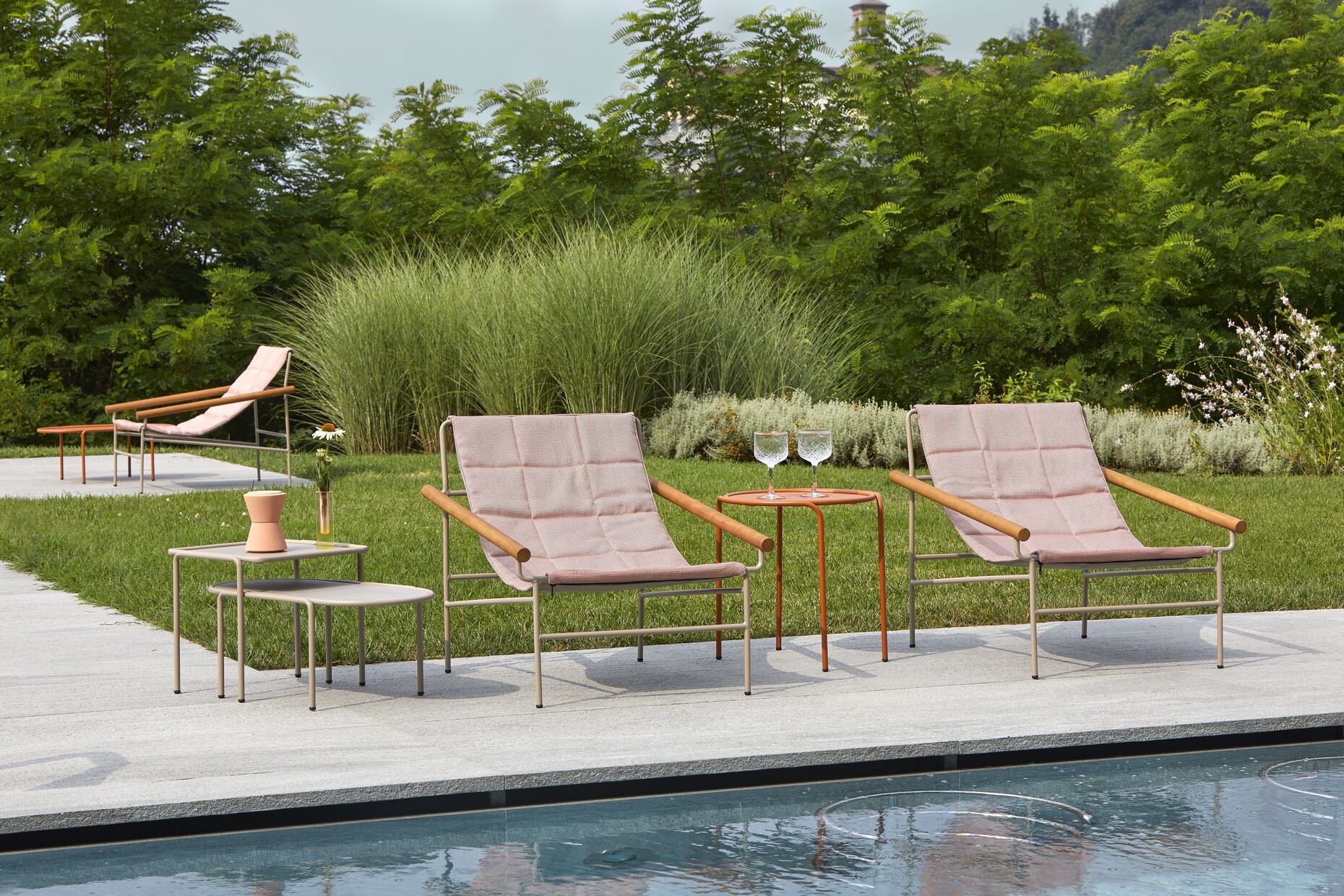 The comfortable "DRESS_CODE" outdoor lounge chair from S-CAB is somewhat reminiscent of a beach chair and allows for a relaxed sitting posture. The combination of materials is suitable for both indoor and outdoor use. The duo Laura Fiaschi and Gabriele Pardi aka gumdesign came up with the design of the collection for the Italian family business: a lightweight metal structure as a base supports two wooden armrests and a robust fabric panel, which is attached to the frame with two hinges. In keeping with the name "DRESS_CODE", the desired fabric version can be changed at any time, just like a piece of clothing. The quilting and upholstery are both a graphic element and a source of additional comfort.