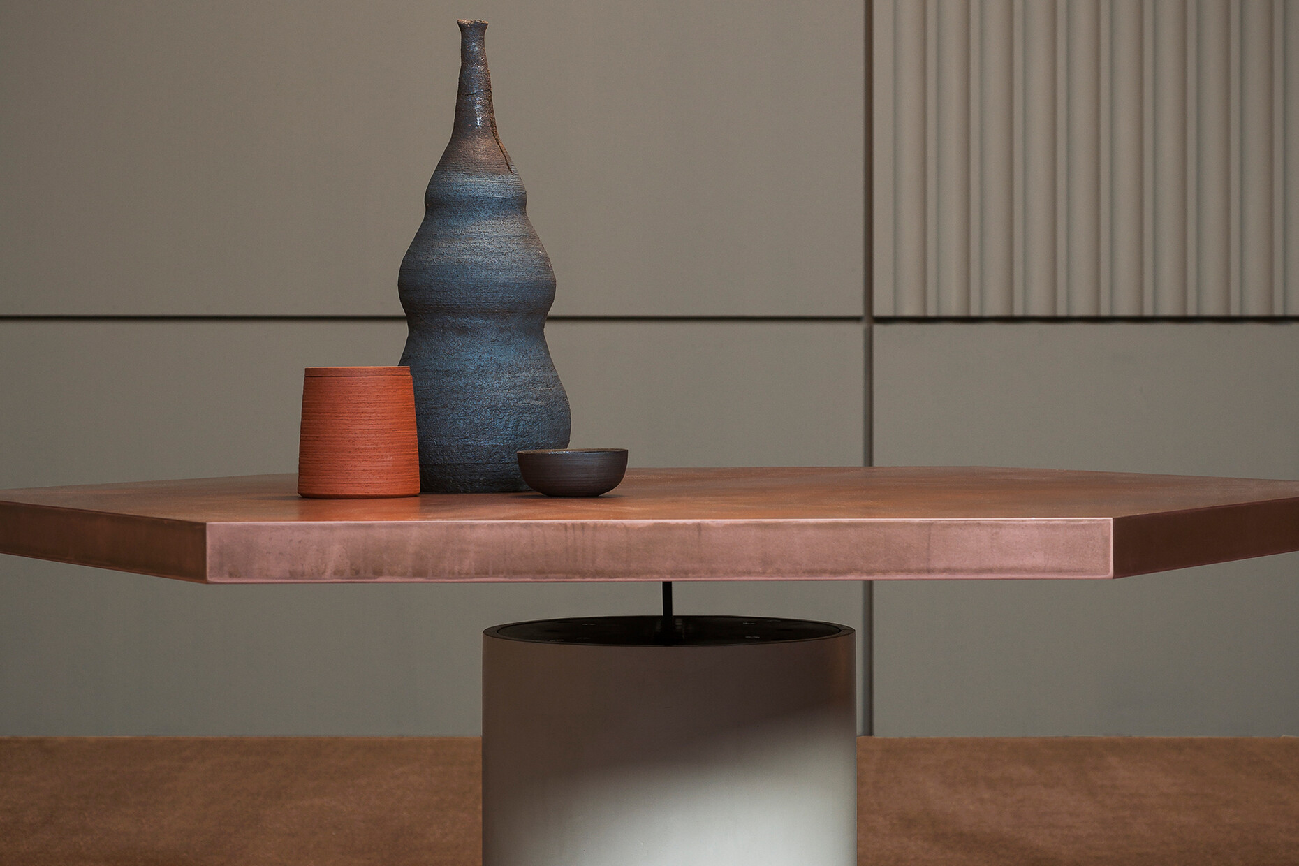 Jury statement: The “Jupiter” table designed by Studio Pepe for Baxter appears to mock the laws of physics. The solid copper tabletop is connected to the cylindrical table leg by nothing but a delicate stud.