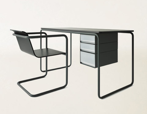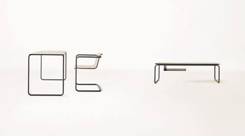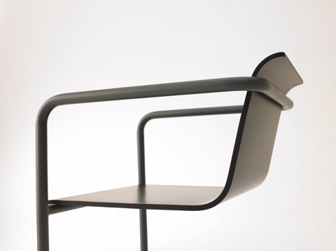 James Irvine, who is responsible for many of Thonet’s designs and who works as their creative director has dared to tackle the project with the world famous cafe chair “No. 14”, the erstwhile world success which celebrates its 150th birthday in 2009. In his design, Irvine closed the curved backrest with a narrow, horizontal crossbeam which at first looks like an all-too-pragmatic response to our times, like a blindfold tied around an icon. If the chair is placed next to the table which was designed together with it, this crossbeam merges optically with the table top leaving only the line of the bent wood throughout, as if one wanted to demonstrate the beauty of bent wood technology in a prime example. Konstantin Grcic on the other hand adopted the Thonet 1920s tubular steel furniture classics and re-intepreted the designs of Mart Stam amd Marcel Breuer with the competent interventions he is known for. His tubular steel cantilever chair with its continuous wavy seating shell is conspicuously reminiscent of Alvar Aalto’s Paimio furniture. Grcic also developed a matching side table and a desk.