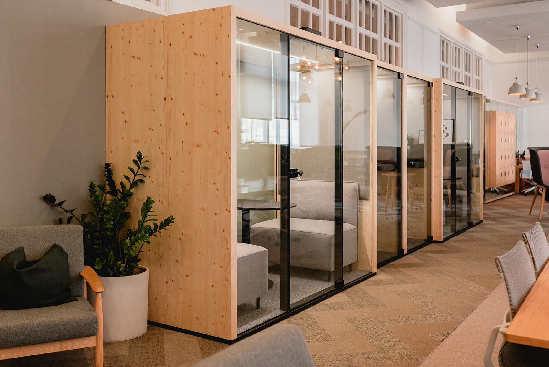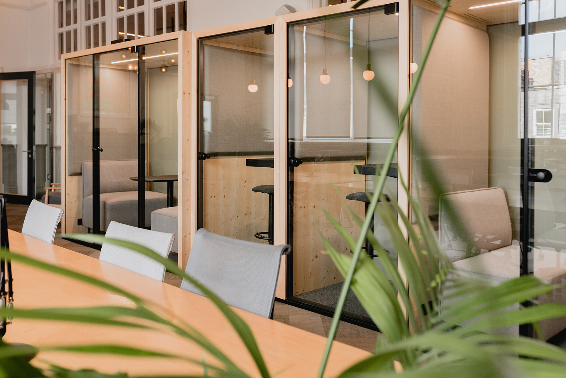 King's Cross Station in London: history and the present day come together at this hub of the city, whose walls were once witnesses to industrialisation. Millions of guests use the station every year, which was opened in 1852 by architect Lewis Cubitt and whose brick, steel and iron elements are now listed as historic monuments. Working in this dynamic atmosphere is special in every way. The Fora company rents out private offices, co-working spaces and meeting rooms on the upper floors of the station for this purpose. But how do you create the right conditions for concentrated work in such a turbulent setting? Finnish company Taiga provided the solution for Fora East Side with soundproof, modular office pods that are both functional and aesthetically pleasing: ‘Lohko Box’. Available in different sizes, the compact cabins offer space for undisturbed phone calls, work or confidential meetings.