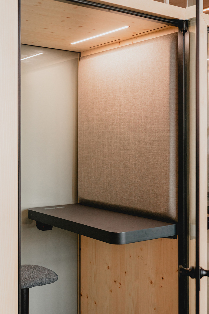 Made from FSC-certified wood, fitted with a carpet of recyclable nylon and a door with laminated glass, the ‘Lohko Box’ has a homely feel. One- and two-square-metre versions were selected for Fora East Side, which can be flexibly equipped with the "Lohko Table", power sockets, the "Lohko Sofa" or the adjustable "Lohko Stool", for example. Taiga's focus on durability and clarity, on sustainable workplace solutions, promotes concentration and well-being in equal measure.