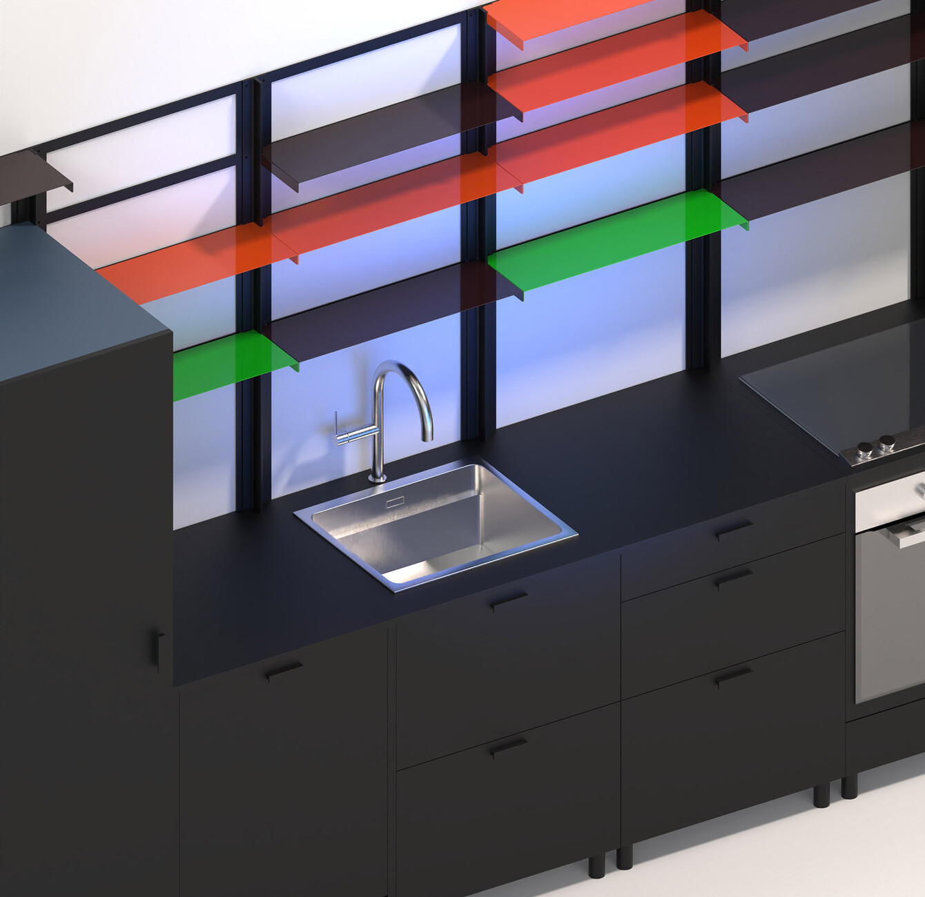 For the kitchen design, Schütte-Lihotzky had analysed the movements of people in a kitchen in advance and based her design on this. "100 years later, the kitchen, with its plain fronts and built flat against the wall, virtually disappears into the architecture, even though it is a social space in which we spend a lot of time. I asked myself why this is so," says Tanita Klein about her design approach. With "POSSI" she has created a system that stands for communal cooking: The flexible, modular kitchen furniture is arranged around a central framework and can be adapted, exchanged and reassembled at any time. A clear, practical structure whose movable storage surfaces shine in pop colours such as neon green, orange or pink. The alternation of closed and open surfaces has an airy effect and keeps the most important utensils within reach at all times when cooking. "Functionality has extreme aesthetics for me," she says.