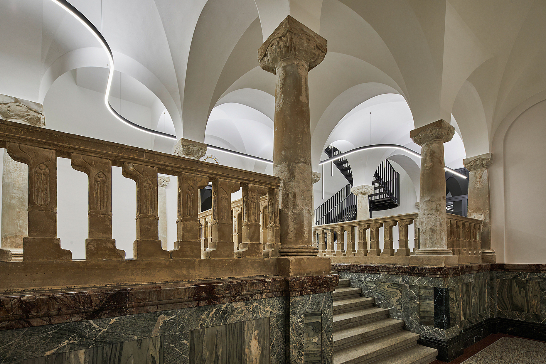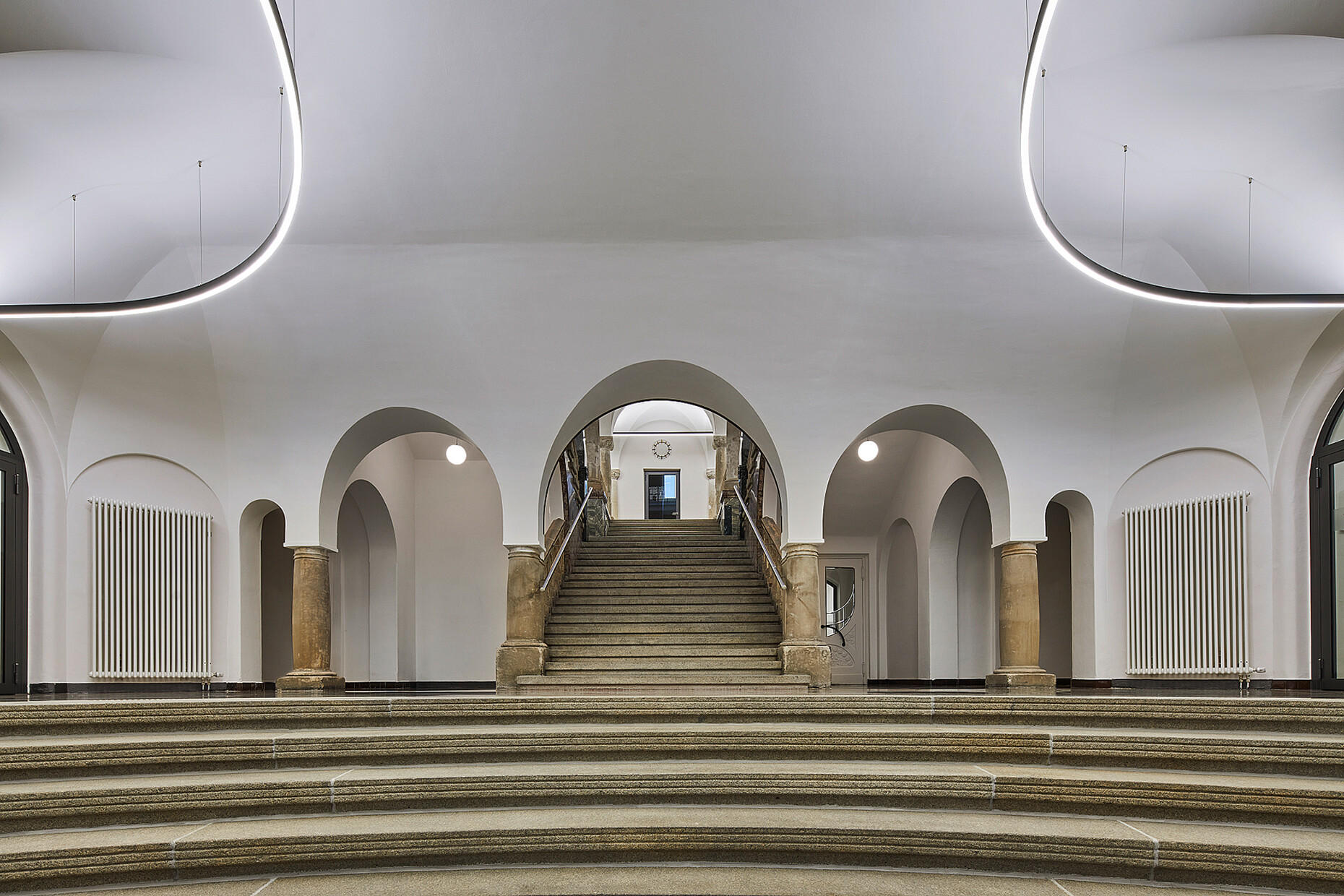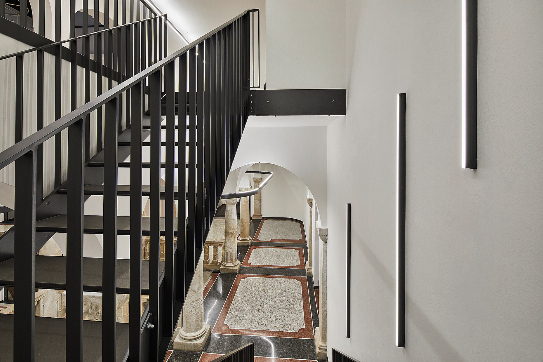 The lighting concept not only emphasizes the sculptural nature of the existing building’s cross vaults but also generates an overall aesthetic guideline that becomes part of the new and historic architecture. Moreover, as the “LED-Linargo” luminaires boast a delicate shade of anthracite they provide a link with the modern architectural elements. At the same time, their curved design refers to the shape of the historic round arches. Installed vertically as wall-mounted luminaires, the “LED LightLines” by TTC Timmler Technology also cite the architecture and immerse the new metal staircase in an even light. The light lines are subtly positioned at the top of the stairs and take up the vertical structure of the banisters. Moreover, like the other luminaires they form a gentle contrast to the sculptural stone architecture of the existing building and add a new time layer to the administration building.