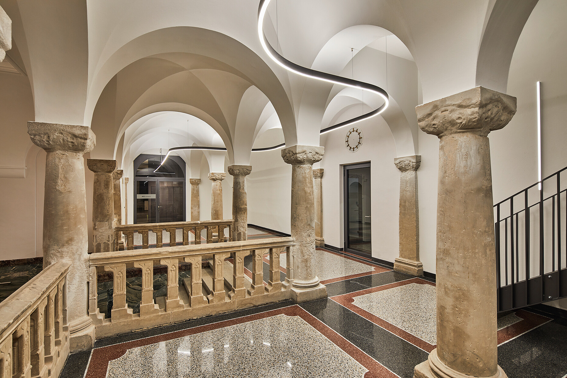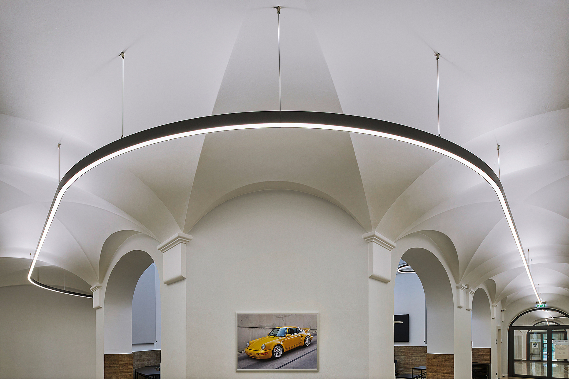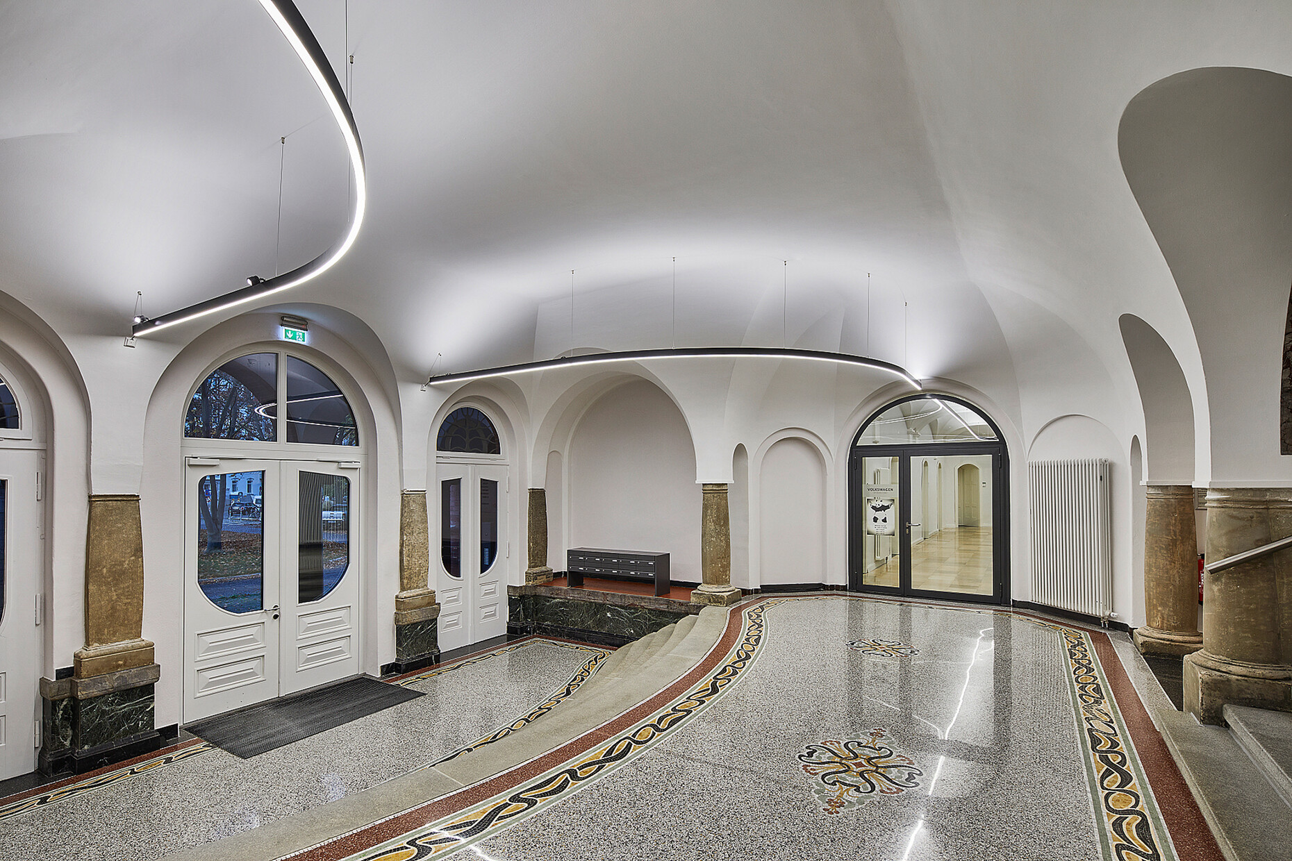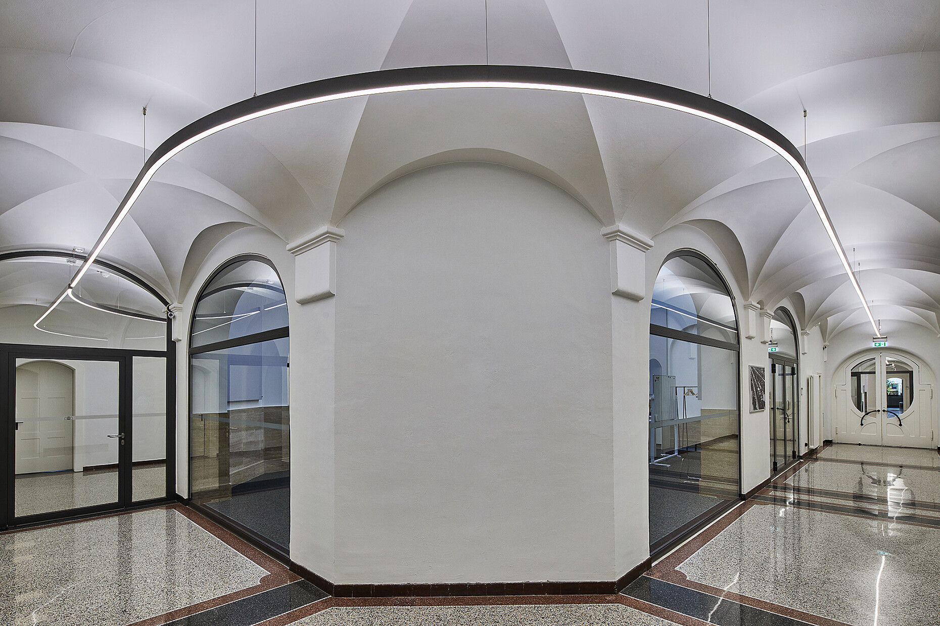 A centerpiece of the lighting concept is the idea of continuous lines of light that are intended to help link the individual sections of the building to one another. The lighting designers opted for the "LED-Linargo" pendant luminaire from the ADO Lights brand by TTC Timmler Technology, which now runs through the building in straight and curved forms, producing both direct and indirect light. Boasting a span of over 4.50 meters and featuring barely noticeable suspension points in the round arches of the original building each line of light seem to float in space. In addition, careful consideration was given before making any interventions in the historical substance of the building. Consequently, the new lighting elements are positioned at existing cable outlets, which meant it wasn’t necessary to place new anchor points in the original vaults. In the entrance area the “LED-Linargo” luminaires are fitted out with “LED-Luc” spotlights, likewise courtesy of TTC Timmler Technology. They enable additional lighting scenarios and thanks to their indirect light create an inviting entrance area that anticipates the design concept of the building as a whole.