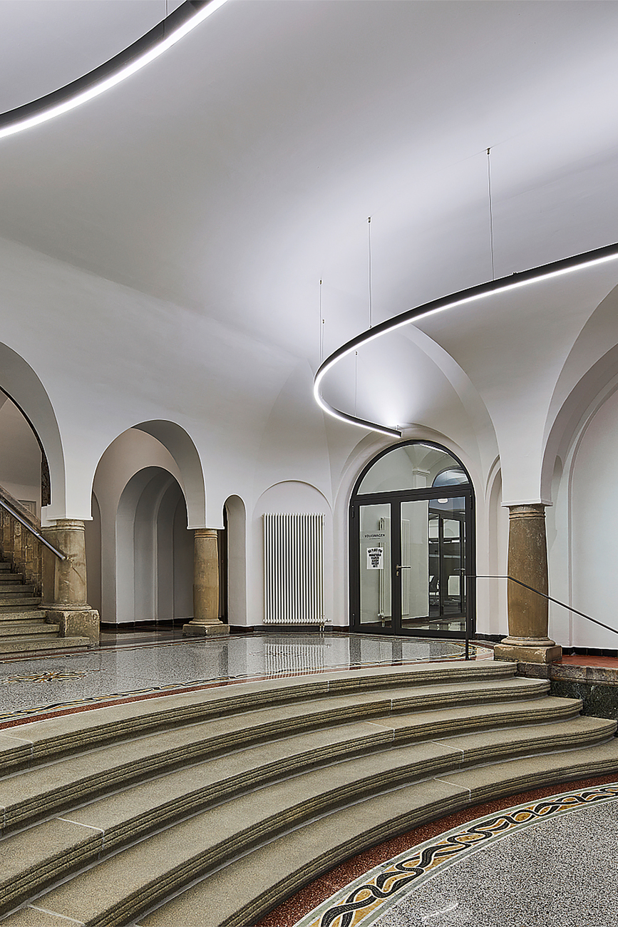 The buildings on Hanomag’s former site in Hanover are among the most important examples of German industrial architecture in the late 19th and early 20th century. One example is the so-called head office, an administration building that was designed by the architect G. Phillips and built at the start of the 20th century. Today, the building with its symmetrical floor plan and open, triple-arched columned hall has been refurbished and accommodates business lofts. New architectural elements such as a steel staircase were inserted discreetly in a successful effort to ensure they took a back seat to the decorative, sculptural architecture of the original building. These new elements have all been finished in anthracite and their minimalist design creates a subtle contrast. This is also true of the lighting concept which is the work of Studio DL. The concept also forms part of the refurbishing measures and among other things includes luminaires by TTC Timmler Technology for the rooms in the head office. The result is circumspect illumination of the architecture that oscillates between modern expression and a nod to the historical heritage.