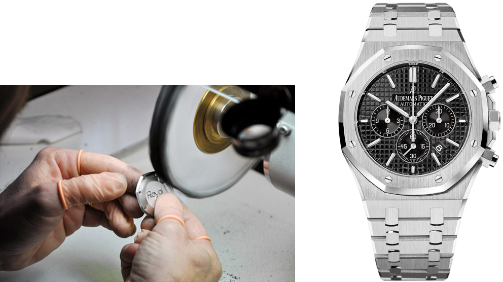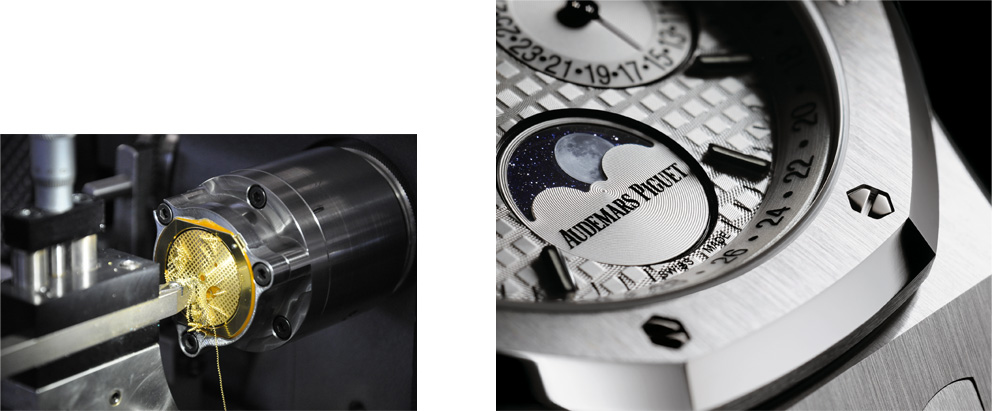 The rigorous but highly sculptural grid embellishing the “Royal Oak’s” clock face is not dissimilar to the urban layouts of Baroque cities, such as Mannheim, which has been divided into squares. And what appears to be an embossing to the naked eye has in fact been milled from the material, with delicate circular patterns forming on the surface, as a look through the watchmaker’s magnifying glass readily reveals.