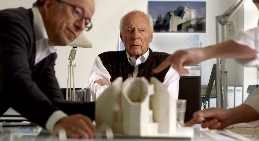 The film is not just devoted to the built projects, but also familiarizes us with the life in the Böhm family. The young filmmaker Maurizius Staerkle-Drux is a friend of the family and considers Gottfried Böhm “despite the great difference in age as an inquisitive and impressive artists who is my intellectual contemporary.” For over two years Staerkle-Drux lived in the the family’s midst and filmed away. He takes us along into the living room or over to the drawing boards. Where we soon find that not everything in the Böhm family enterprises comes up roses. It may be one family, but there are four independent offices and above all four very stubborn characters. “Somehow Paul went and pushed his way in,” we hear Peter cursing, “and I really need work at the moment.” He most clearly considers the brothers as rival entrepreneurs. And Paul confirms: “Perhaps it’s the self-same situation as when we were kids.” Peter says of himself that he has done a few things differently to his brothers – yet in fact it is Stephan who in architectural terms has distanced himself most from his family roots. He designs many buildings in China, and enthuses about the dynamism there. But when projects there stutter he seems lost, sitting alone in a ruined building instead of at table dining with his bros.