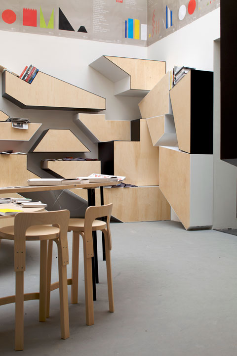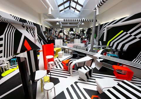 With black and white stripes, mirrors and all kinds of psychedelic patterns that completely cover the floor, walls, utility shafts and furnishings, he disturbs the observer's perception to such an extent that the latter feels deprived of all stable orientation. Anyone who spends time here is virtually dazzled by all these resplendent patterns, a game with illusions that cannot be put together synthetically to create one single perception but keep on breaking up into individual pieces. You entered as a common hungry or thirsty person and now you feel drunk on top of everything else, and aside from this you hunger and thirst for calmness and contained order. However, it is not you but the space surrounding you that is drunk; everything you were familiar with seems shattered, the brain's synapses overloaded. "Lighter than a cork, I danced on the waves" reads Arthur Rimbaud's poem "Le Bateau ivre". And that is exactly how you will feel if you spend too much time in Rehberger's cafeteria.