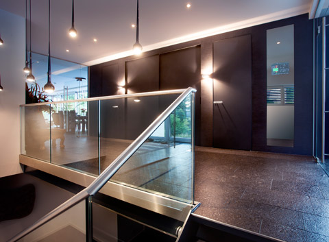 The developers wanted all the technical components that define a modern house to be intelligently networked, without the technology taking the front seat. The Gira Panel visualization, namely the Gira Interface, was therefore integrated into a mirror in the corridor.