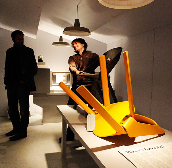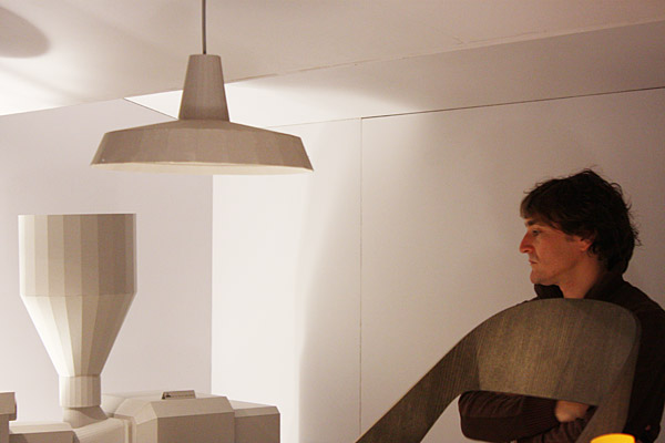 Langenthal, November 2010: For this year's Designers' Saturday Jörg Boner has installed himself in the old mill. Given carte blanche, the Zurich designer and his team erected a miniature factory of cardboard to present the current designs. The saw-tooth roofs of the walk-through model factory extend up to the ceiling of the low room. Inside a small, reduced area opens up - clad all around with cardboard. Straight from production and standing as if on a runway on a centrally placed table are two chairs: The new "Wogg 50" in bright orange and dark-gray glaze. After spending three years conceiving and developing it the plywood chair is to be presented next January at the imm Cologne as a mass-produced item. Sandra Hofmeister spoke to Jörg Boner about the development and design of the new item. Sandra Hofmeister: At the center of your miniature factory in Langenthal stands the "Wogg 50". Is the plywood chair a "factory item"? Jörg Boner: I don't think so. But I am in principle interested in "factory" conditions. The production means, opportunities and methods are extremely important in design. I don't believe in designs that evolve outside of this context, and are produced somewhere by someone. I prefer to visit firms, study their production processes and manufacturing methods and try to develop my designs from out of this context. This is more what is behind our homage to the factory. You are a carpenter by trade and your new chair is a wooden chair. Was the artisan background important for your design? Or were the methods of machine-based serial production the important factor? Jörg Boner: Naturally, as I was once a carpenter I thought I can work with wood and plywood better . Early on in the design process I got in touch with Becker - a German firm specialized in shaped plywood parts and which produces the individual elements of the chair today. I quickly realized that I had absolutely no idea about molded plywood. Industrial wood working is very complex especially when details are involved At any rate my experience as a carpenter was not really of much use to me for this project. Unlike plastic wood also stands in the furniture industry for a close connection with craftsmanship. Is that a misconception? Jörg Boner: The myth about plastic says that the material is much more industrial than wood. But in many cases that is not so. Plastic offers designers a fair amount of liberty as regards styling that is much more complicated with molded plywood. The "Wogg 50" consists of two parts - the seat area and backrest. Then there are the legs. For the molded plywood we developed two tools. The beech veneer sections were stuck on top of each other like thin layers of paper and pressed into shape in the tools. The production process is done entirely by machines - with some manual work being involved in clamping the components in the tools. Then the individual sections are assembled at Wogg in Switzerland. To what extent was the choice of molded plywood as material a conscious decision? Jörg Boner: First of all, Wogg wanted to develop a wooden chair from the start. The second point that influenced the choice of material has to do with production conditions: The firm Becker is located in the middle of a beechwood forest. The trees are cut and processed there. I find it sensible and exciting to process the material directly on site. Wood is a renewable raw material that has a certain naturalness and can be worked intelligently using a small amount of adhesive. That's what attracted me. The chair is not to cost more than EUR 400 in stores. How do you deal with such requirements as a designer? Jörg Boner: Ultimately, you talk about the actual production price and the manufacturing budget for the chair. I know Wogg so well by now that we can talk openly about cost calculations. I find it exciting when design has to develop within a cost framework! At any rate I would not like to design something and then ask a fantastic price for it. That is not professional, as I see it. But there are a few design schools which work exactly like that and see the design as an artistic act separate from all else, and which results in expensive, limited editions Do you see yourself more as an industrial designer than an artist? Jörg Boner: Most definitely. I relish the challenge of combining technical components with the formal requirement of development something contemporary. But it made producing a wooden chair especially difficult: We wanted to take into account all the conditions of industrial production and simultaneously design a chair that looks like it was designed in 2010, which not only speaks the contemporary formal language but is also based on the current state of knowledge. How can you recognize contemporary quality and state of knowledge when you observe the result? Jörg Boner: First it is the sparing use of the material. But I also attach importance to formal decisions: It is about an aesthetic that corresponds with what interests us today. That might sound vague but what I mean is a kind of individuality that lends the subjects important to us today a characteristic shape. Like a sculpture that has something to do with the here and now. Moreover, the two joints on the sides of the seat, where everything comes together are only possible in this style using the latest pressing technology. They come out of the tool as they are and there is no additional adhesive work as there was before. At any rate your own handwriting but also that of Wogg are clearly recognizable. How did you arrive at the individual curves and the bends in the backrest and seat area? Jörg Boner: To begin with we always develop ideas and sketch them. But then for the "Wogg 50" we quickly changed to producing 3D-drawings because they give you a better impression of the chair. As soon this concept coincided with the original idea we built a 1:1 model of cardboard. We used the pattern from the computer drawing to print out individu