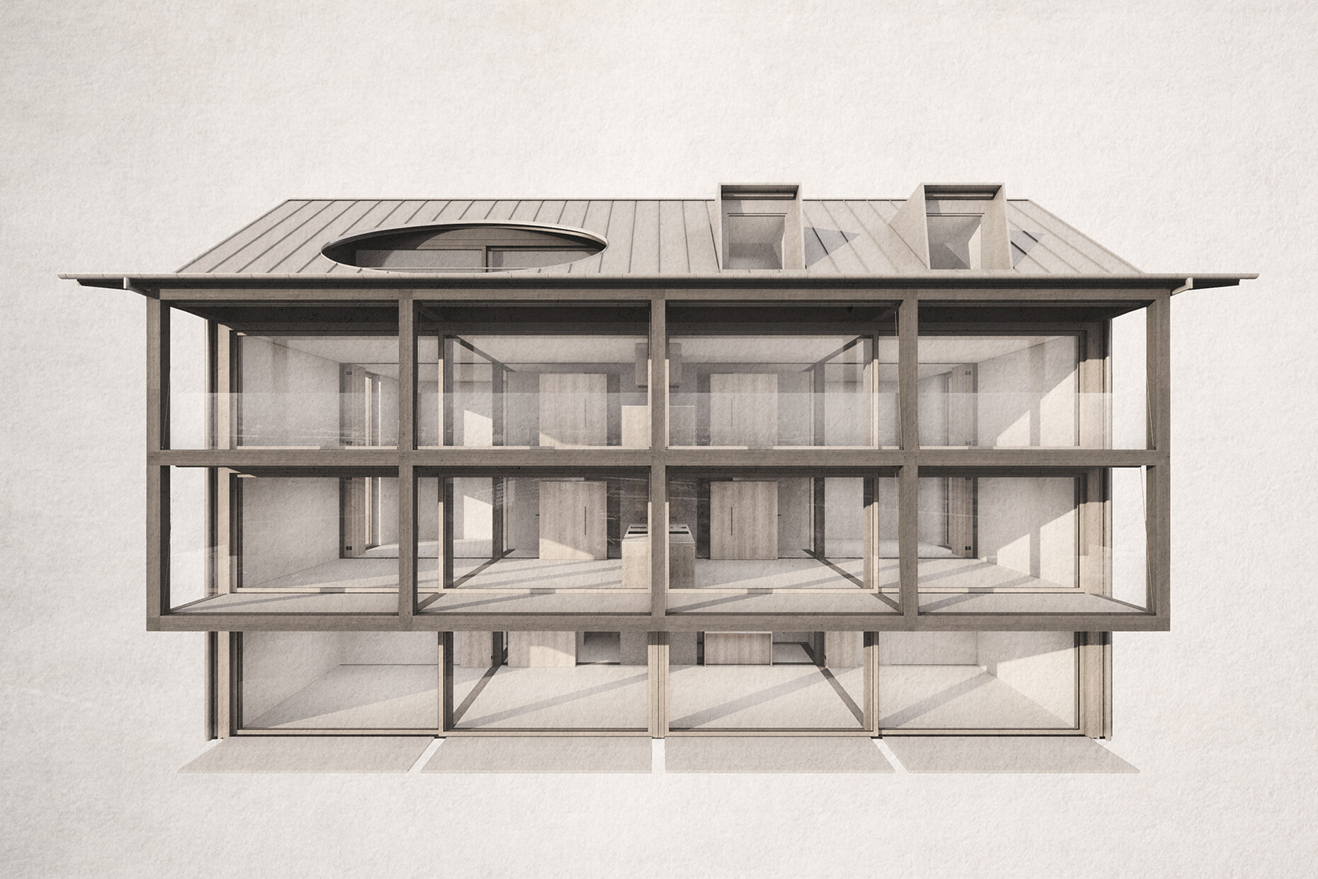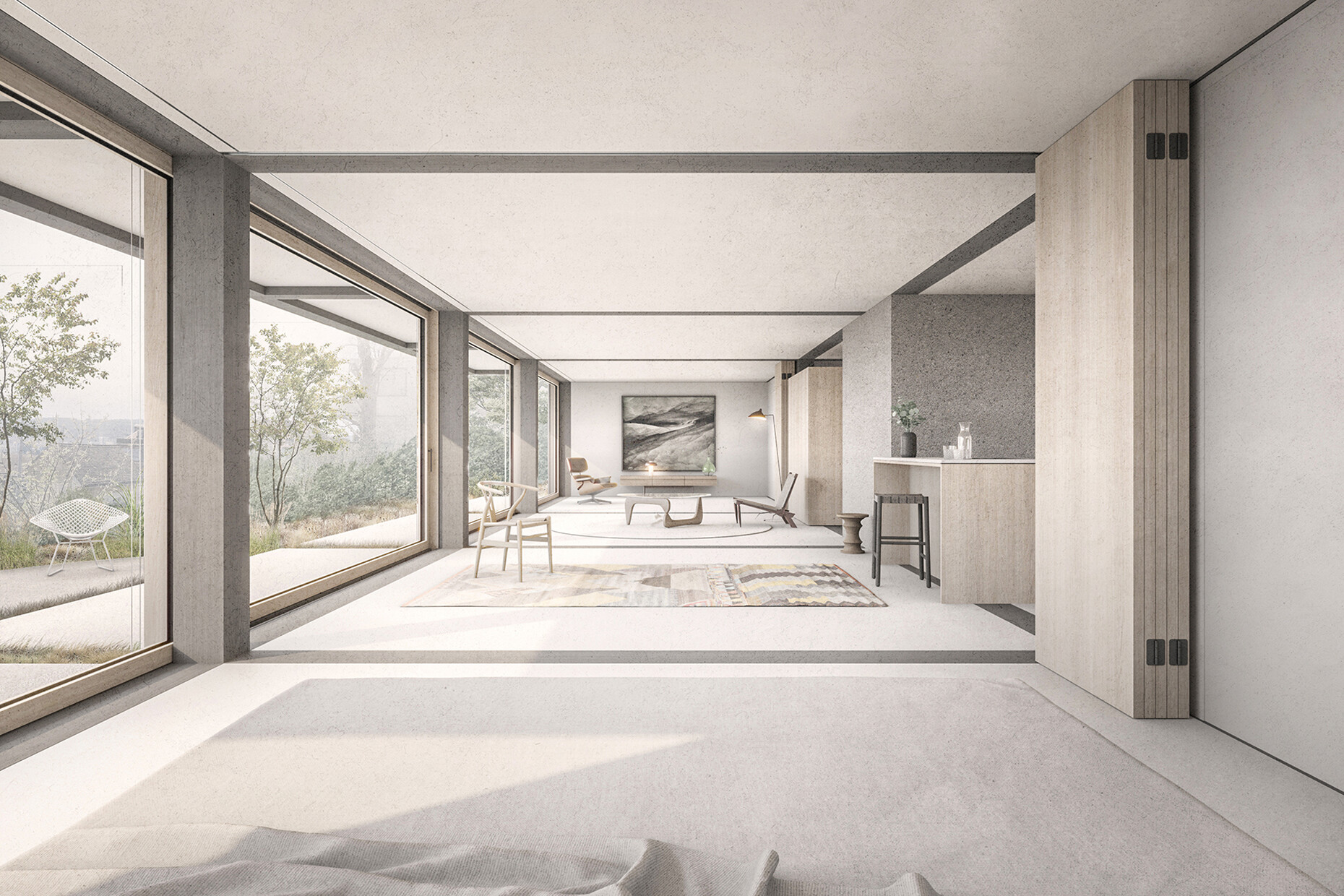 The visible grid of the timber construction zones the 60-square-meter apartments into four quadrants. Each is allotted a function, cooking, and eating as well as living occupy the two areas facing the view. Behind them is a flexible bedroom and access together with a small bathroom. All the rooms, apart from the bathroom can be opened out onto each other via folding or sliding doors, which creates the impression of ample space.