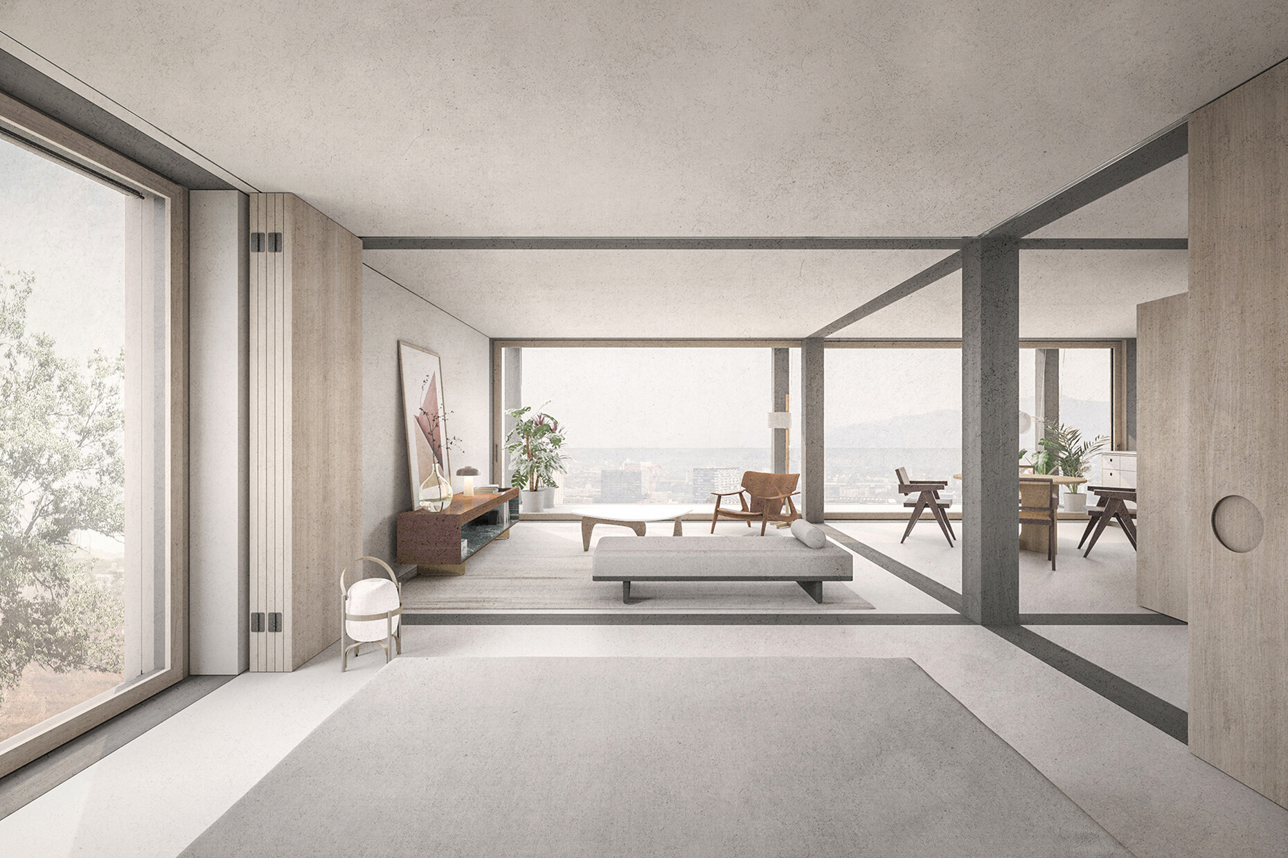 “Various scenarios are conceivable for the occupants. The apartment can easily accommodate two people. There is space for having guests over, or for working from home,” explains Marco Zbinden. To make certain the generous view of the city’s skyscrapers is not ruined by furniture on a balcony, they opted instead for a canopy. Via floor-to-ceiling windows the apartments open up to their surroundings. Think Architecture is also responsible for the interior fit-out. The doors and kitchen furniture are in oak, while the construction itself is in spruce. Lime plaster for the walls and mineral floor coverings create a healthy room climate.