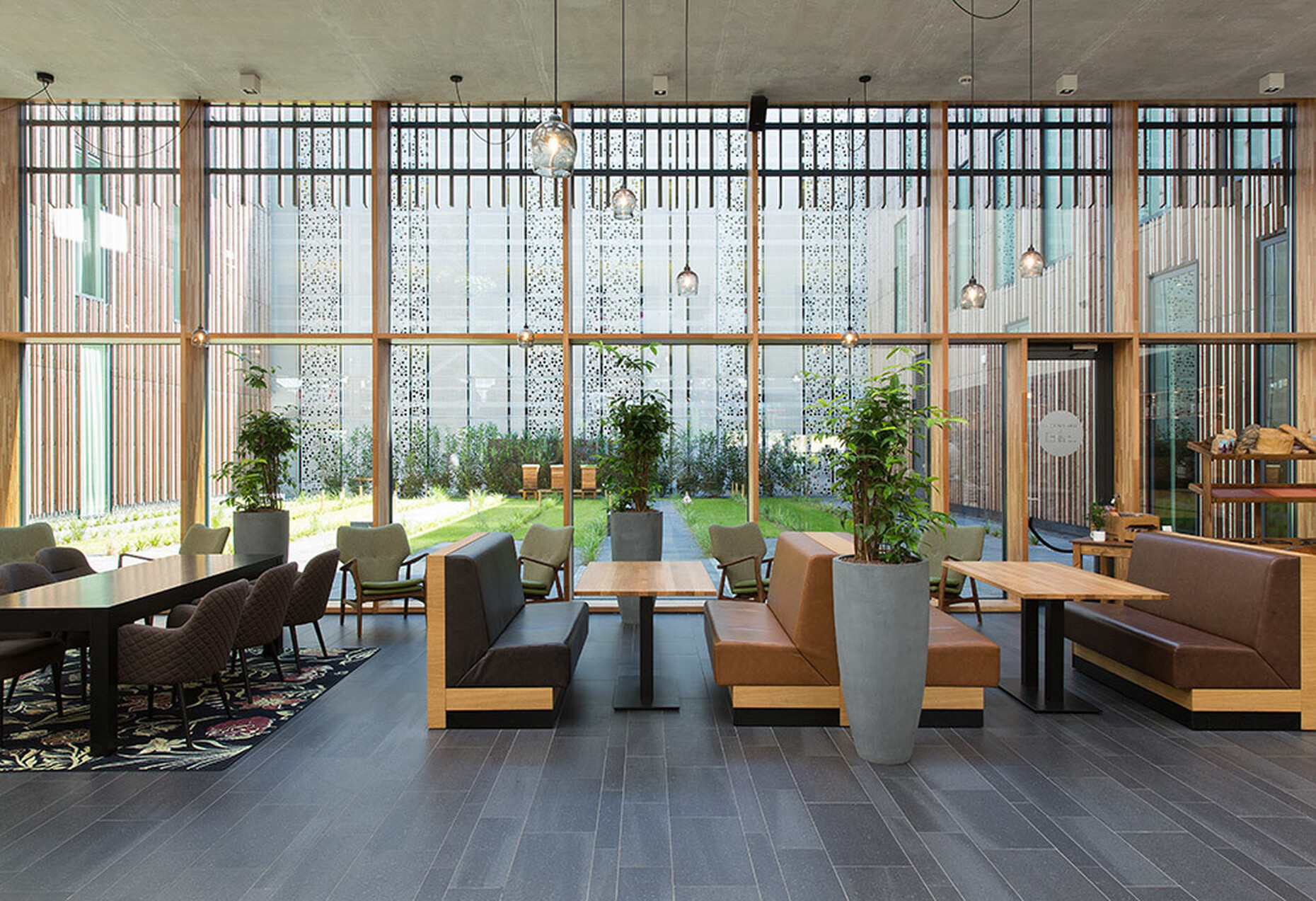 One of the latest projects in which Mosa tiles are a major feature is Novotel Hoofddorp. Here the studio Mulderblauw architecten from Zoeterwoude used tiles both for the facade and the hotel’s interior. The tiles are produced in line with the Cradle to Cradle principle, meaning they are 100 percent recyclable. The goal in championing sustainable production is to take a responsible approach to using natural resources. This also means that the tiles, made of clay or sand, contain no toxins such as lead, mercury or cadmium, which can harm the environment and human health. Even when in use for a long time, the tiles do not release any toxins into the environment. As such, Mosa is the first manufacturer of ceramic tiles worldwide to produce tiles that bear Cradle to Cradle certification.