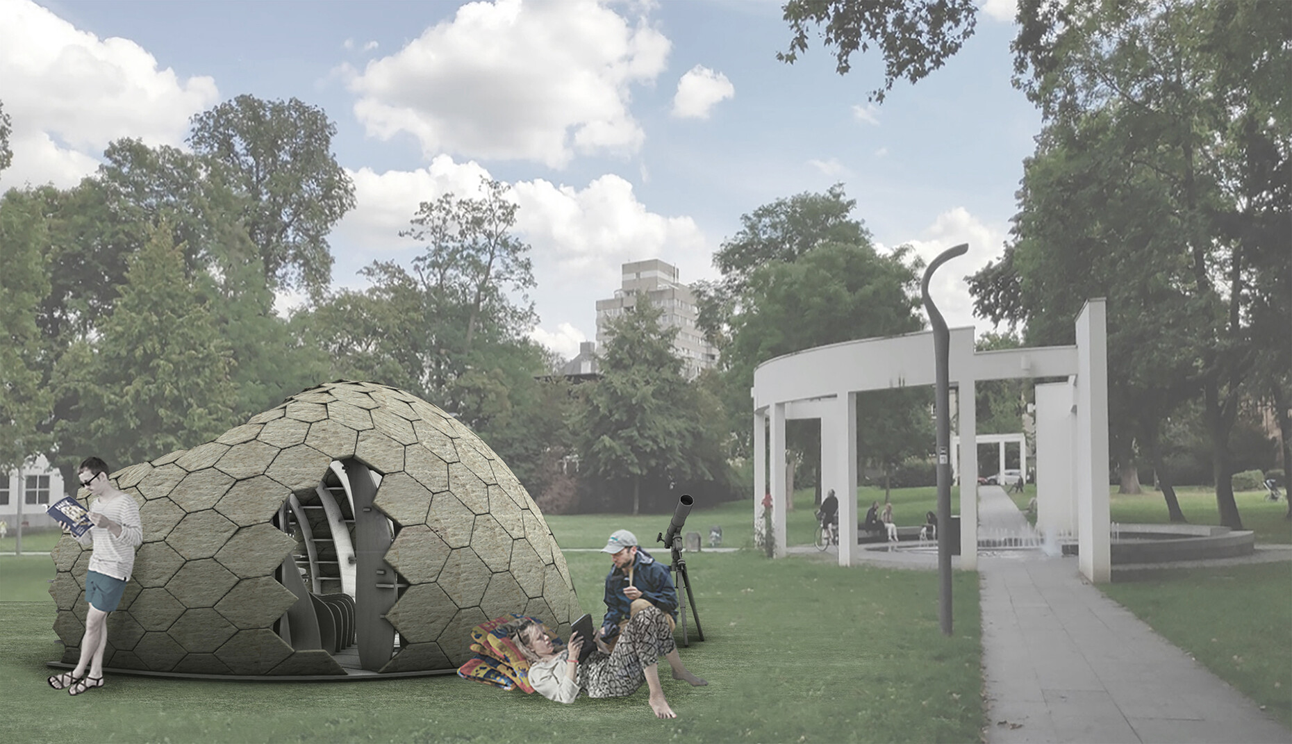 The inhabitable sculpture made of fungal material "MY-CO SPACE" by the artist collective MY-CO-X questions what and how we can learn from fungal cultures, networks and architectures. The interdisciplinary collective work thus enables an artistic-scientific discussion about a future social significance of fungi for the creation of places and spaces. "vista 3,5°" temporarily changes an already existing work and thus creates new perspectives: Beatrice Bianchini and Robin Wenzel from the Hochschule für Gestaltung Offenbach am Main and Andrea Strehl from the Goethe University Frankfurt am Main under the direction of Prof. Matthias Wagner K from the Museum Angewandte Kunst will extend the fountain designed by Richard Meier in the Metzlerpark of the Museum Angewandte Kunst with a wooden installation and other materials. The theoretical concept of the lecture series thus materalises as a decentralised discourse. At the same time, "vista 3,5°" creates space for the creates space for the accompanying series of events tinyMONDAYS, which will offer a cross-generational dialogue on meaningful living and visions of the future and thus promote interdisciplinary exchange on issues of sustainability of alternative living and living spaces.