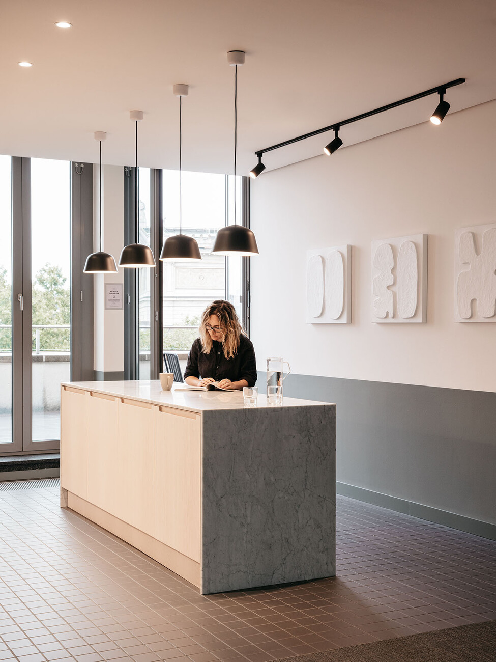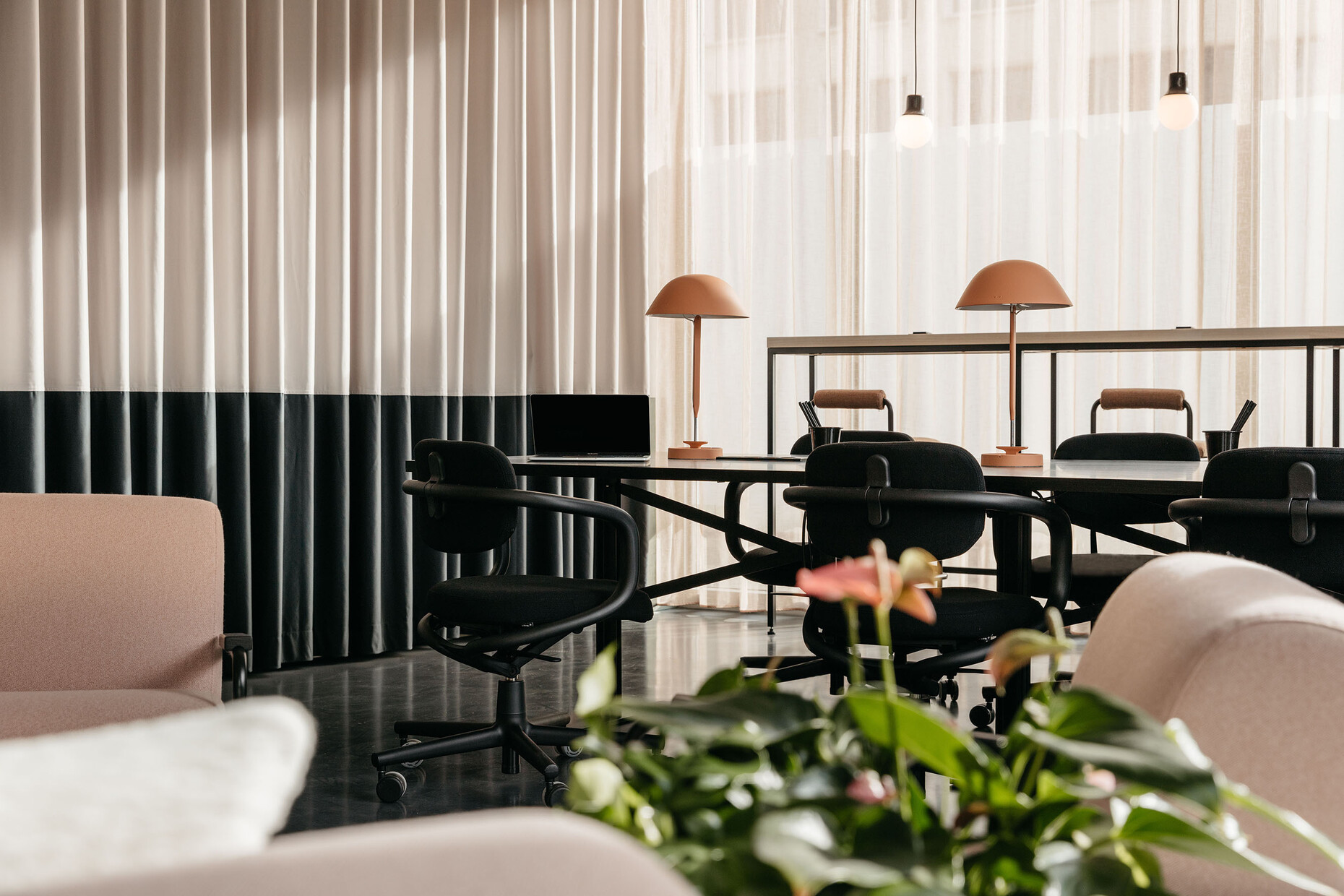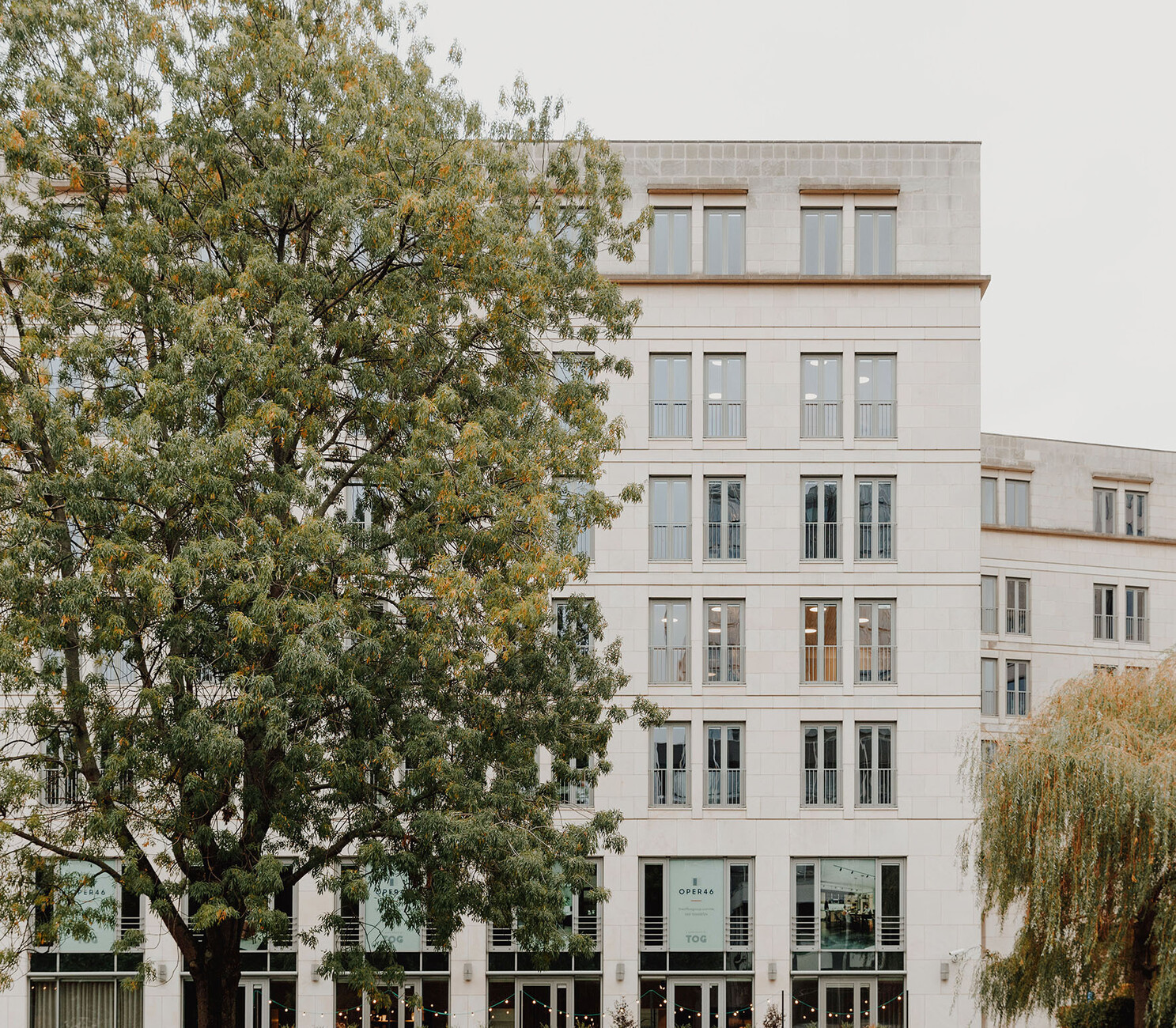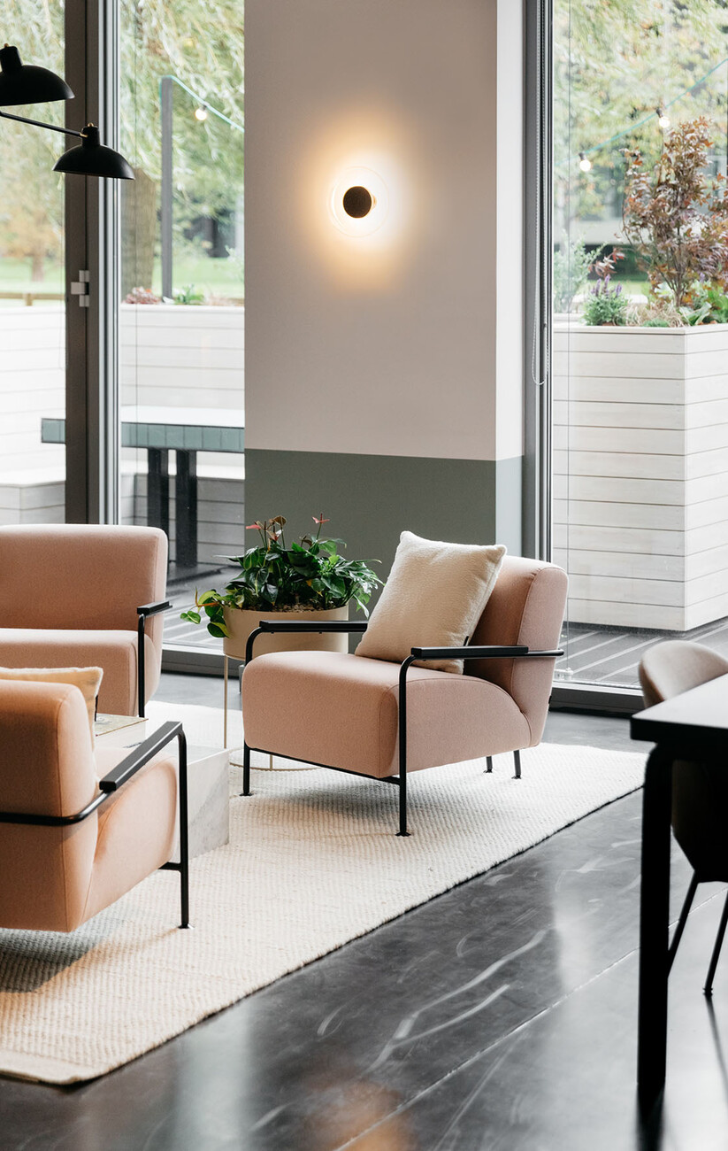 TOG’s new location in Frankfurt which the provider of flex offices recently opened strikes one as bright and inviting. Its name “Oper46” is already a clear indication of its central and exclusive location next to the Alte Oper concert hall, rebuilt in a neo-Renaissance style, and Rothschildpark. Together with London architecture practice dMFK Architects, TOG has infused new life into the office building at 46 Bockenheimer Anlage: Plans were needed for a total of 6,700 square meters spread across six floors. In order to underscore the expansiveness of the area some walls in the spacious entrance lobby were removed; from here your gaze can now travel as far as the nearby park. A reception of greenish black marble makes for an eye-catching element in the entrance area that otherwise (like most of the rest of the interior design) boasts in light, neutral tones in nude and sand shades, complemented by objects and wall colors in matt black and dark gray. Moreover, custom-made fitted wooden sections provide somewhat secluded seating and a pleasant warm touch. Similarly, for the central atrium dMFK Architects rely on light wood and have created a so-called “breakout-area” styled on the Spanish Steps, a central meeting place lit by daylight entering the glass roof and with direct access to the other floors. Thanks to greenery installed at the edges of some of the steps the space also has an invigorating air about it.