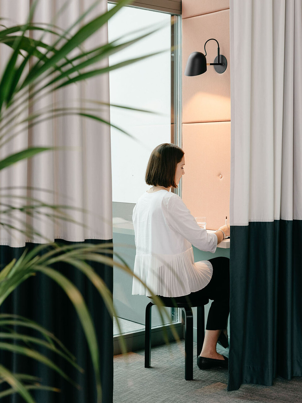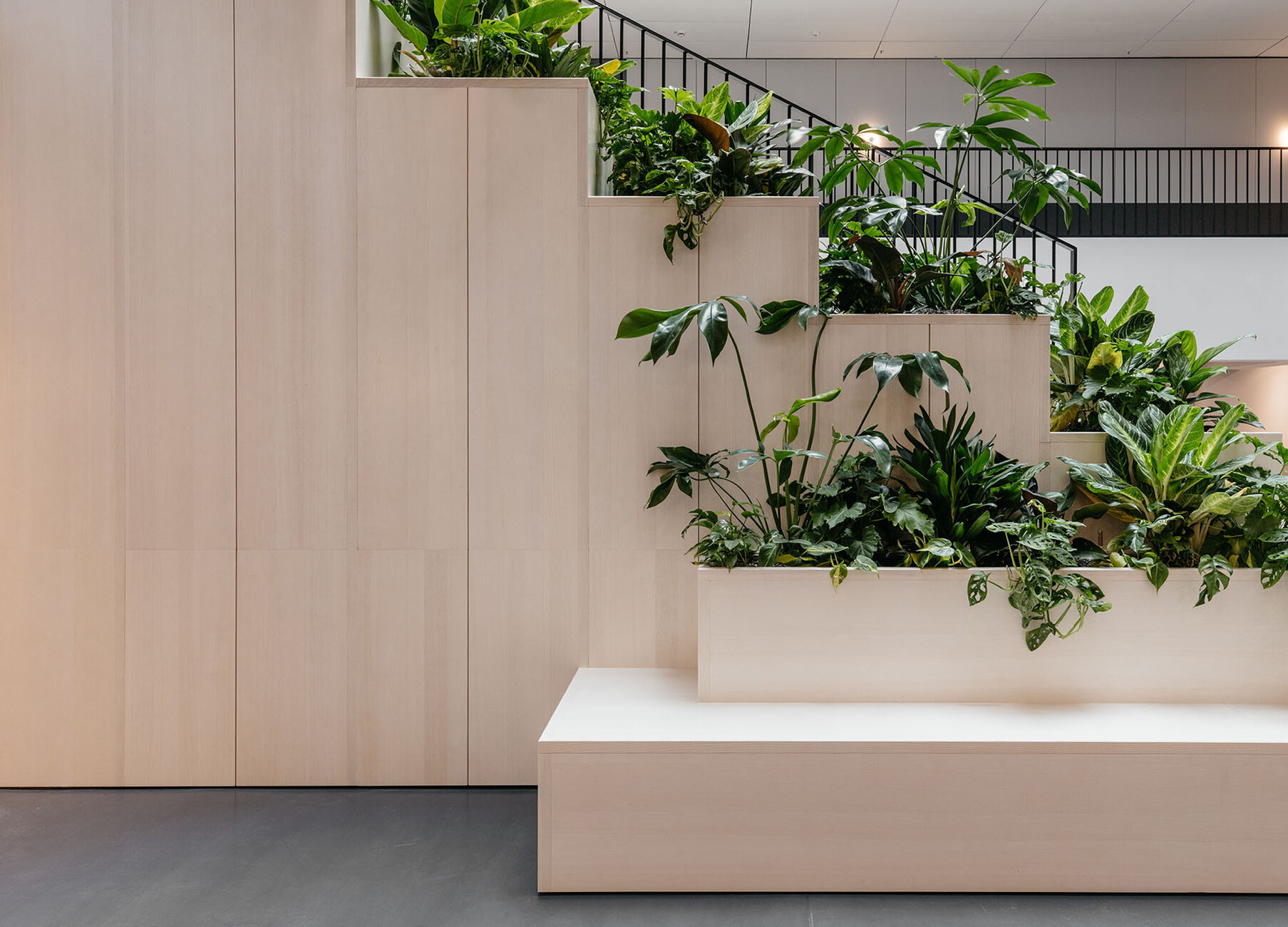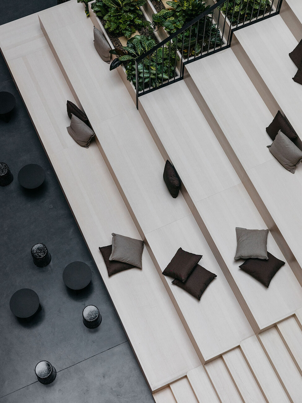 TOG’s new location in Frankfurt which the provider of flex offices recently opened strikes one as bright and inviting. Its name “Oper46” is already a clear indication of its central and exclusive location next to the Alte Oper concert hall, rebuilt in a neo-Renaissance style, and Rothschildpark. Together with London architecture practice dMFK Architects, TOG has infused new life into the office building at 46 Bockenheimer Anlage: Plans were needed for a total of 6,700 square meters spread across six floors. In order to underscore the expansiveness of the area some walls in the spacious entrance lobby were removed; from here your gaze can now travel as far as the nearby park. A reception of greenish black marble makes for an eye-catching element in the entrance area that otherwise (like most of the rest of the interior design) boasts in light, neutral tones in nude and sand shades, complemented by objects and wall colors in matt black and dark gray. Moreover, custom-made fitted wooden sections provide somewhat secluded seating and a pleasant warm touch. Similarly, for the central atrium dMFK Architects rely on light wood and have created a so-called “breakout-area” styled on the Spanish Steps, a central meeting place lit by daylight entering the glass roof and with direct access to the other floors. Thanks to greenery installed at the edges of some of the steps the space also has an invigorating air about it.