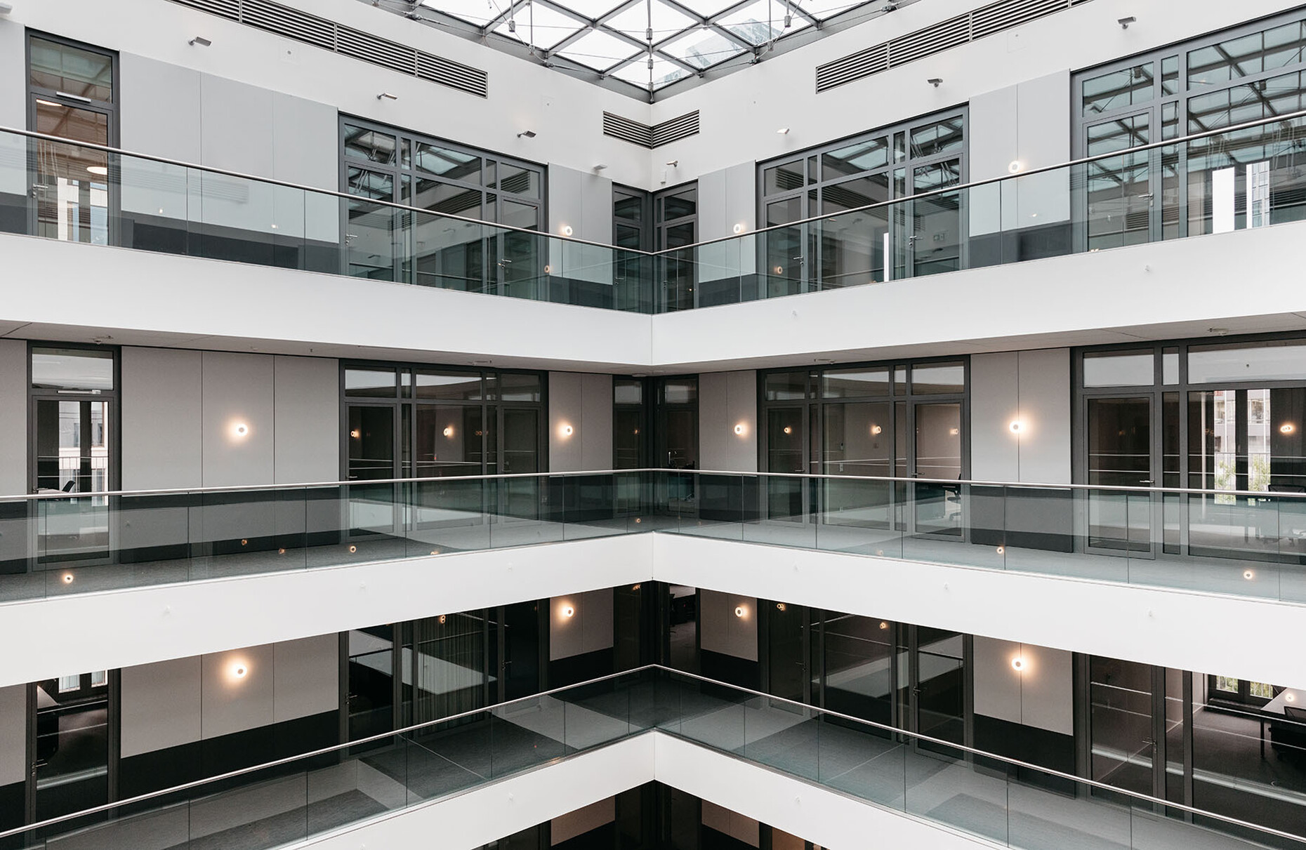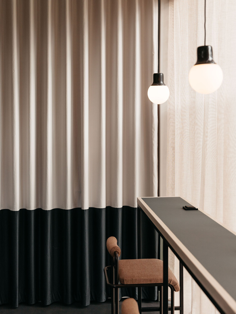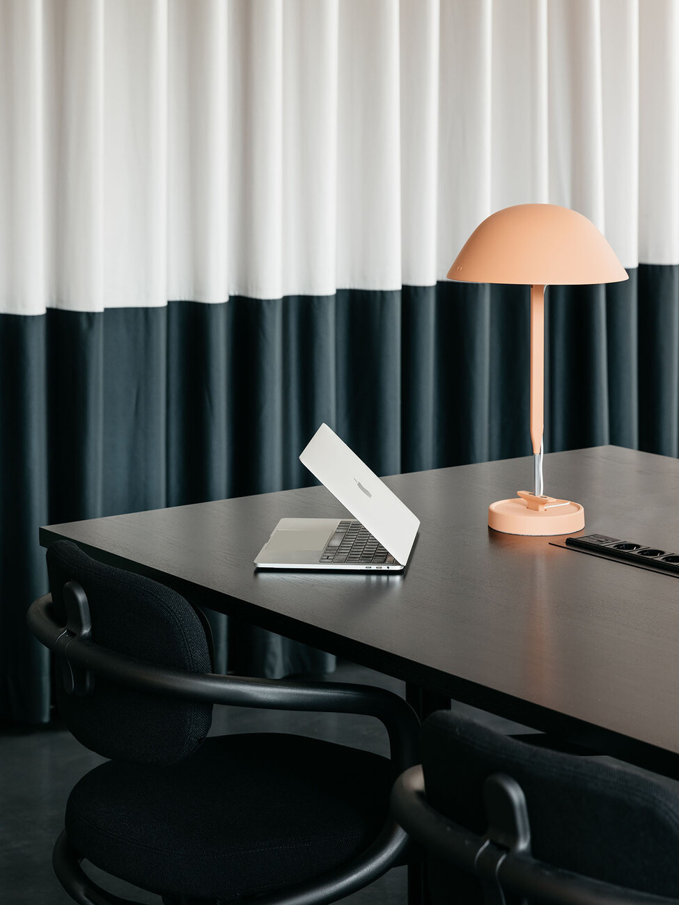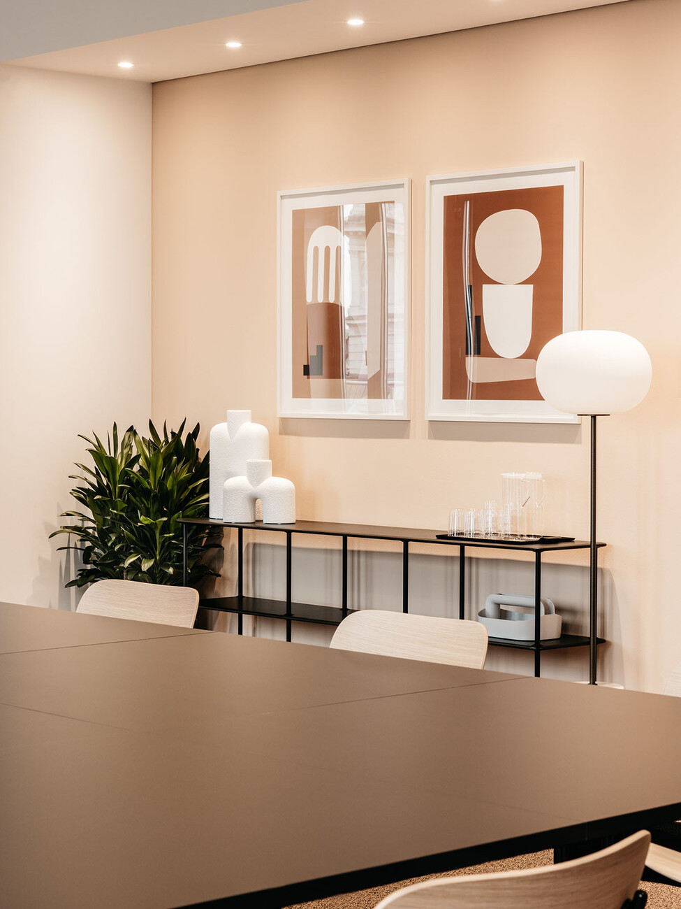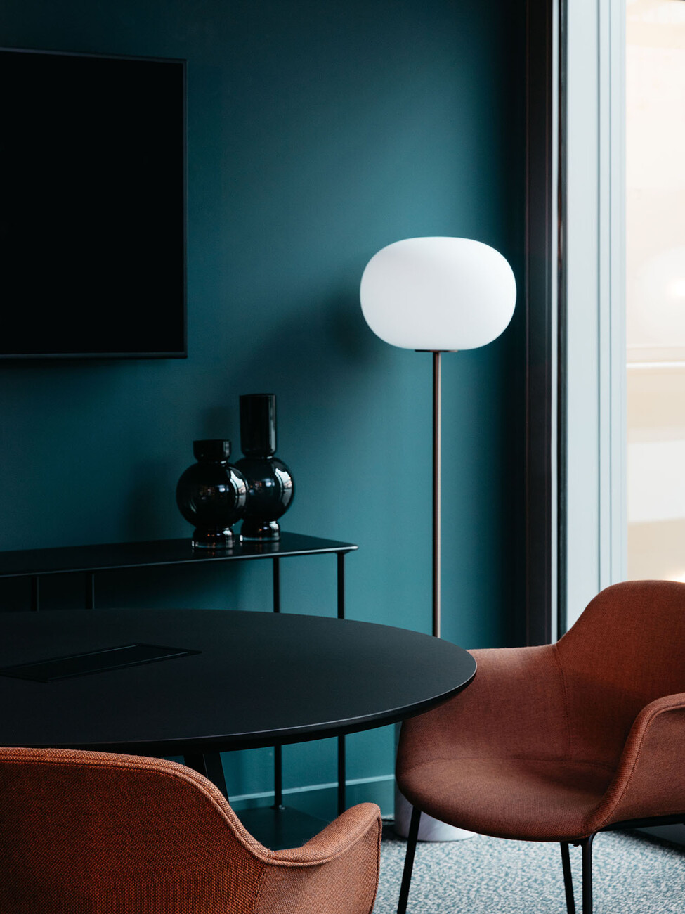 If you sit down briefly on the stairs and look upwards then the stories that extend up around the atrium stand out for their clear lines: White panels, glass, handrails and railings of black and silver metal. Those familiar with the previous projects and the loungey atmosphere of TOG might be somewhat surprised. “The design was not meant to be overly playful, but in keeping with Frankfurt/Main, sophisticated, grown-up and cool,” explain Charlie Green and Olly Olsen, who founded TOG in 2003. It is part of TOG’s concept for design-oriented, flexible workspaces to adapt the design of its co-working offices to the respective character of the city. The interior only becomes more intensive in color and materiality in the meeting rooms, each of which is styled differently and feature the shades deep petrol, subtle terracotta and rich burgundy. In the co-working spaces and in the private offices you can take a seat on office chairs by Vitra or in the conference area inspect the new chair by Norm Architects that was purpose-designed for the project. With an ergonomically shaped backrest of solid wood and black tubular steel it ideally reflects the intensive contrasts of the light and dark surface that alternate throughout the entire interior.