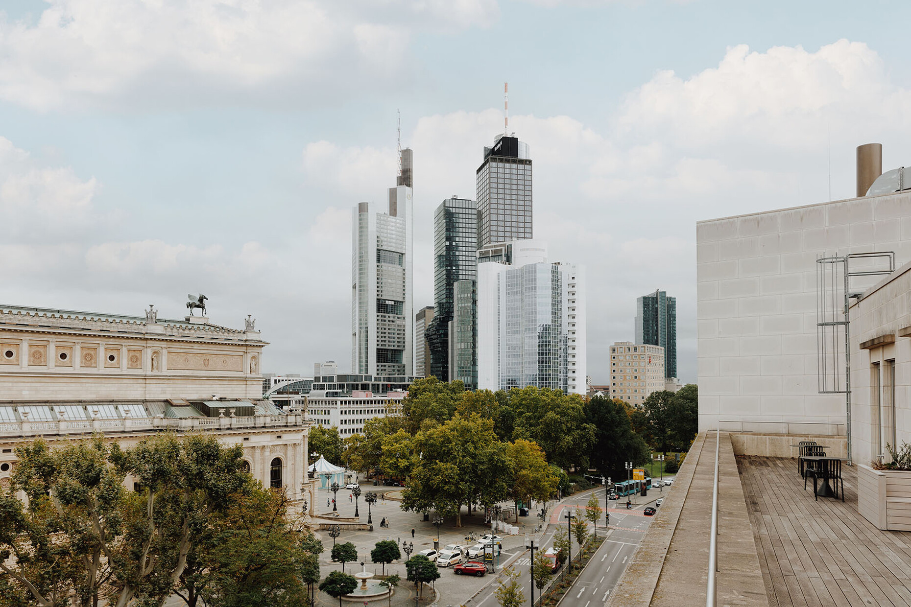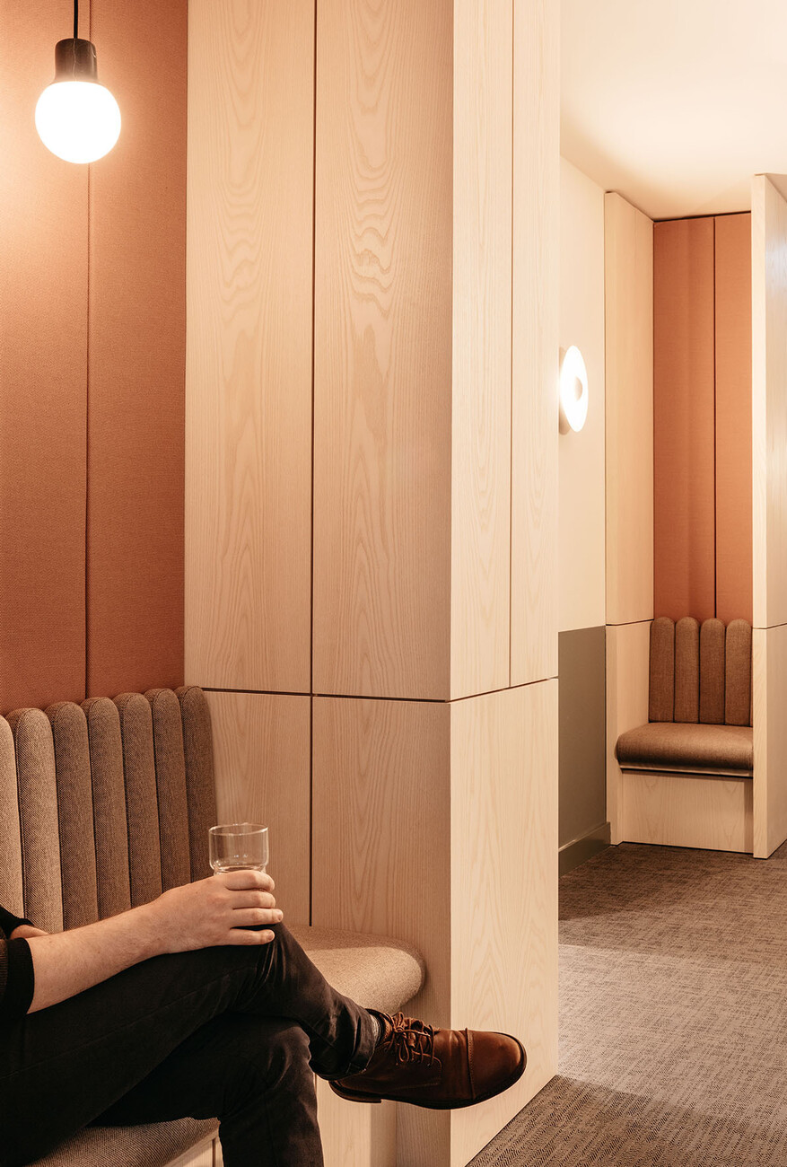 Indeed, there is a focus on furniture and accessories by Nordic manufacturers in TOG Oper46, be it Gubi, HAY or Kvadrat. The latter, for example, supplied the acoustic panels that, complemented by numerous curtains, make for pleasant room acoustics and occasionally also serve as subtle partitions for the numerous solo workspaces. Other partitions are provided by glass doors and opaque acrylic glass panels that structure the spaces yet also help to retain their bright and open look. A special highlight awaits guests on the uppermost floor: The spacious roof terrace provides ample seating for a meeting in the fresh air along with a magnificent panoramic view of the nearby skyline and the imposing building of the Alte Oper.