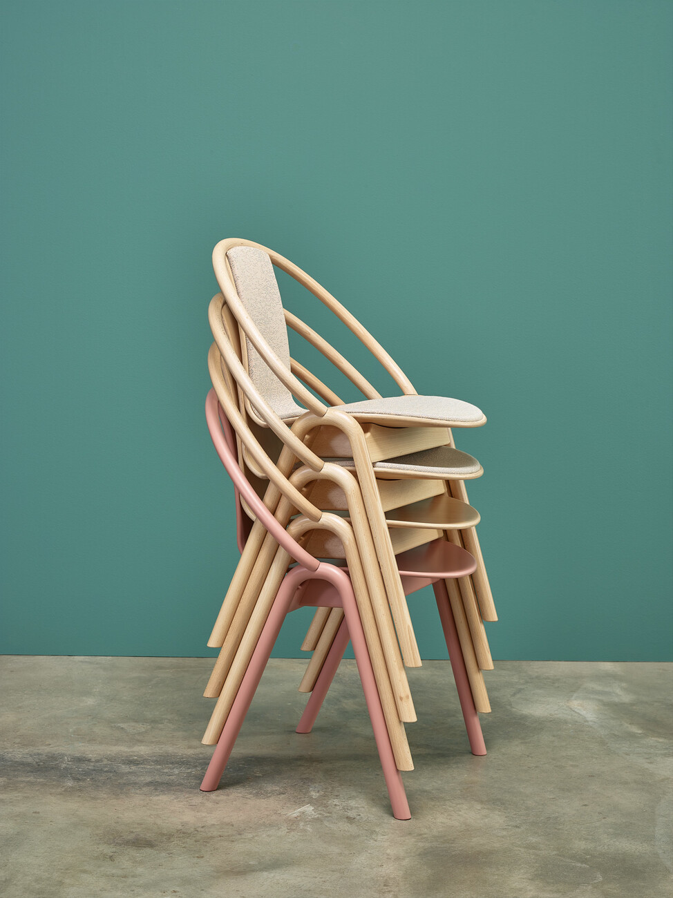 Gufler thus picks up on a formal language that is otherwise preferred in the design of metal chairs in the industrial style. His creation is certainly more comfortable, as the seat and backrest can be upholstered if required. For the bar stool, there is also a choice of two heights. The colour scheme of "Again" ranges from natural wood and nude to dark mint, violet blue and anthracite, all with a glossy finish. (am)