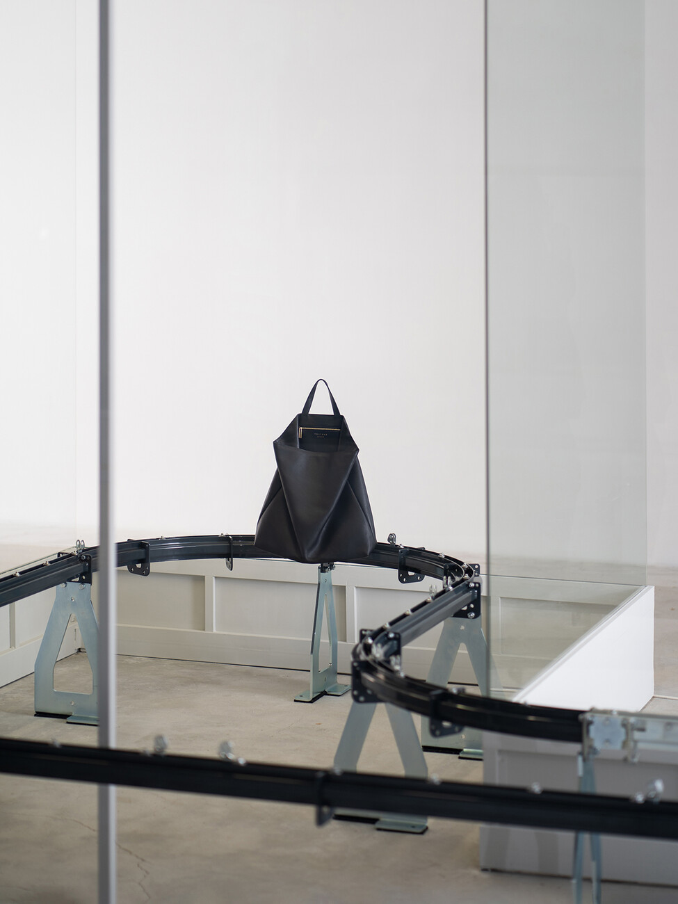 Dimitrios Tsatsas: The core element is an industrial circular conveyor, but its design is relatively atypical. It is not suspended from the ceiling, but runs about 40 centimetres above the floor. On it we have placed the bags of the collection that are most relevant to us, which are thus equal in position. Due to the endless movement of the conveyor belt, they constantly change their position, which creates a uniform overall look.