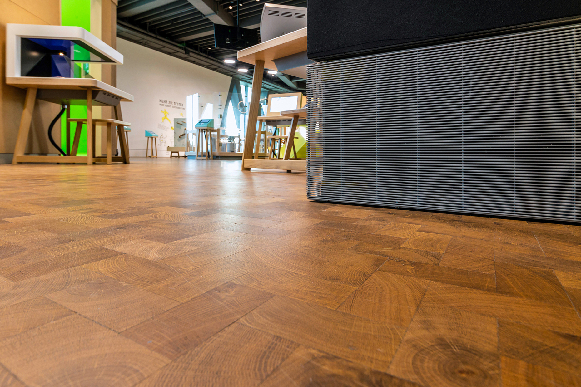 However, you need to look very carefully in order to find this cooling technology because it is perfectly integrated into the architecture, meaning that only the floor-level air vents are visible. Frameless and filigree, they can be integrated into the wall design. And thanks to the intelligent way they are linked to the lighting system, the high-performance units on the ceiling are difficult to make out. The system cannot be seen or heard and even the permanent exchange of air does not make itself felt. Moreover, if so required, the entire system can be dismantled easily.