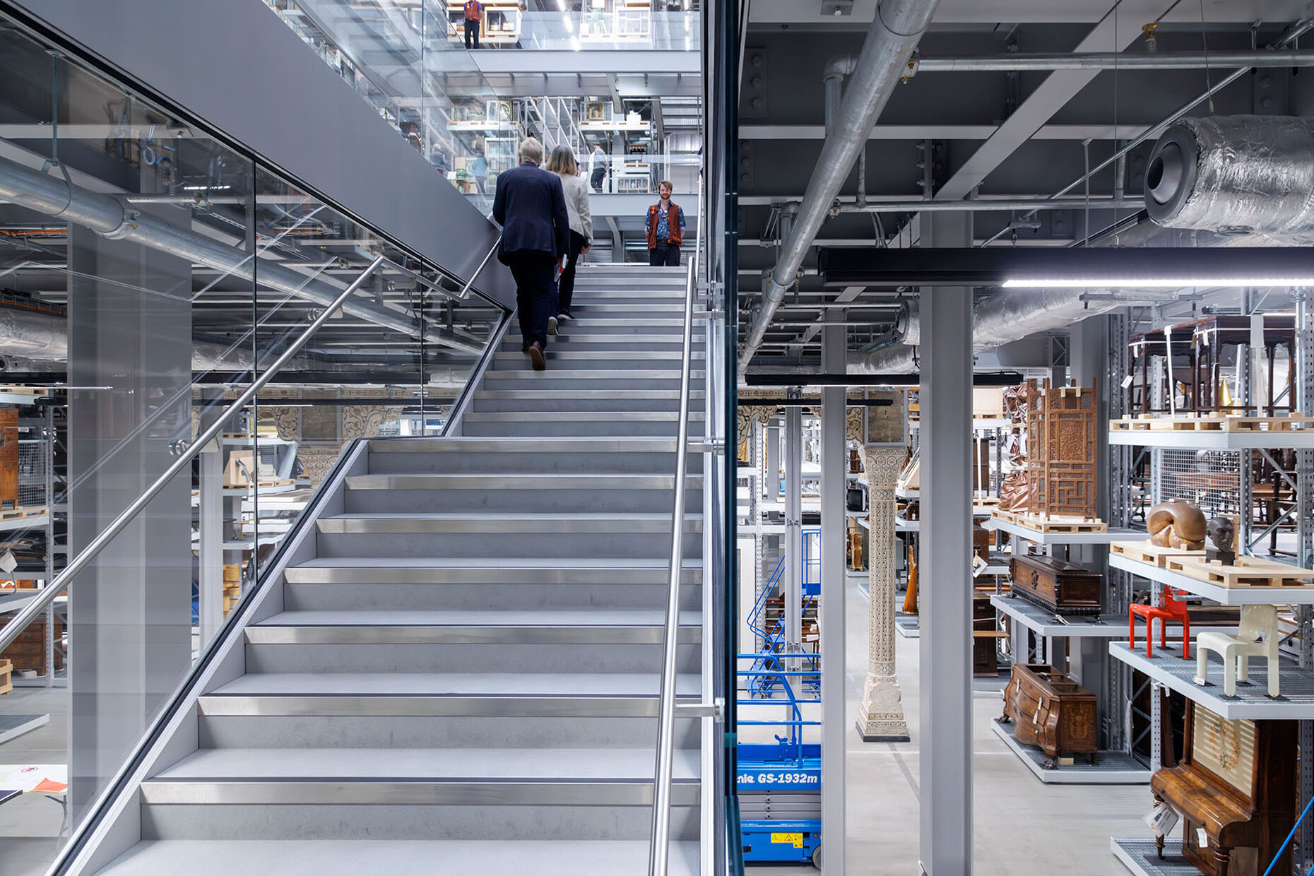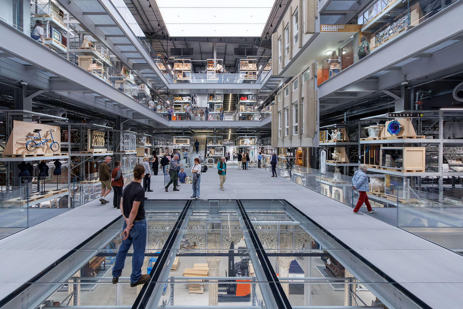 Four levels of industrial shelving fill the field of vision, a powerful LED ceiling panel stretches overhead, and a glass floor in the centre provides an unobstructed view. A kaleidoscope of objects unfolds between machines, furniture, sculptures, garments and bicycles: 350,000 exhibits are stored here, sorted according to pragmatic criteria: size, material, conservation requirements. Much remains anonymous, without text panels, only barcode tags.