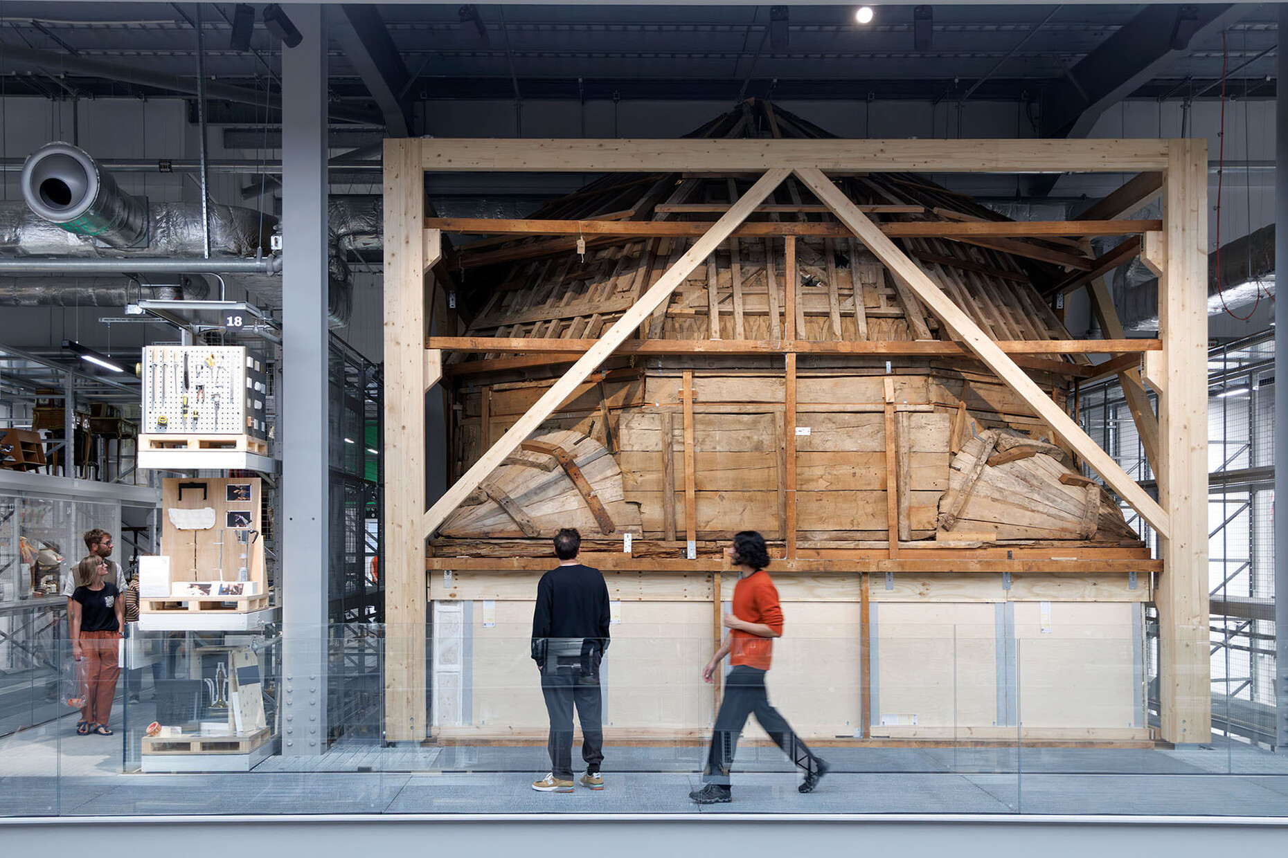 The foyer feels less like a museum and more like a start-up hub: exposed pipes, floor-to-ceiling glass walls, cast concrete surfaces, light-coloured laminates, plus a café corner and ‘creative spaces’ for workshops. What is striking is the absence of the expected: no reception desk, no shop, no museum logic. A narrow metal staircase leads upwards, through security doors with an airlock-like appearance, past narrow rows of shelves – a staged moment of compression. Then the space suddenly opens up: a 20-metre-high hall. The original building offered neither views nor natural light; it was intended for a data centre and was completely sealed. ‘Within this dense storage field, we conceptually excavated a central space,’ explains Allin. ‘The public is invited to venture deeper into the collection – moving through and among the layers of storage that define the space. By surrounding visitors in objects and extending storage in every direction, even beneath their feet, we aimed to create an immersive, three-dimensional cabinet of curiosities.’