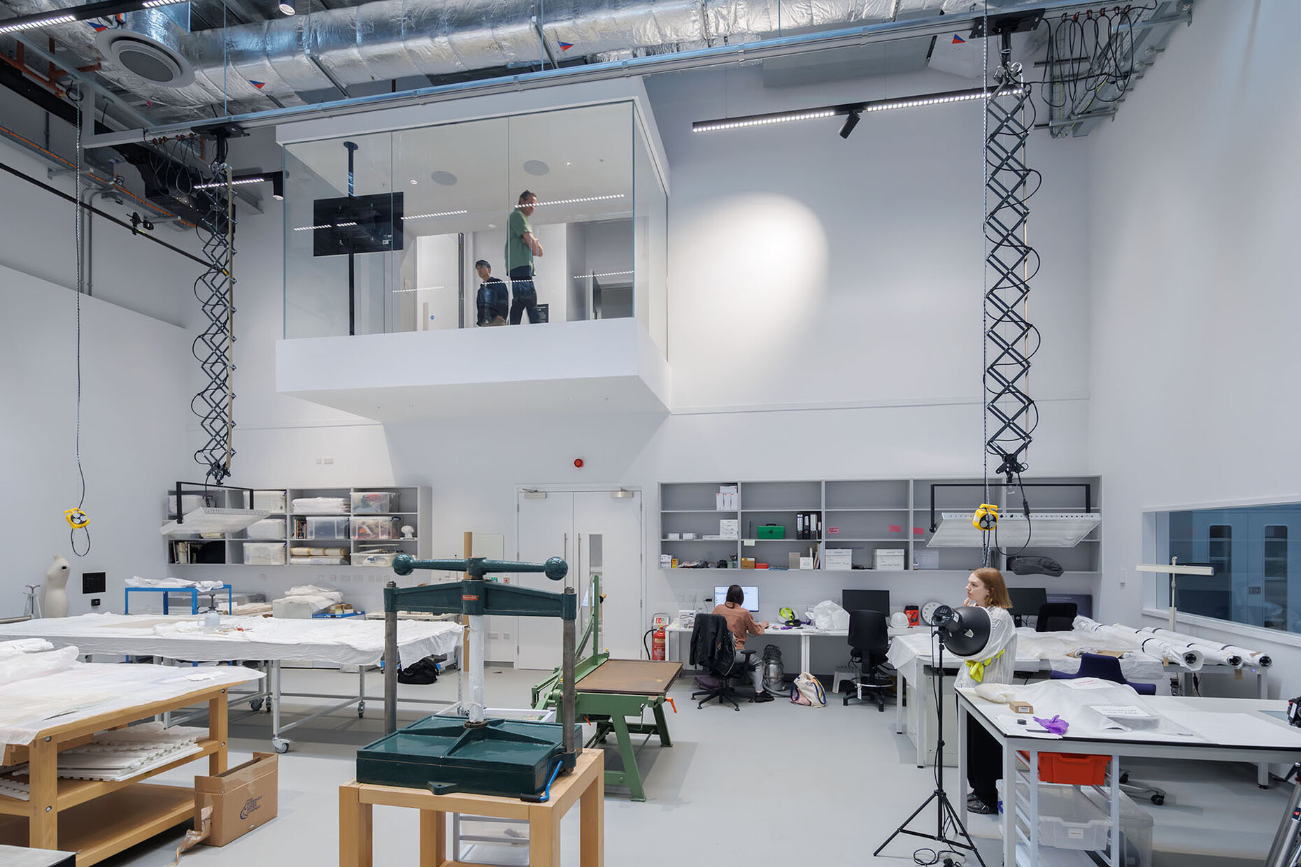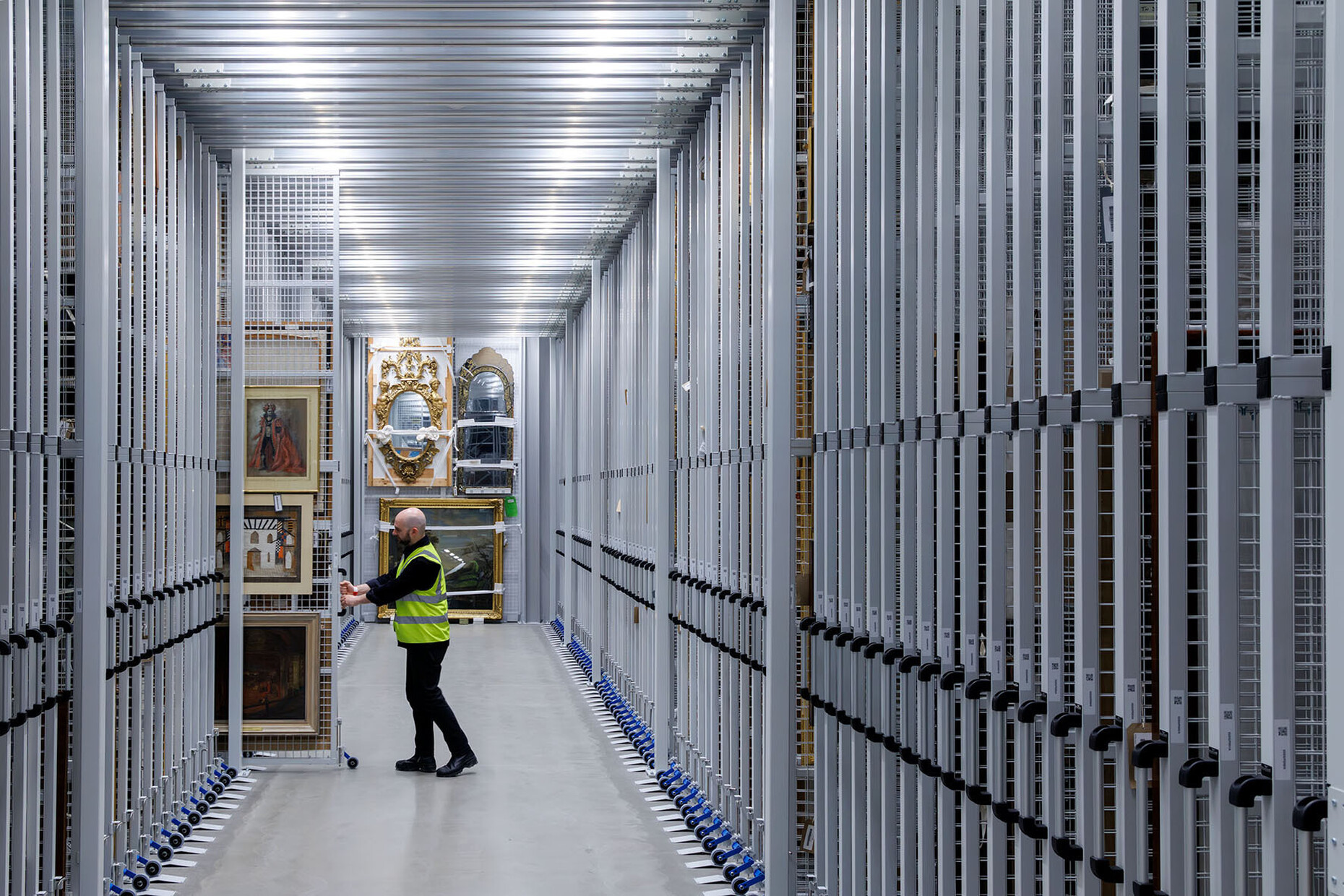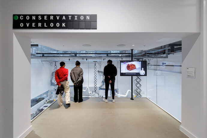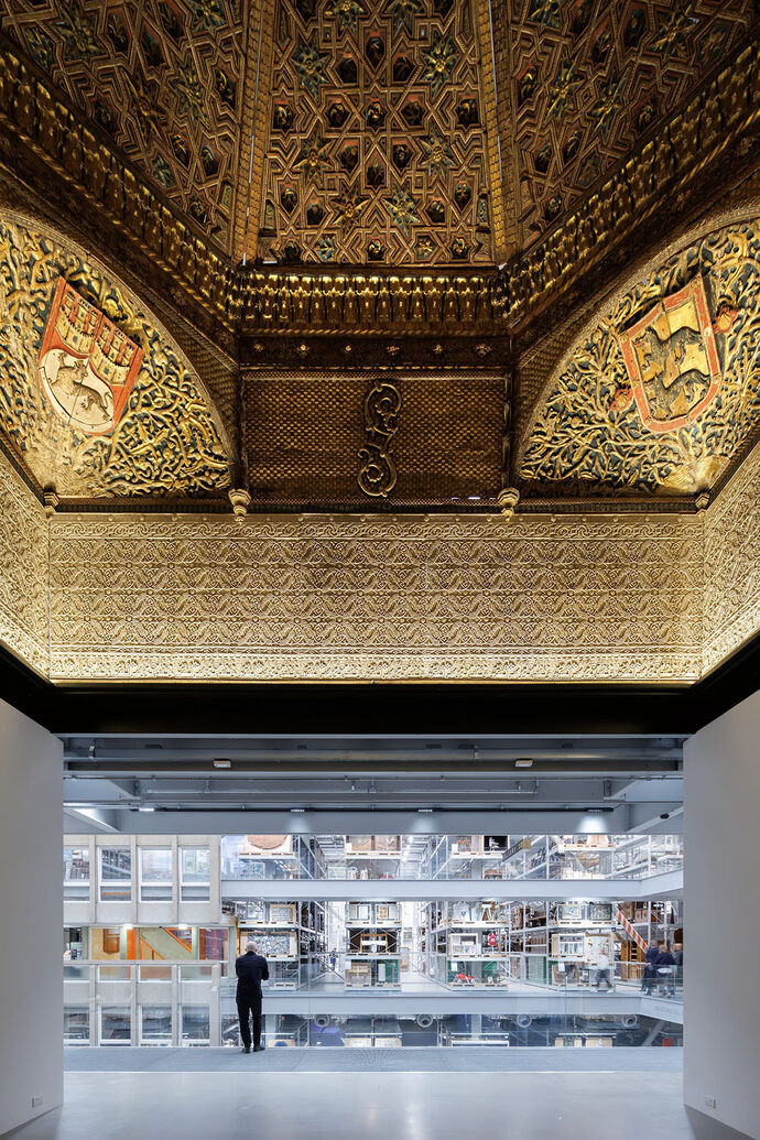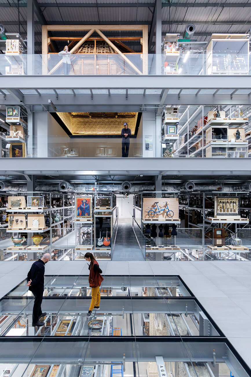 ‘The materials and atmosphere are in service of making the Storehouse efficient, flexible, and functional for the handling and storage of the V&A's collection,’ explains DS+R. ‘Yet here, the public is invited in. Instead of looking through glass at a back-of-house operation, visitors and objects occupy, share and breathe the same space. When collections staff move a heavy object with a forklift, you see and hear it; when a large artwork is photographed, you see the flash.’ In a conventional museum setting, visitors follow a predetermined path – here, they are free to wander, ask questions and even request objects from the archive for viewing. Using the ‘Order an Object’ service, available seven days a week, they can select up to five objects online in advance and view them at a specified time. The staff retrieve the pieces from the depots and present them at specially designated workstations – a radical form of accessibility that no longer treats museum collections as untouchable sanctuaries, but as objects of study. What sets the Storehouse apart is its transparency. There is no separation between the depot and the public. For example, a glass-fronted gallery allows visitors to watch the conservators at work – from a bird's eye view, so to speak, they can observe how paintings are cleaned, textiles restored and objects catalogued. These insights into the normally hidden backstage processes make the museum a place of production, not just presentation. ‘We wanted to democratise the museum,’ explains director Tristram Hunt. ‘Not just show the results of our work, but the work itself.’