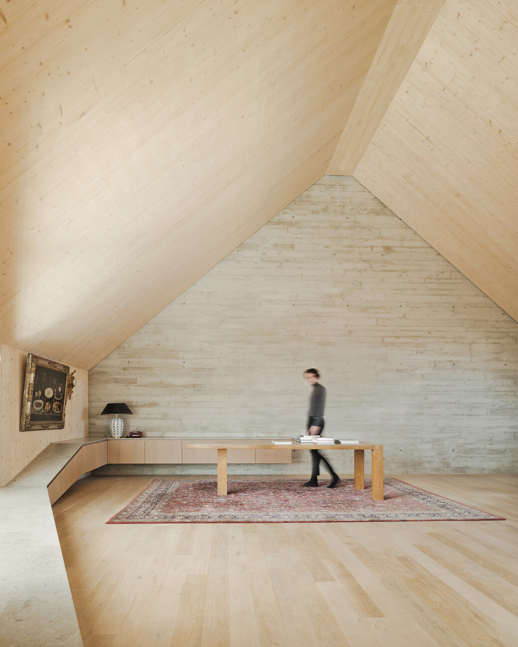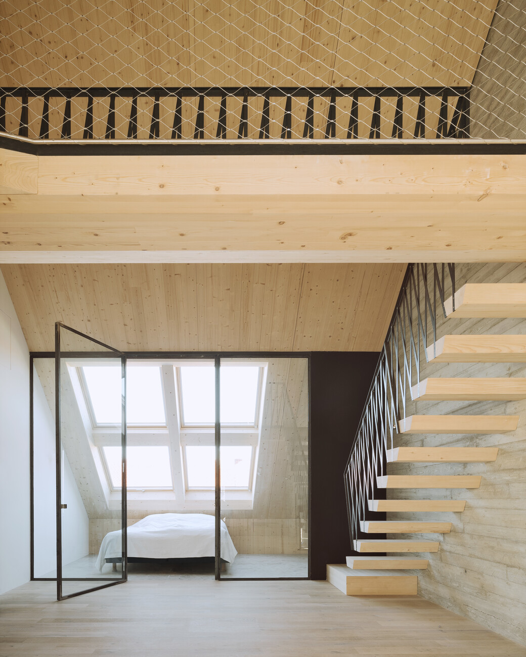 When they began their planning, the architects had to contend with the fact that the existing building’s foundations were not adequately sized to bear the additional storeys. They solved the problem by first removing the top floor of the existing structure, which had been realized in concrete. Subsequently, they added a total of three storeys to what remained of the original building – but this time relied on a solid wood construction so that the foundations were now able to carry the additional floors. That said, the timberwork is not visible from the outside as Pool Leber Architekten clad the new storeys with silver sheet steel. While facing north the extension continues the calm appearance of the old building’s facade, projections and recesses in the section facing south produce a strong rhythm. Similarly, the roof line of the new saddle roof rises and falls – a movement that is likewise taken up by the lintels and balcony parapets.
