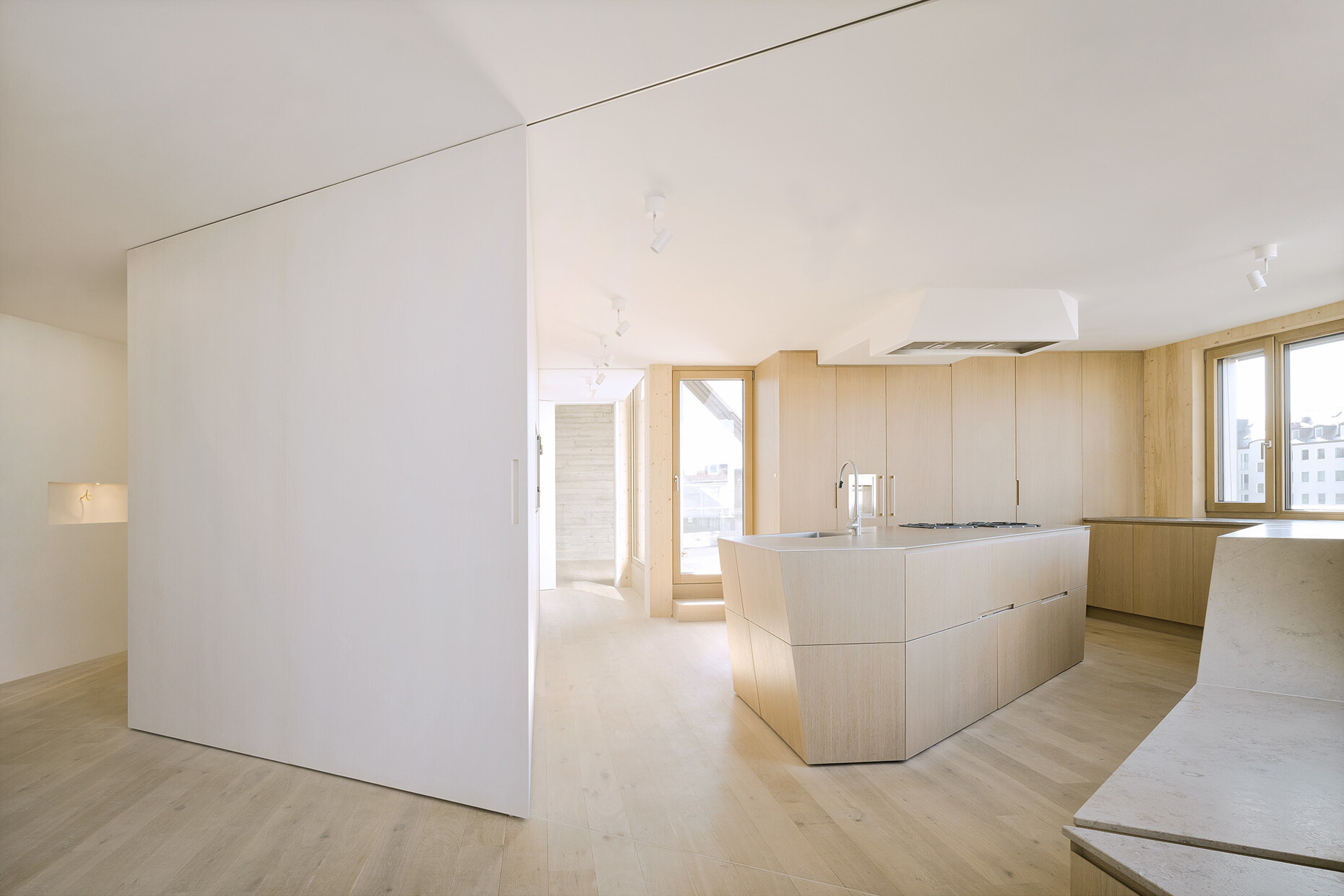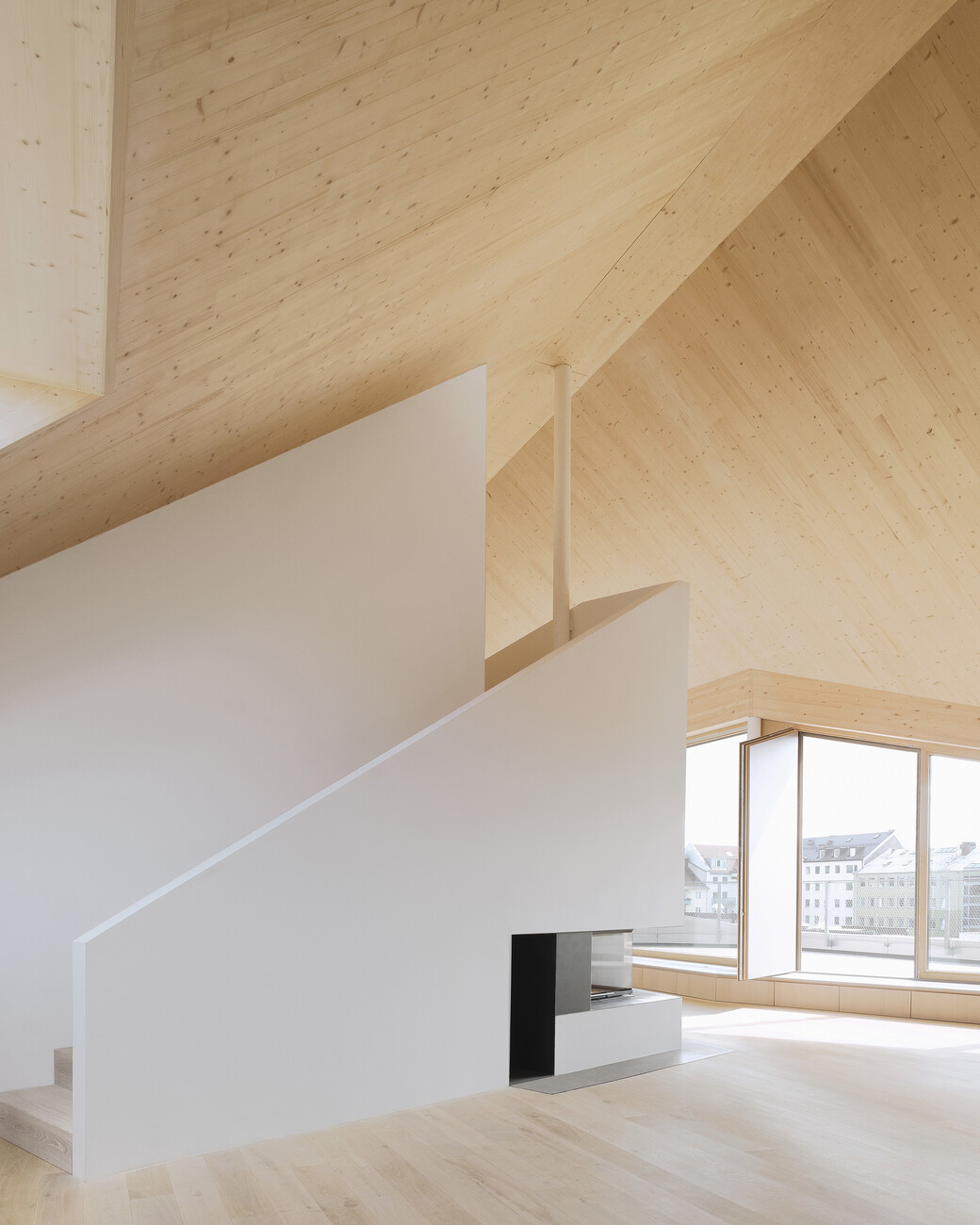 The roof windows boast integrated heat protection awning blinds and use Velux smart ventilation – electric window ventilation devices that enable a constant supply of fresh air without any heat loss. Moreover, the roof windows mean the apartment can be cross-ventilated; they also provide a second escape route for firefighters in the event of a fire and can be used by the chimney sweep.