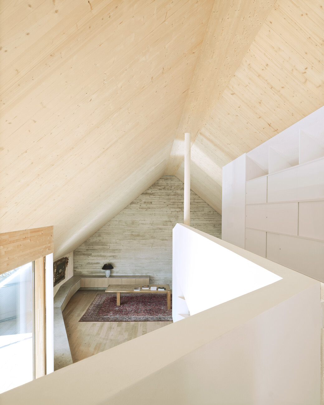 In order to provide the new apartment on the two upper floors with ample daylight the architects not only had floor-to-ceiling panoramic windows installed facing south but also opened up the roof area on the north and south sides by adding windows, namely Velux roof windows. The width of the latter corresponds to that of the sheet steep strips that were used as roof cladding. Facing in two different directions the windows create a great many different light moods in the large main room. From the gallery level above this there is also a wonderful view from the roof window extending across the inner city as far as the Alps. On the north side, by contrast, the Velux windows afford a view of the famous Olympic stadium.