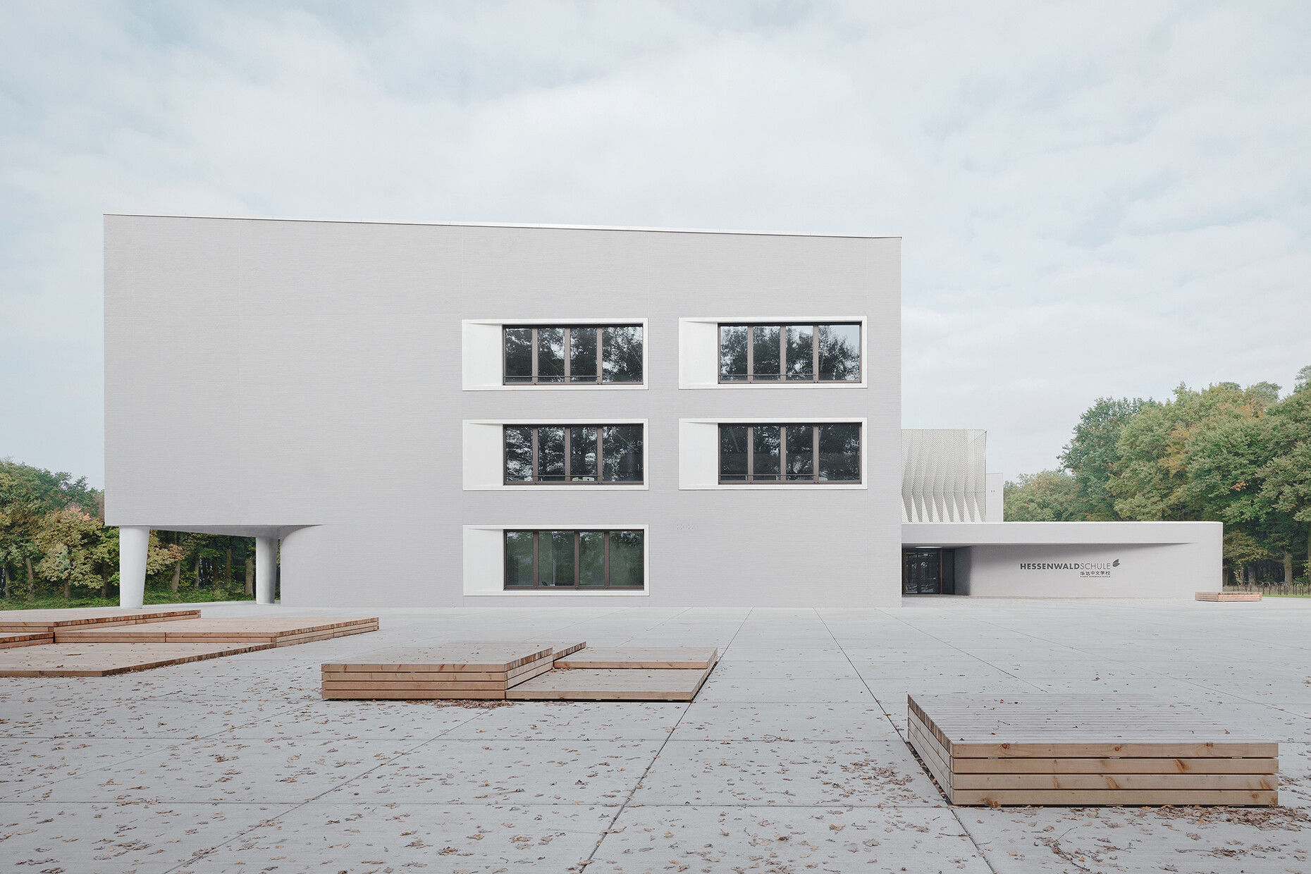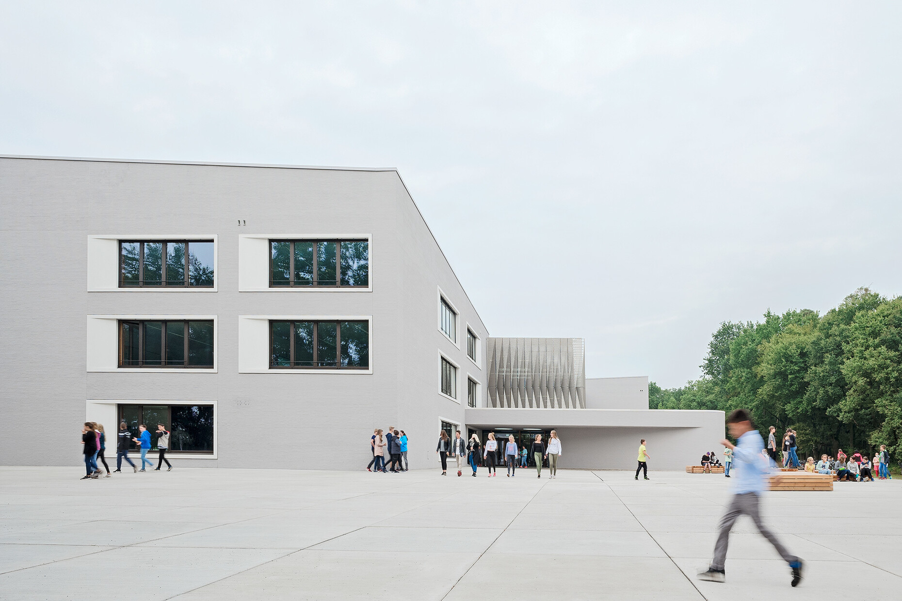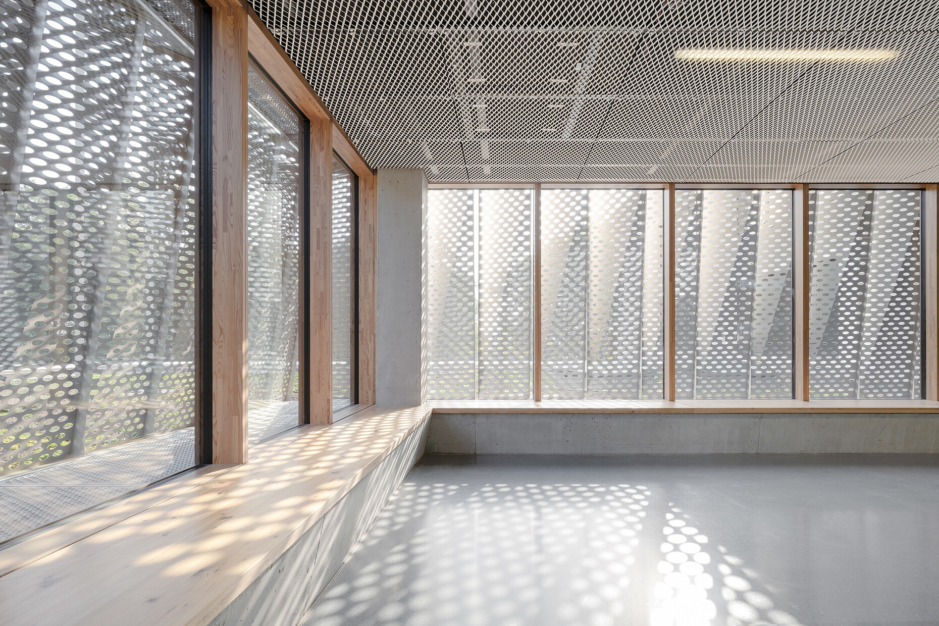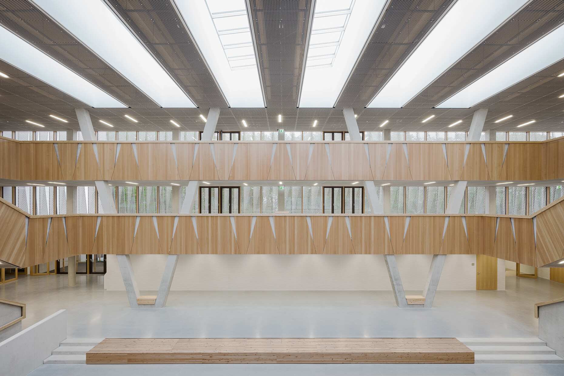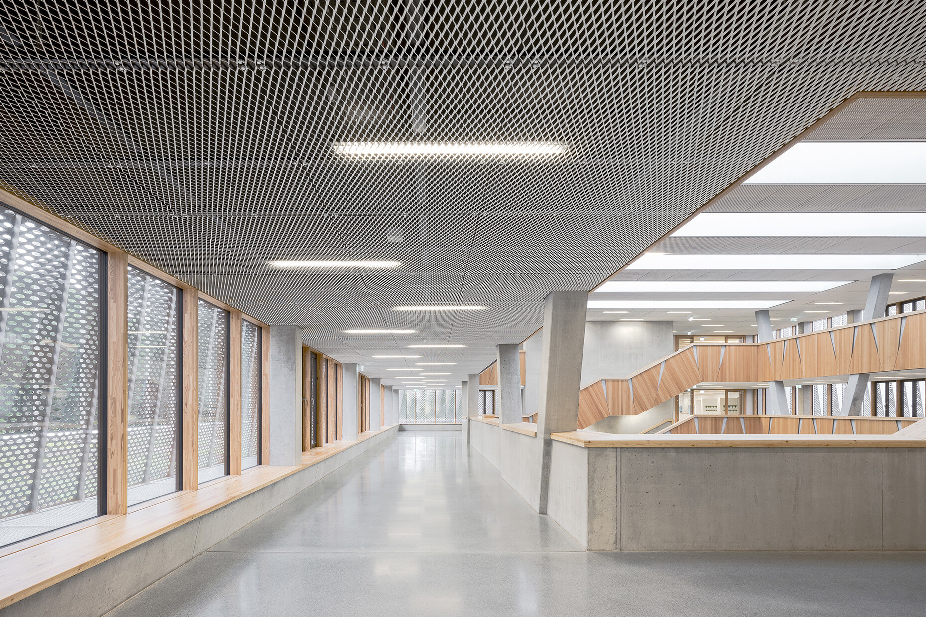 The newbuild for the Hessenwaldschule by wulf architekten stands in a clearing at the edge of woodlands, near to the locality of Gräfenhausen, a district of Weiterstadt. The architects subtly reference the school’s location in the forest when designing the large atrium which forms the building’s central point – the perforated sun blinds in front of the windows allow the light to create the kind of mood that might be expected under a tree canopy. The wooden cladding on the walls, banisters and gallery banisters reinforce the impression of being out in the open, even inside the building.