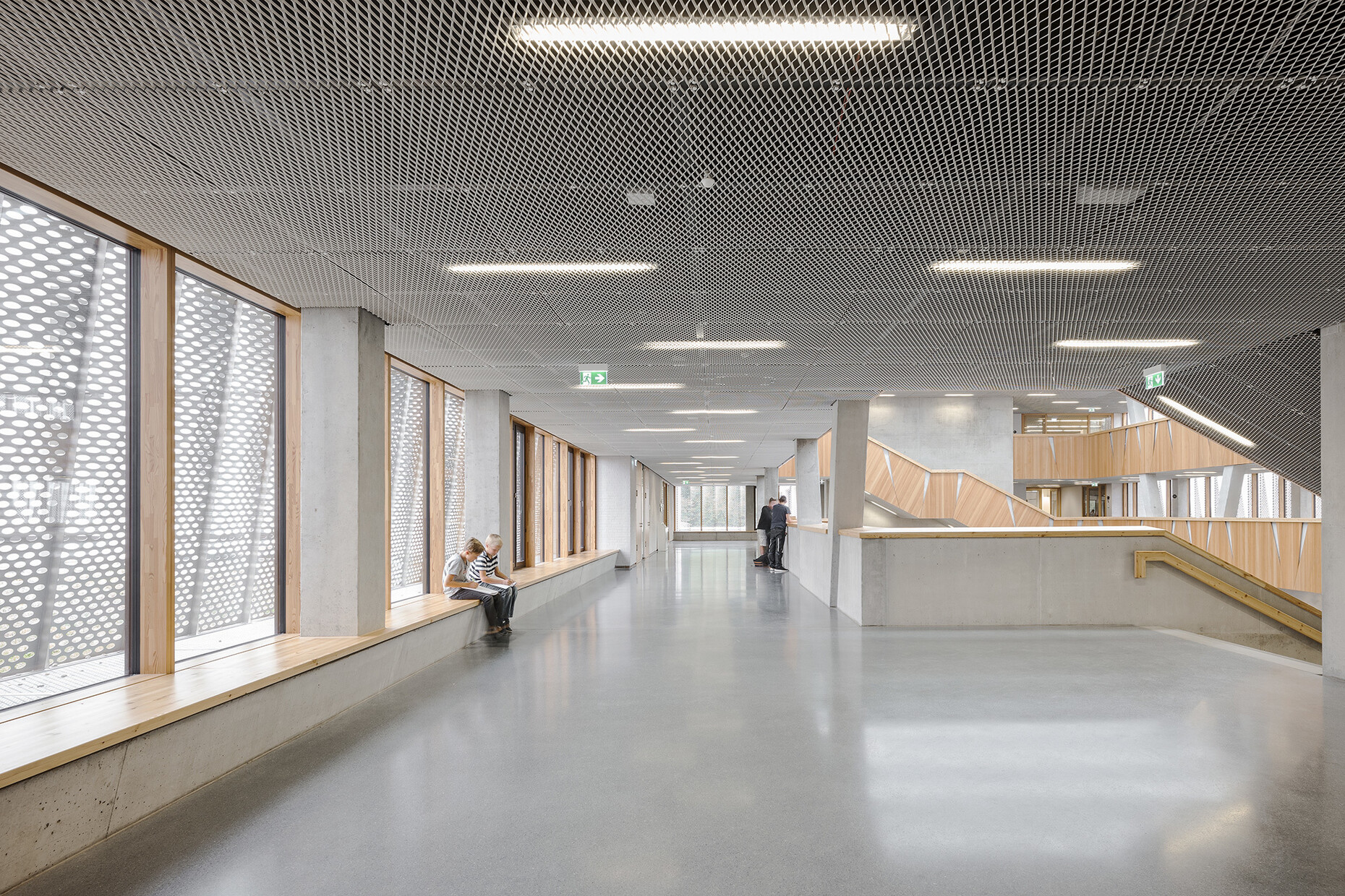 For an optimum supply of daylight to the center of the atrium there are six ribbon windows integrated into the ceiling. For these, Velux Modular Skylights were used. The diffuse light provided by the skylights act as a counterbalance to the ever-changing light that filters through the sun blinds from the side to the balconies. Moreover, the embrasures of the light shafts have been painted white, thus serving as reflectors whose light surfaces interrupt the atrium’s expanded metal ceiling. Last but not least, the Velux Modular Skylights represent an important part of the Hessenwaldschule’s energy concept. During the winter, the air in the atrium is heated by means of the large panes of glass in the roof and can then be relayed to the adjacent parts of the building. During the summer, the warm air can escape through the ribbon glazing.