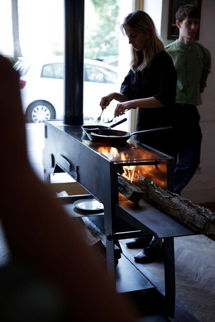 One of these projects of Edition 2023 is A+++ by Johanna Seelemann with Florin Varga of Pyrarium on the Danube Canal. Here in the stove manufactory with its own workshop, the German designer, who studied in Reykjavik and Eindhoven and has worked on projects with the Italian design studio Formafantasma, is dedicated to fire, its history and how to use it as efficiently as possible. "We thought about a possibility that goes beyond heating with fire and developed a fireplace that is heated with wood and can be used for cooking," says Johanna Seelemann. "The path to this object brought us into a dialogue about the use of biomass, but also about how the use of fire is often seen as inefficient and unhealthy. But if we look back in history, fire was used far more efficiently than we can today with new technology. Fire was used in many ways: for cooking, heating water, washing clothes, lighting, keeping food warm or heating. Biomass was also used differently in the past, not only by cutting down trees, but perhaps only by taking branches, which kept the tree alive. We wanted to incorporate and show all this in our project." The object was designed in a minimalist way, conceived to accommodate long branches and adapted as best as possible to today's efficiency standards in terms of materials and technology.