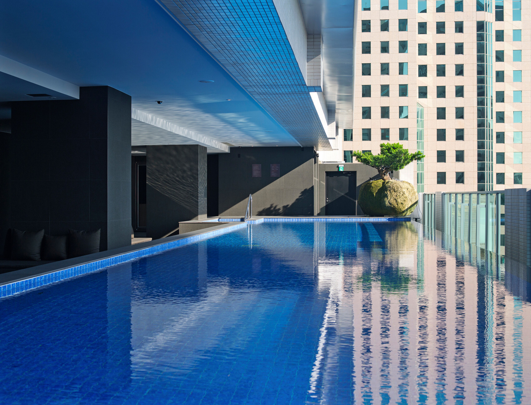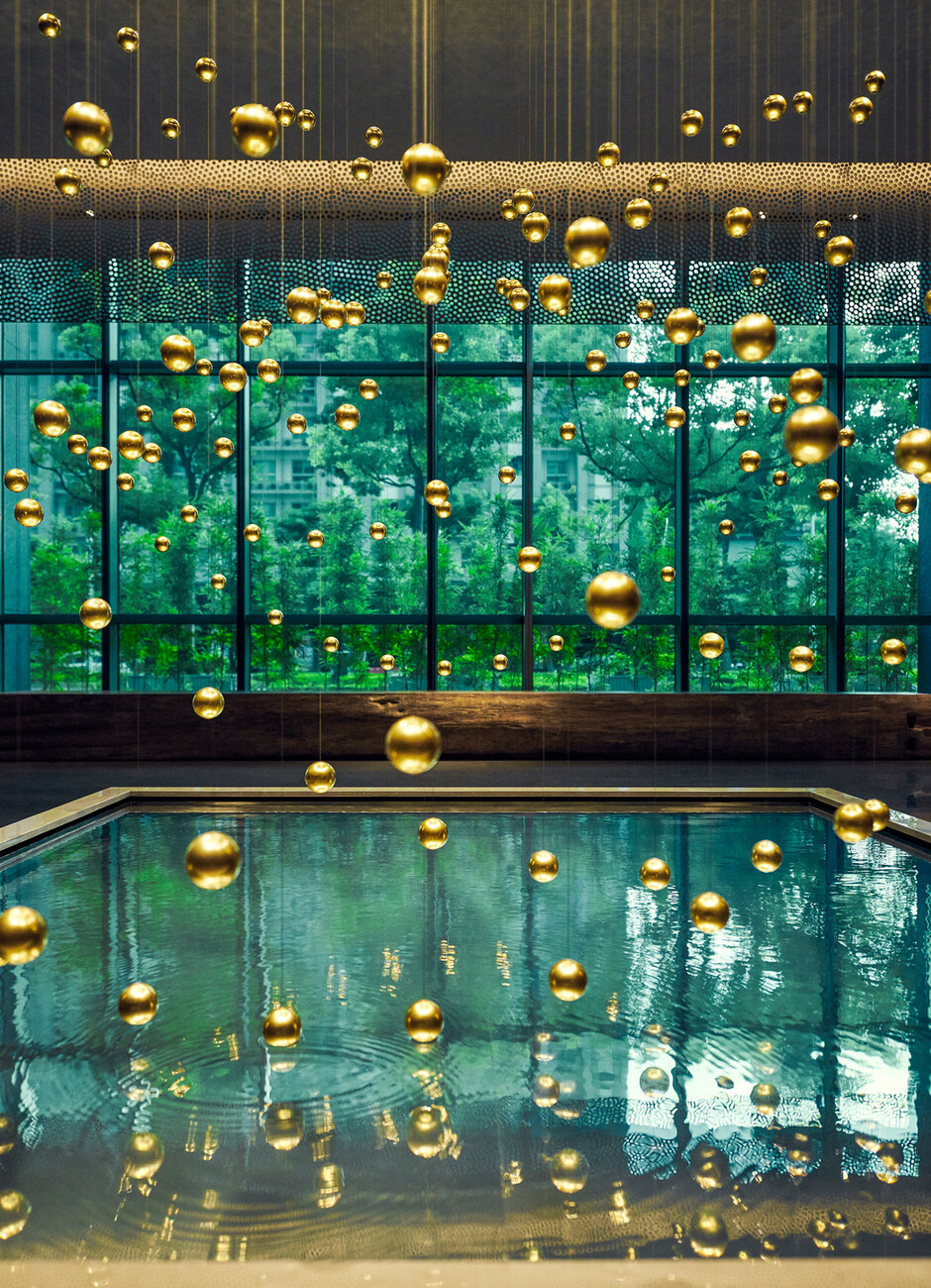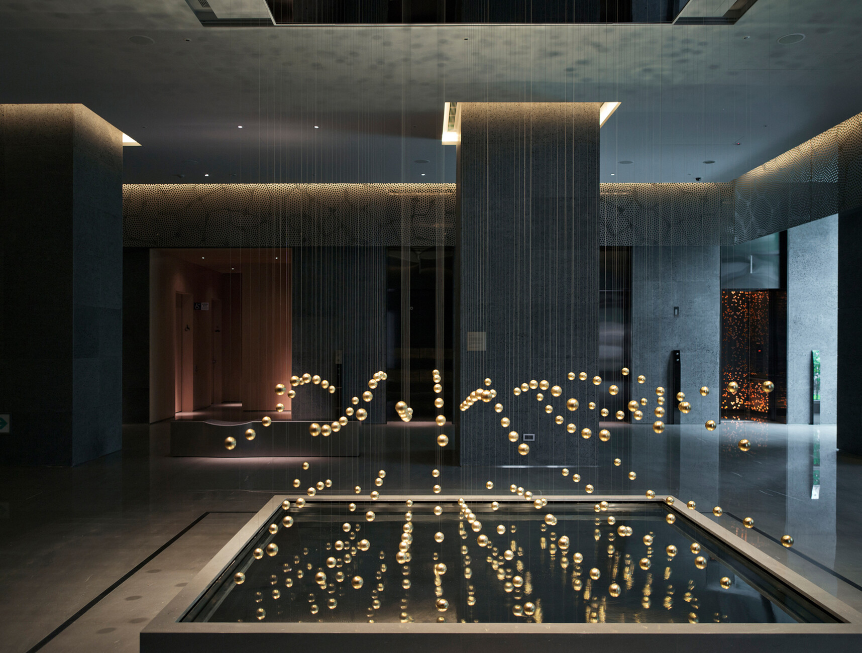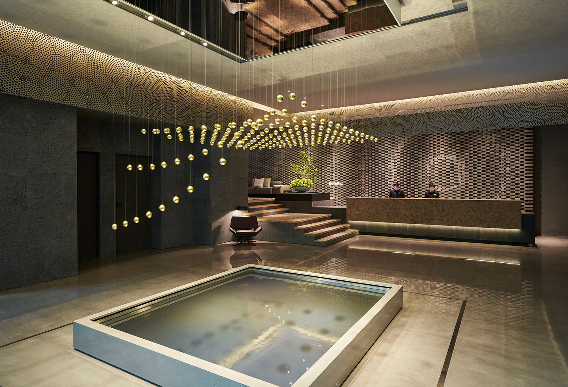 The “The Silks Club” hotel in Taiwan aspires to offer its guests a “getaway in style”. And to this end the luxury hotel located in Koahsiung has set itself the highest of standards. True to the motto “only the best can make every expectation a reality” the concept by CT Design + PU Architecture Association strives for perfection down to the last detail. Even in the entrance hall, visitors encounter the elements of life: light, air and water, namely in the shape of an elaborate kinetic installation German design agency Art+Com, which hovers between a square water basin on the floor and a mirror on the ceiling. Indirect light makes for a soft, calm atmosphere that ensures everyday hustle-and-bustle is left outside when the door closes.