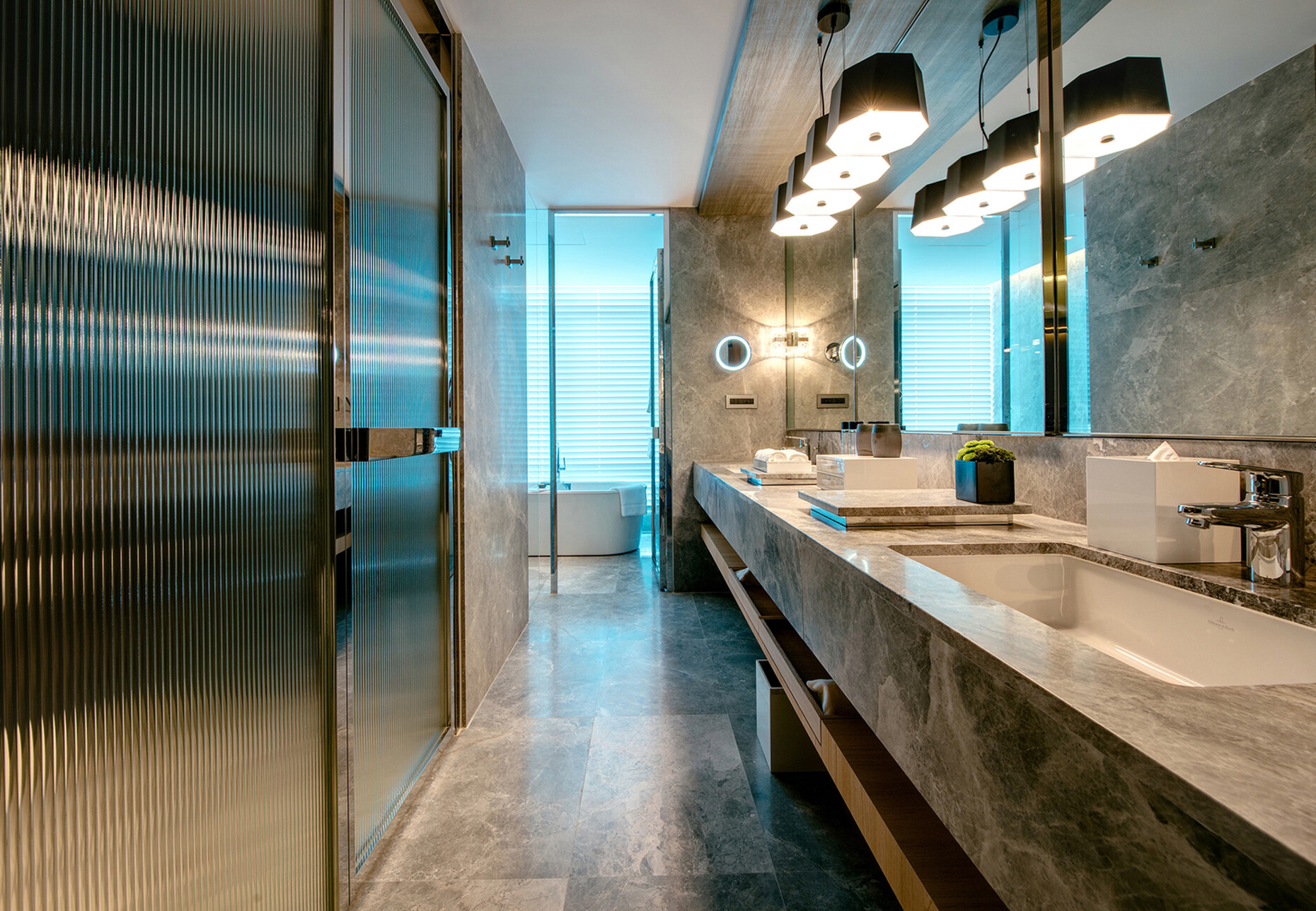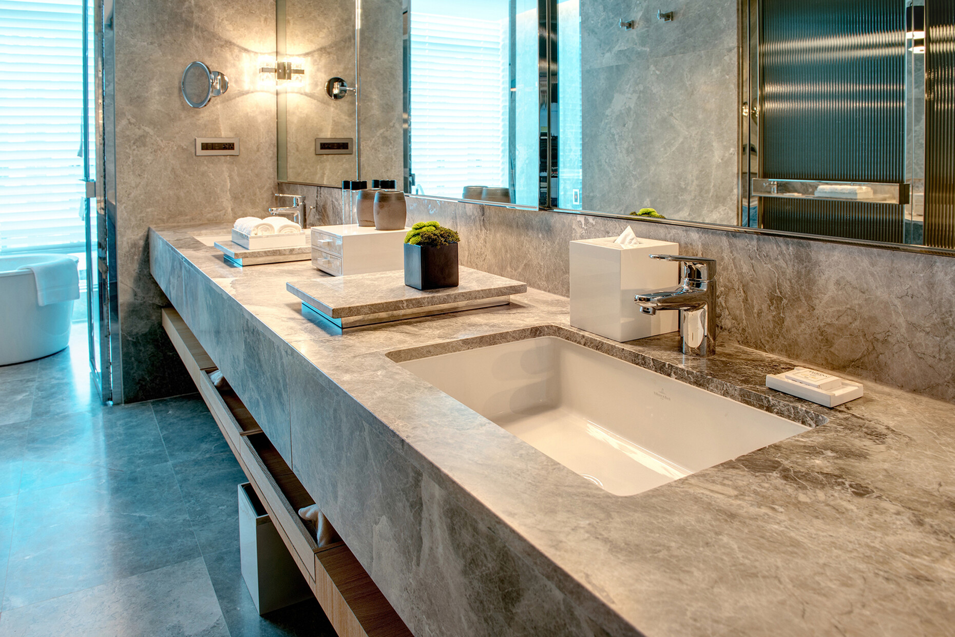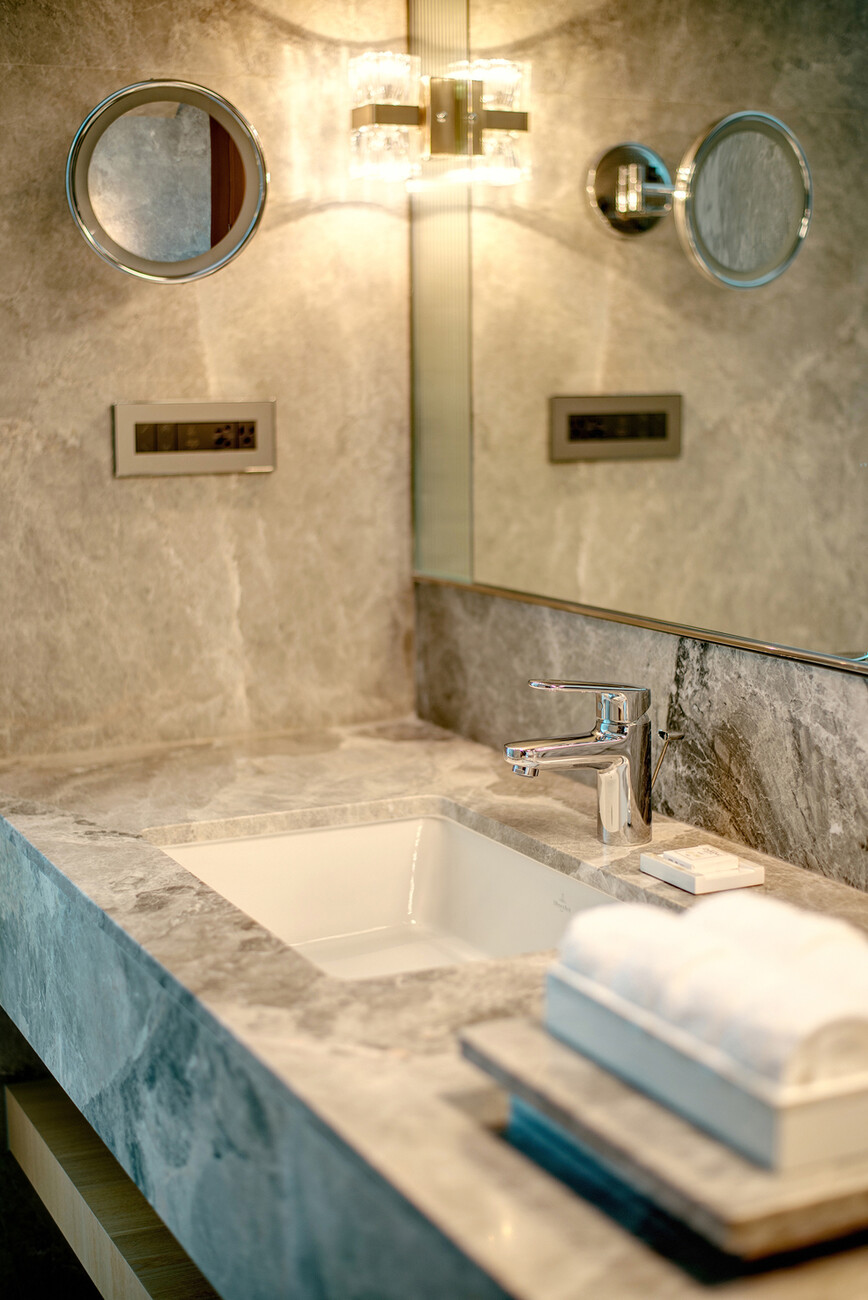 The total of 147 rooms are designed like private apartments: The light oak floor boards are pleasant to walk on barefoot, while a great deal of daylight suffuses the room through windows that run from floor to ceiling. Wood, light colors and fresh accents in blue hues give the generous spaces a homely feel. The architects chose a fit-out by Villeroy & Boch for the personal wellness area in the bathroom: The freestanding tub allows for wonderful relaxation after a long day in the port city. The architects also chose vanities from the “Tube,” “Memento,” and “Architectura” collections. The monumental impact of the bathrooms is superbly emphasized by ample marble surfaces and large mirrors. (am)