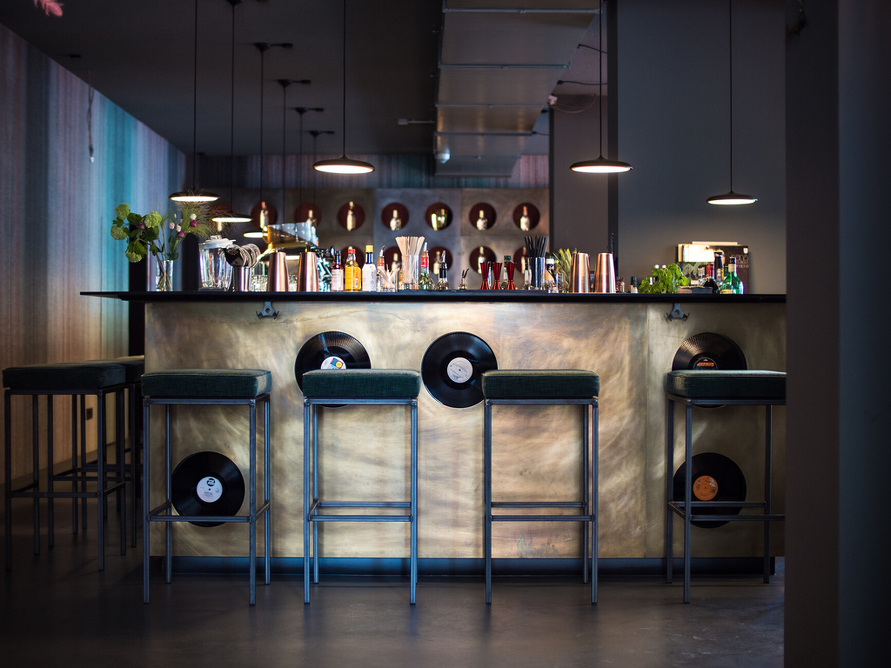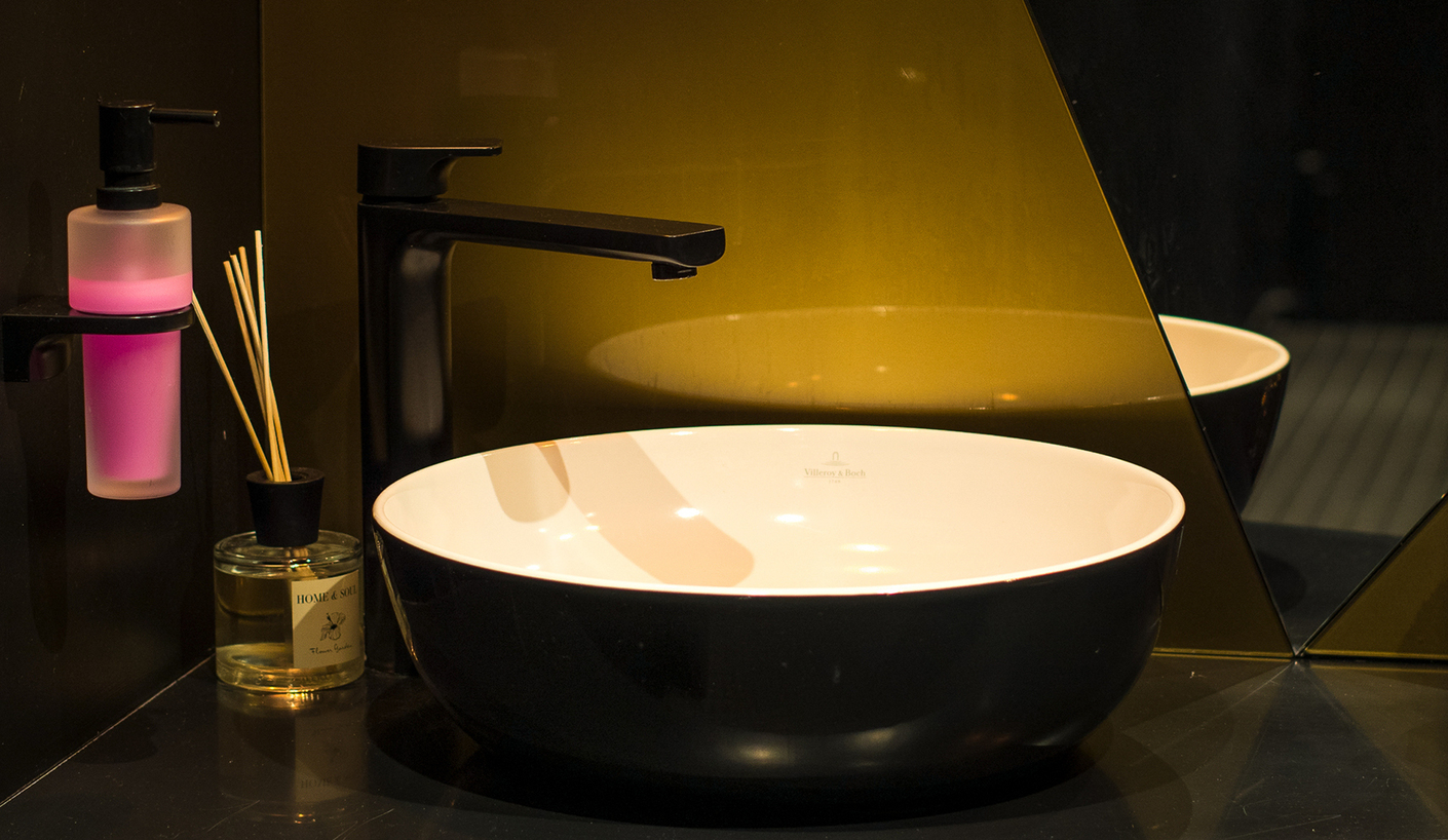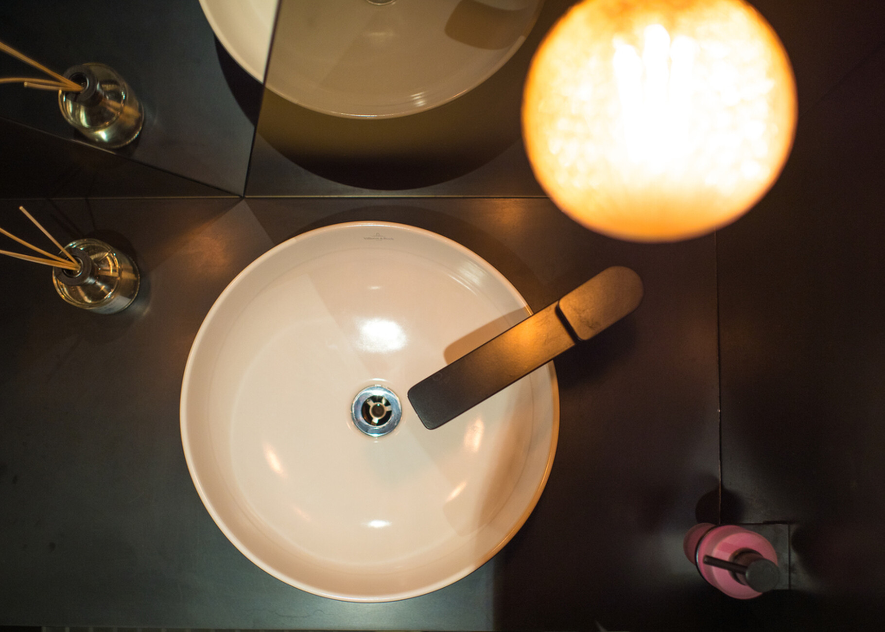 In the “33rpm” bar in Munich’s Haidhausen district life is leisurely, irrespective of the time of day: In the morning, the guests of the design hotel Jams next door flock in for breakfast; in the evening hip funk throbs round the rooms and the emphasis is on fine drinks. And at the “33rpm” music is not only in the air, as interior designer Michael Faltenberger opts for aural references, starting with the names of the cocktails via the coat hooks shaped like the middle turntable adapters for singles through to the complete mixing deck inserted into the reception top. The bar’s unique flair stems from a design influenced by upper-end clubbing and refined retro touches, with Faltenberger fostering harmony through contrasts: Dark colors, highlight in gleaming metal, soft velvet and hard steel combine to form a veritable theater set. And the idea does not end when you get to the washroom. There, golden sequins cover the walls, alternating with asymmetrical mirrored surfaces and anthracite ceramic mosaics. Added to which, the sanitary ceramics from Villeroy & Boch create stylish accents in terms of both shape and color: Gesa Hansen developed the color concept for the surface-mounted Artis washbasins that blend ideally into the “33rpm” concept with their silk-matt BiColour look and refined surrounding edge. Combined with the standalone washbasin “Cult” faucet sets in matt black, visually the ensemble is reminiscent of a record deck. The “Cult” bathroom accessories, such as the soap dispenser and the “ViConnect” series flush panels are color-matched accordingly. As the flushing flow restrictor in the ViConnect is easy to adjust, flushing is carried out economically and without many splashes.