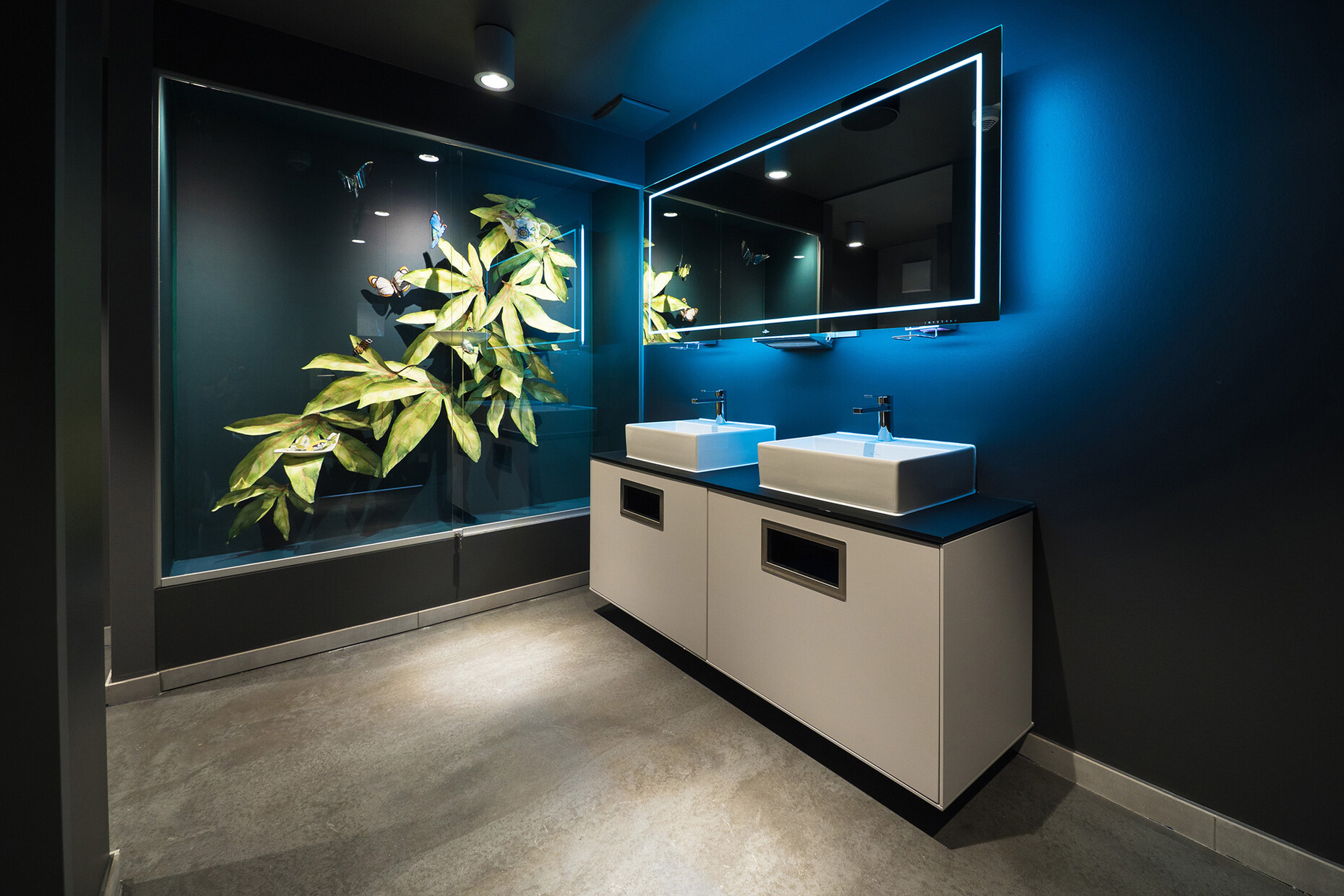 The former industrial building was also updated as regards energy efficiency and sustainability – temperature, oxygen content and lighting can all be selected via numerous regulating elements. And interior designers Triad from Berlin have produced a colorful highlight in the toilet facilities: There is a total of seven bathrooms and no two are the same. Designed using themes that range from a jungle through to a metallic look and all accompanied by matching music the firm demonstrates on its own premises its expertise when it comes to finding unconventional solutions. Several designs from the Villeroy & Boch bathroom and wellness range can be admired: The toilet models “Architectura”, “Hommage”, “Memento”and the shower WCs “ViClean-I 100 and L”were selected together with the washstands “Artis”, “Avento”, “Finion” and “Octagon”. With a large choice of different finishes from chrome to black and shapes from oval to rectangular the selected products make a perfect fit for the various theme worlds. Thanks to the ceramic finish CeramicPlus surfaces are not only hygienic but also easy to clean. (am)