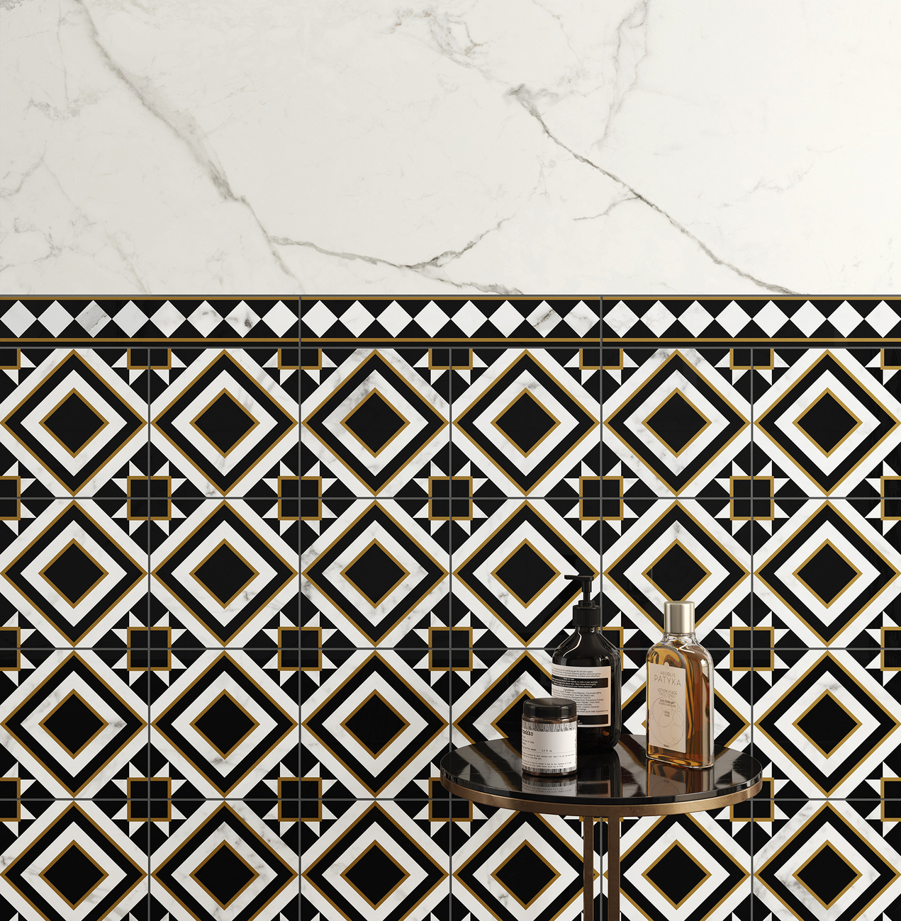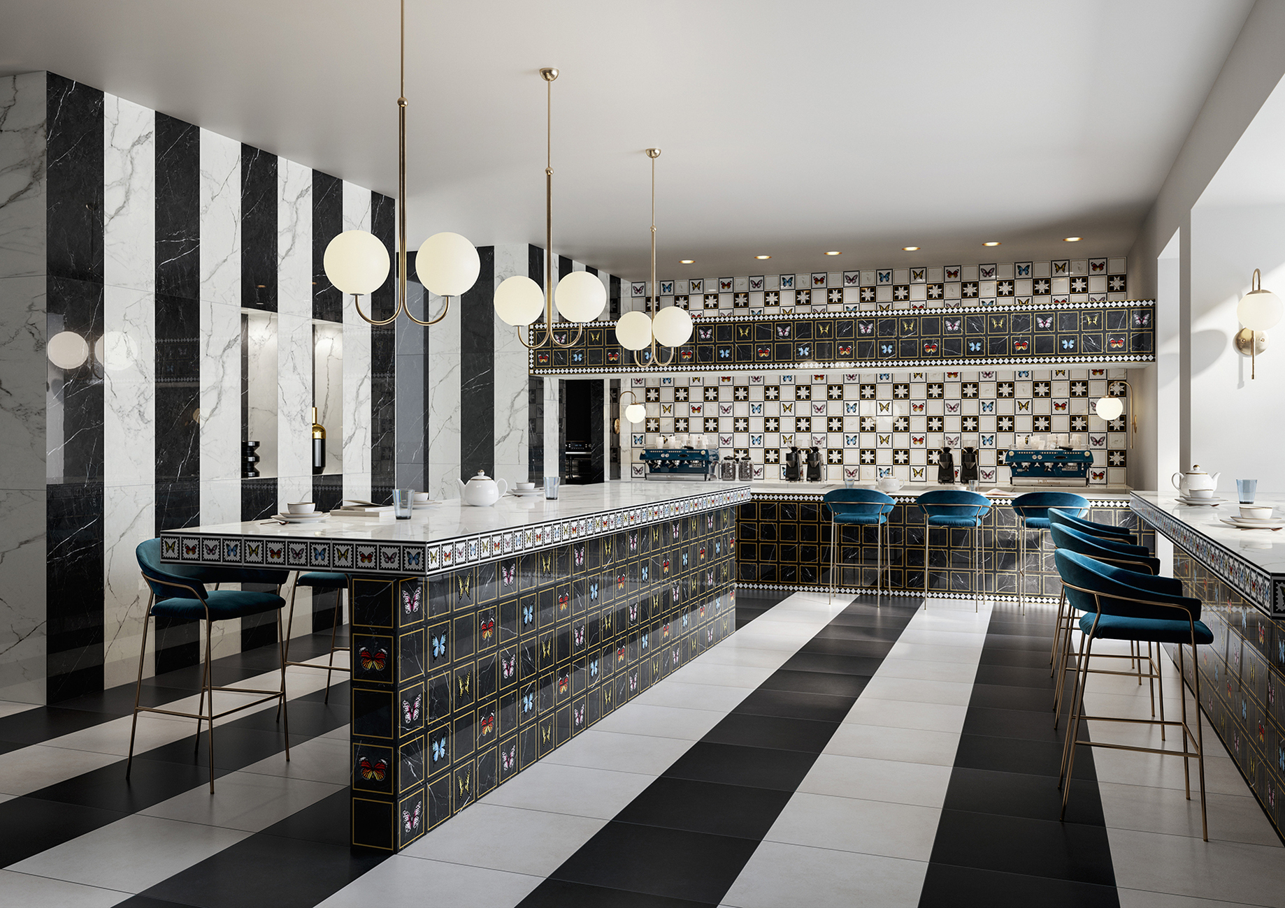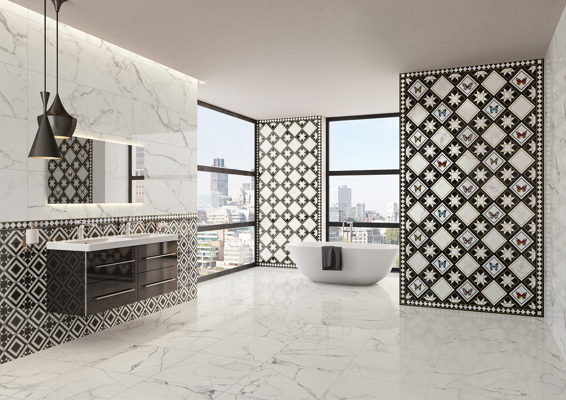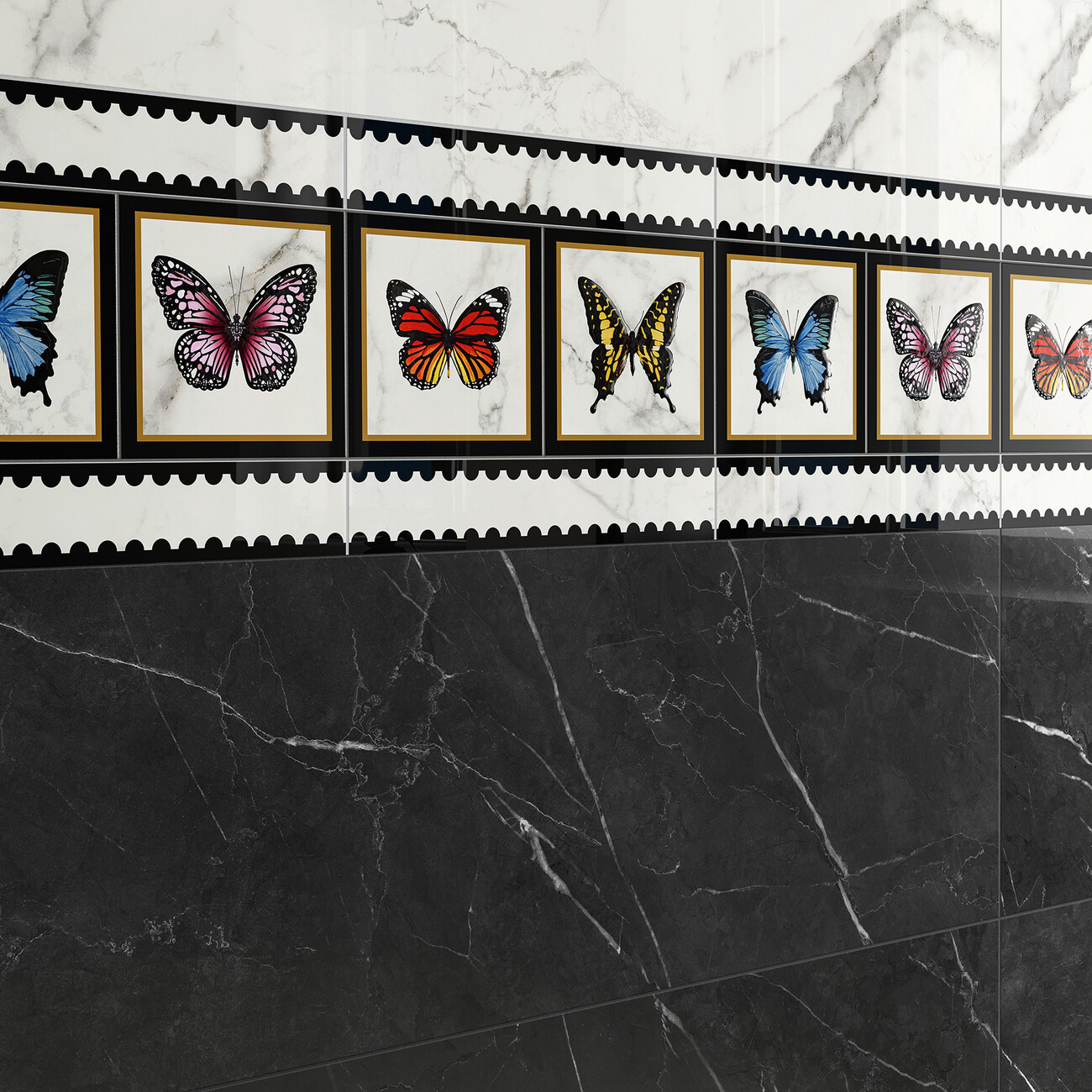 Through a repetition of motifs, the addition of concentric patterns and her sense of symmetry as well as proportion, the tiled surface does not appear overloaded despite the striking design. The eye finds detailed sections that one wants to approach for closer inspection, like graphic voids that allow one to come to rest briefly in the visual frenzy of the motifs. Each change of perspective reveals new levels of the varied tiled picture. Moreover, as the four magnificent butterfly designs in total are created using a combination of modern digital printing and traditional printing techniques on the white or black marbled background, a visual 3D effect is created that gives the tiles a handcrafted look. "It is a privilege to work with Villeroy & Boch tiles - an exciting process to imagine and create spaces where people will live every day," says Mary Katrantzou. Thanks to the richly varied collection, there is plenty of scope to put together an individual work of art for the room from it: Eight different decorative sets measuring 20 x 20 centimetres, as well as borders and corners can be chosen. The butterflies are decorated straight or at a 45-degree angle with golden, black or perforated borders. While the decors may decorate the walls, the collection offers complementary polished floor tiles in marble look made of glazed porcelain stoneware.
