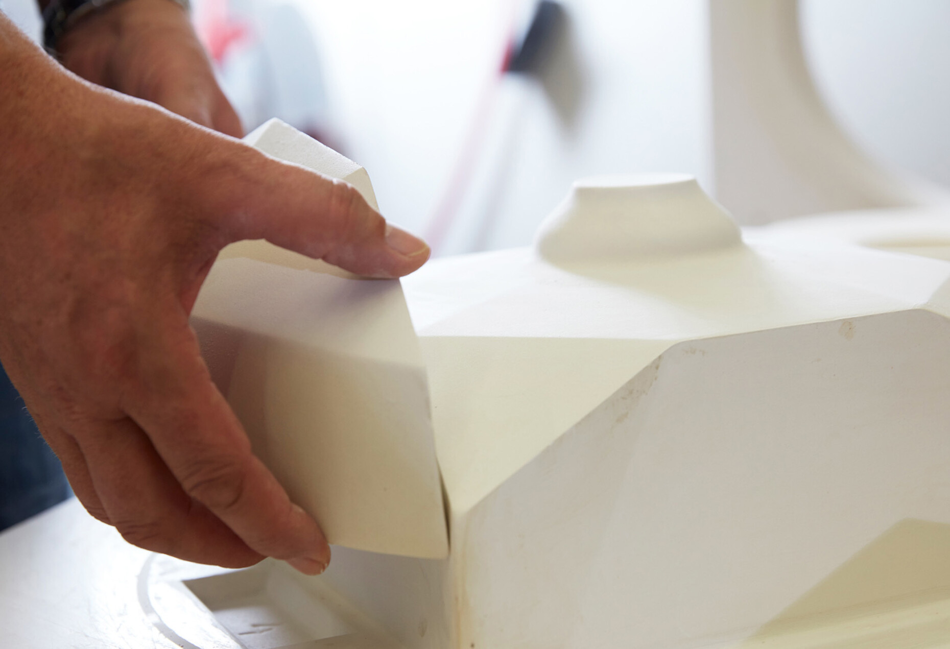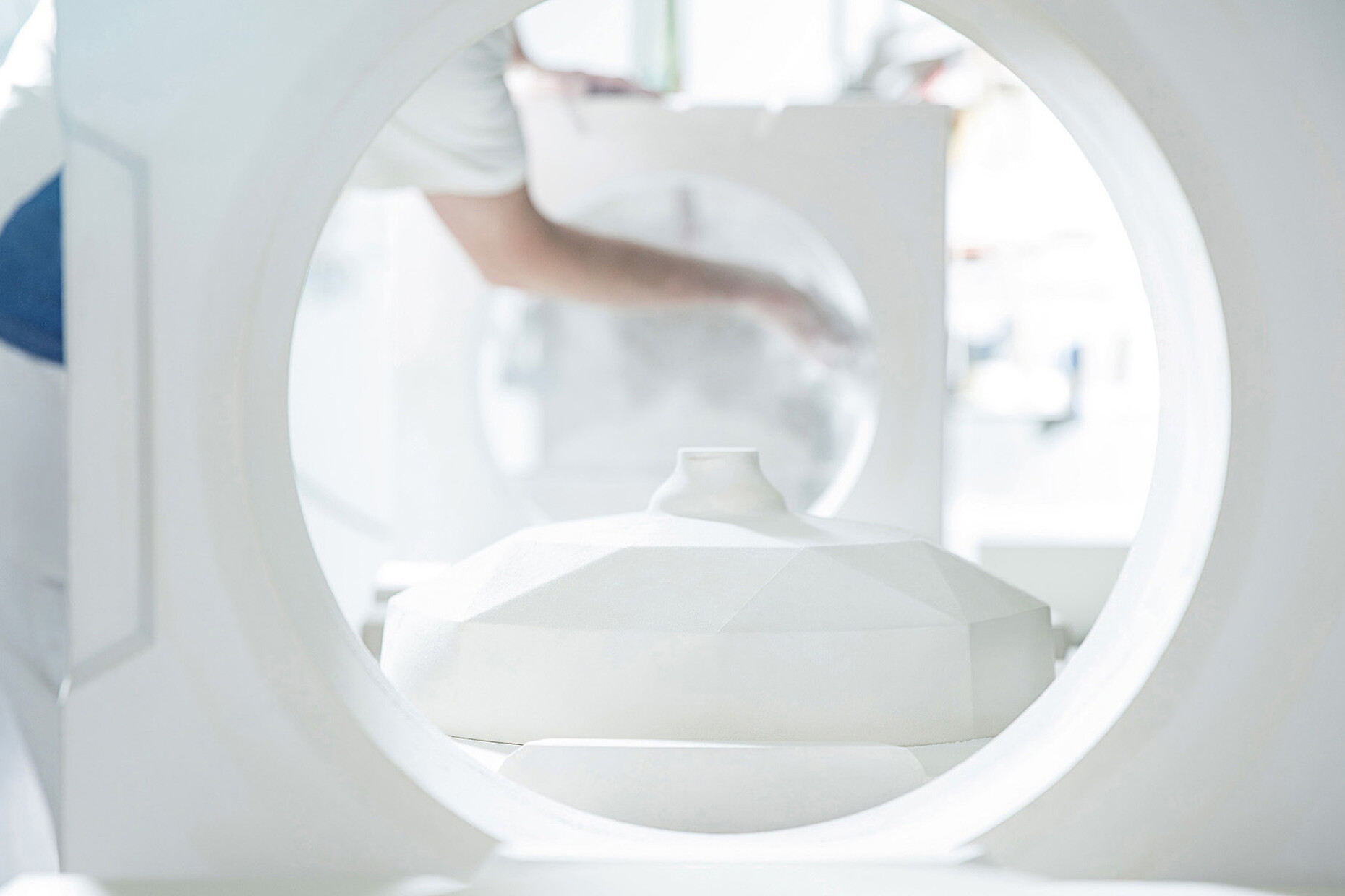 In order to be able to make such thin ceramic pieces the “Octagon” basin is cast in many small parts, unlike the usual practice of two-section basins. Without "TitanCeram" it would simply not have been possible to realize the design – it is cast by experienced staff members by hand rather than mass produced. “Octagon” is very special in this regard, as many mass-production processes today are fully automated, bar deburring the casts and the final quality controls. “Octagon” stands for true precision and small unit numbers. And a special glaze gives the column a pleasant touch. That such thin edges can be completely and evenly coated is the result of the precise viscosity of the glaze. And thanks to the specially developed glaze for the "Octagon", the ceramics also boasts a high-grade and particularly resistant surface texture that protects it ideally against external factors. An impact test was used specially for Steffan’s design to measure the ceramic’s resilience. Thanks to "TitanCeram" the thin edges are highly durable.