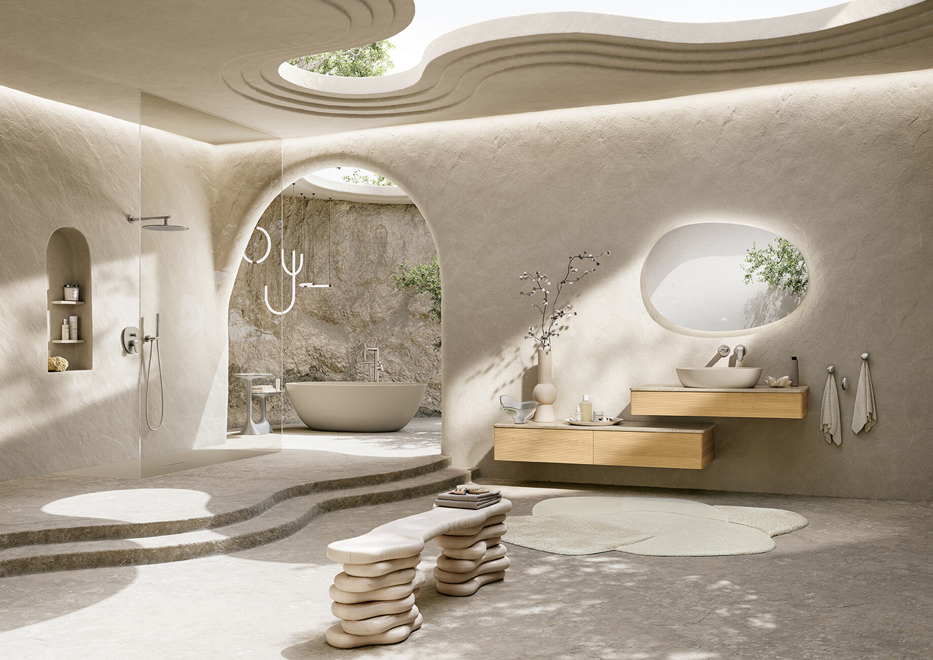 Beige, brown, sand – these colours bring the promise of warmth and relaxation. Warm minimalism’ has now also arrived in the bathroom, emphasising its function as a fully-fledged living area. Villeroy & Boch combines the beauty of natural, durable materials such as fine solid wood and high-quality ceramics in natural colours such as ‘Almond’ or ‘Morning Green’. Fittingly, the organic shape of the ‘Antao’ complete bathroom collection from Kaschkasch is inspired by dewdrops and combines all components, from the washbasin to the taps and WC, in a balanced way. Thanks to the premium TitanCeram ceramic, the surfaces are delicate in design and particularly robust. These are ideally complemented by stylish bathroom furniture, such as in ‘Warm Walnut’ or ‘Honey Oak’, which look particularly elegant in the colour-coordinated setting.