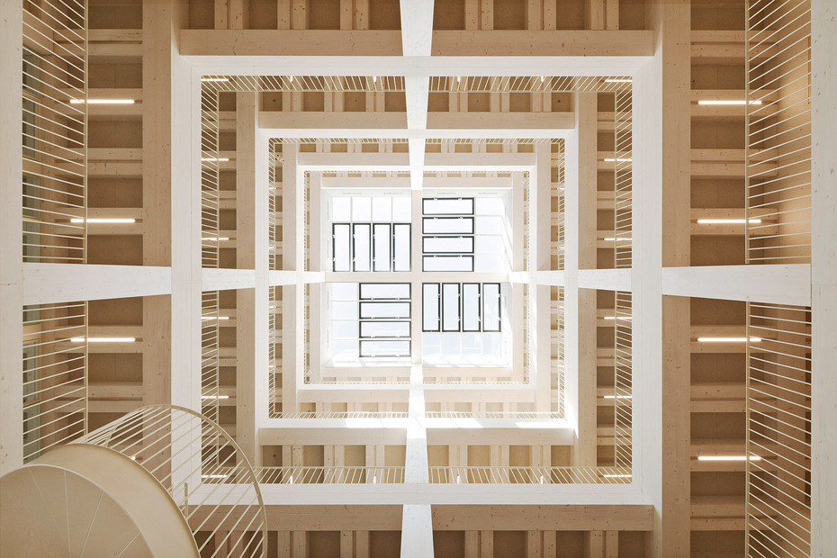 After the entrance area, a beautiful space opens up that extends through the house on all five floors up to the roof, where it is crowned by a glass lantern that brings daylight down to the ground floor and the walkways that surround the air space on each floor. A great space. Here you can experience the full quality of contemporary timber construction. The components are neatly and naturally joined according to their structural logic, and a spiral staircase connects the ground floor with the first floor. Both this small staircase sculpture and the metal balustrades of the walkways are painted in a beige that comes surprisingly close to the colour of the glazed wood.