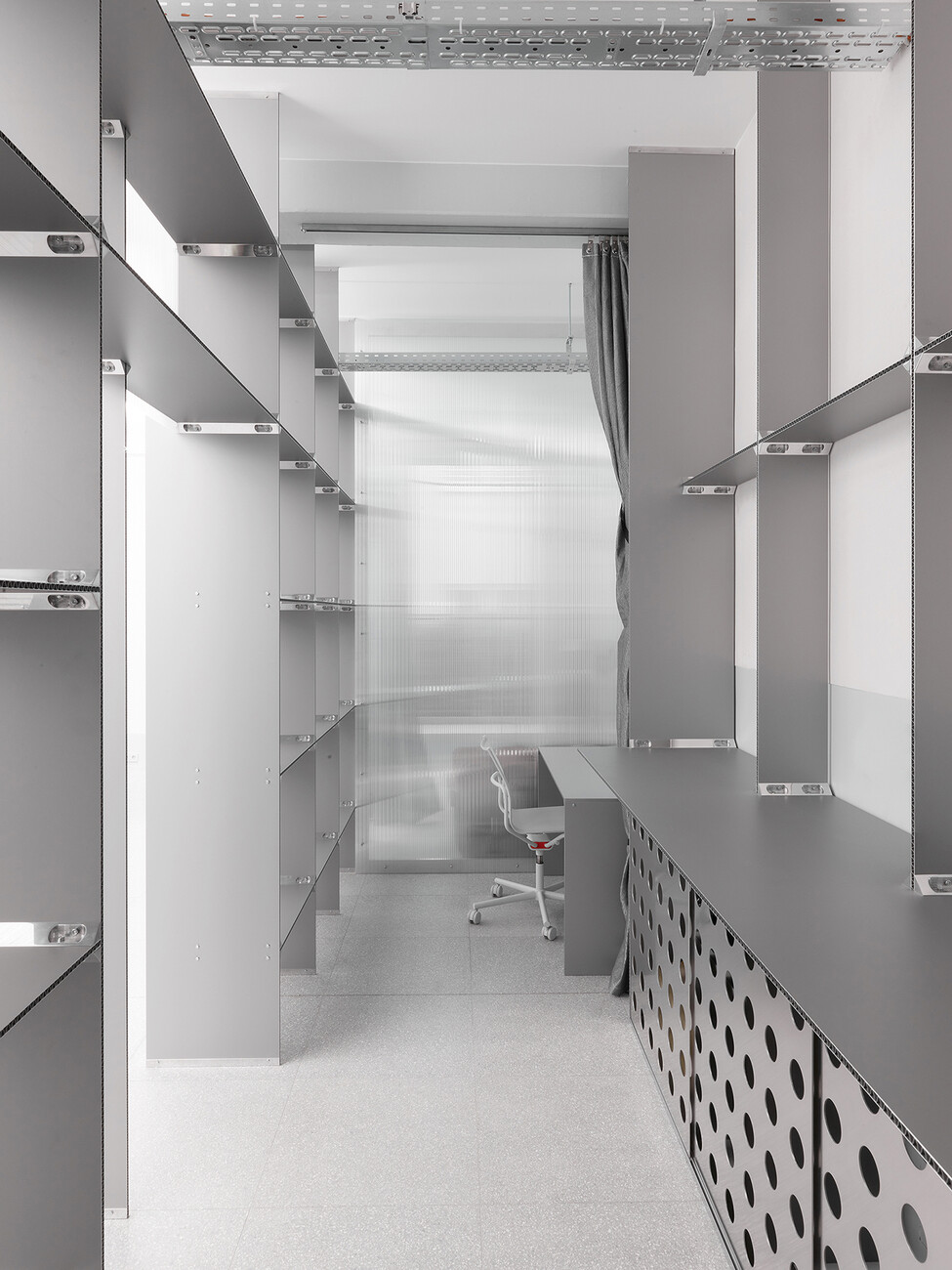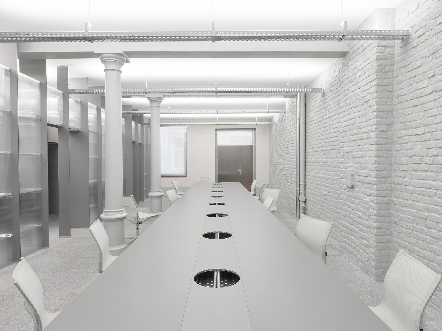 In Mirko Borsche’s office “d2” structures the room. The center of the room is occupied by a three-part table some nine meters long made of lightweight 11.5-millimeter aluminum panels with a honeycomb structure. The aluminum panels are originally from the industrial sector and were conceived for use in airplanes. Other equally lightweight items are used in the archive rooms; they feature cardboard honeycomb panels some four centimes thick in different color combinations. “All the furniture elements are made up of untreated panels with open edges, which were put together using customized binders developed by Gonzalez Haase AAS made of solid, highly-polished aluminum. This adds a unique detail to the austere, matt composition of the tables and shelves. These elements open up the way for developing the furniture in an industrial process,” says Judith Haase.