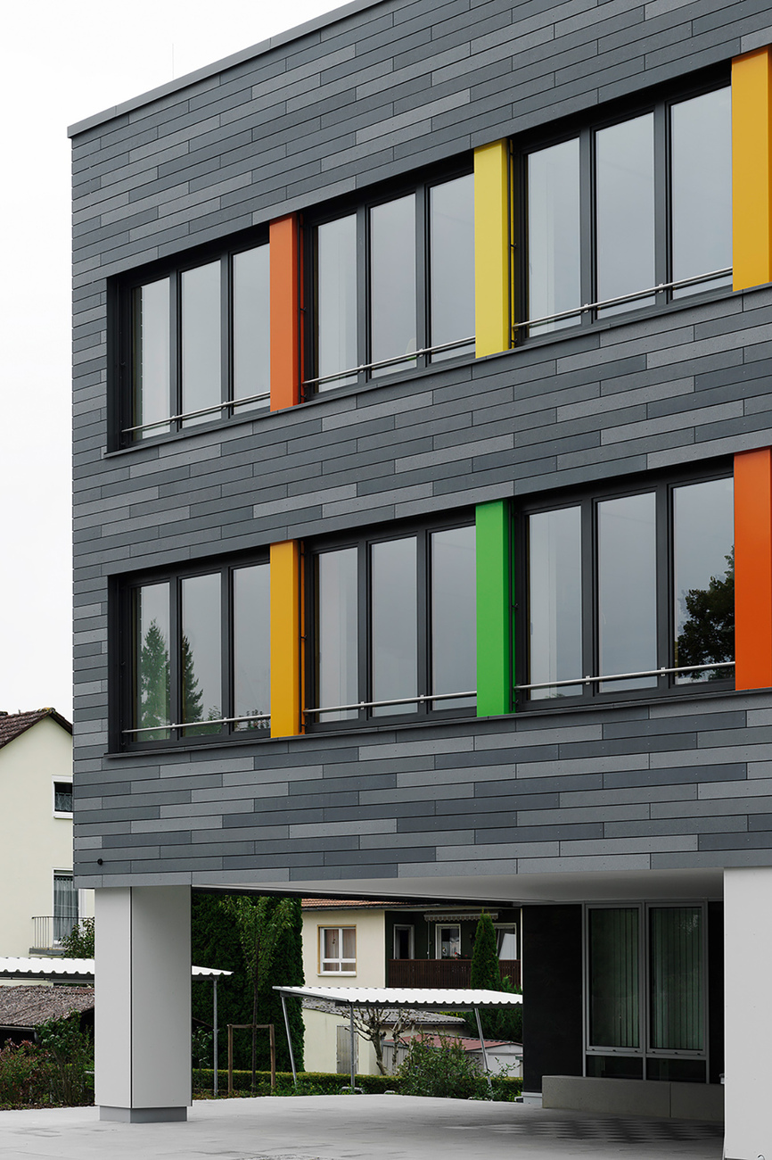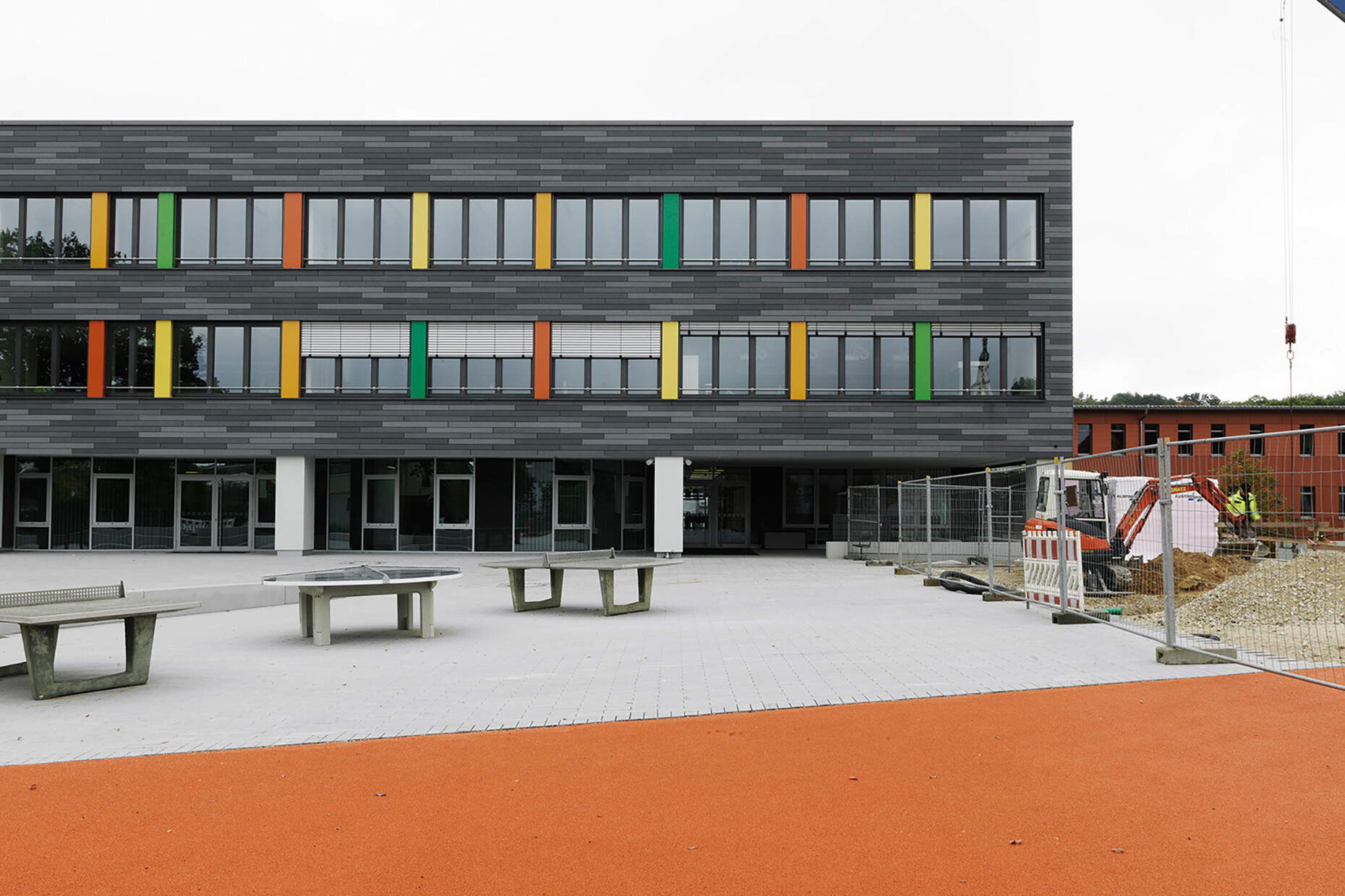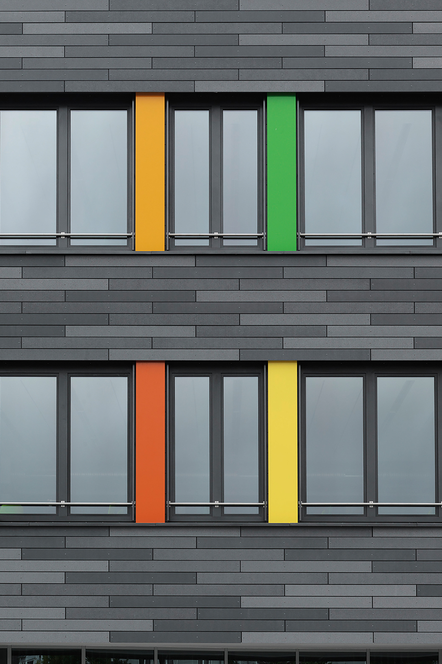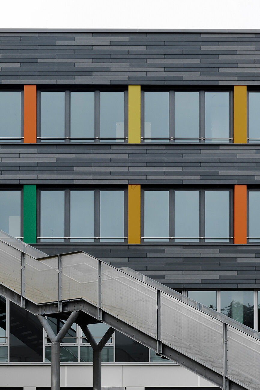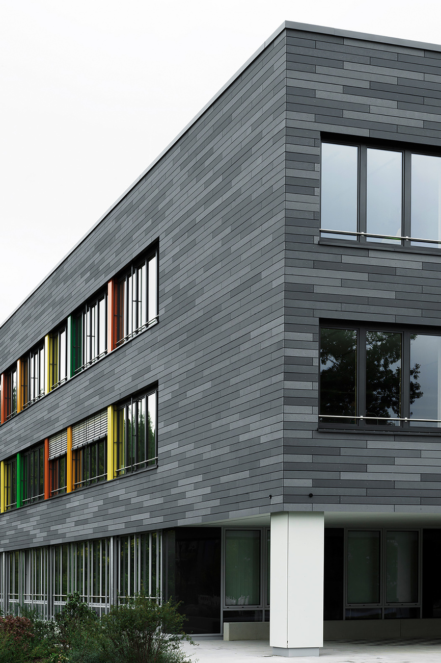 A special focus of the planning was on the sustainability and longevity of the building materials used. For this reason, the architects opted for products from Rieder when designing the new façade: "öko skin" was selected, a cladding made of glass fiber concrete in lath format, the production of which consumes only little fossil primary energy. Since the 13 millimeter thin battens are available in widths of 70 to 302 millimeters and in lengths of 700 to 2500 millimeters, the architects had numerous design options for the structure of the facade. In addition, there was a wide variety in the choice of colors and textures, as the elements are available in different surfaces as well as four different color worlds. Coplan AG opted for the color "anthracite" in combination with the surfaces "ferro", "ferro light" and "matt", which, arranged horizontally, create a lively and varied interplay on the facade. The color fields in green, red and yellow placed between the ribbon windows additionally loosen up the appearance of the school as a contrast to the slats. Because fiberglass-reinforced concrete does not need to be sanded or painted, the new façade of the Walter Höllerer Secondary School features low maintenance and a long service life of more than 50 years. Thanks to its proven ball impact resistance, "öko skin" is particularly suitable for facades on sports fields and playgrounds. The individual battens made of glass-fiber reinforced concrete are lightweight yet extremely durable. Moreover, they are easy to process during installation and have absolute fire resistance due to their thermal values. In addition, all Rieder products are free of crystalline silica or other ingredients that are hazardous to health. With its architecturally sustainable façade solutions, Rieder thus meets the high demands placed on educational buildings.