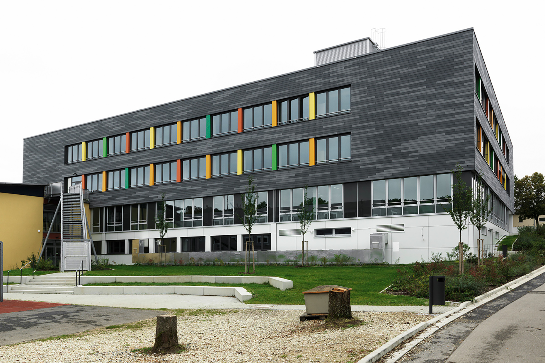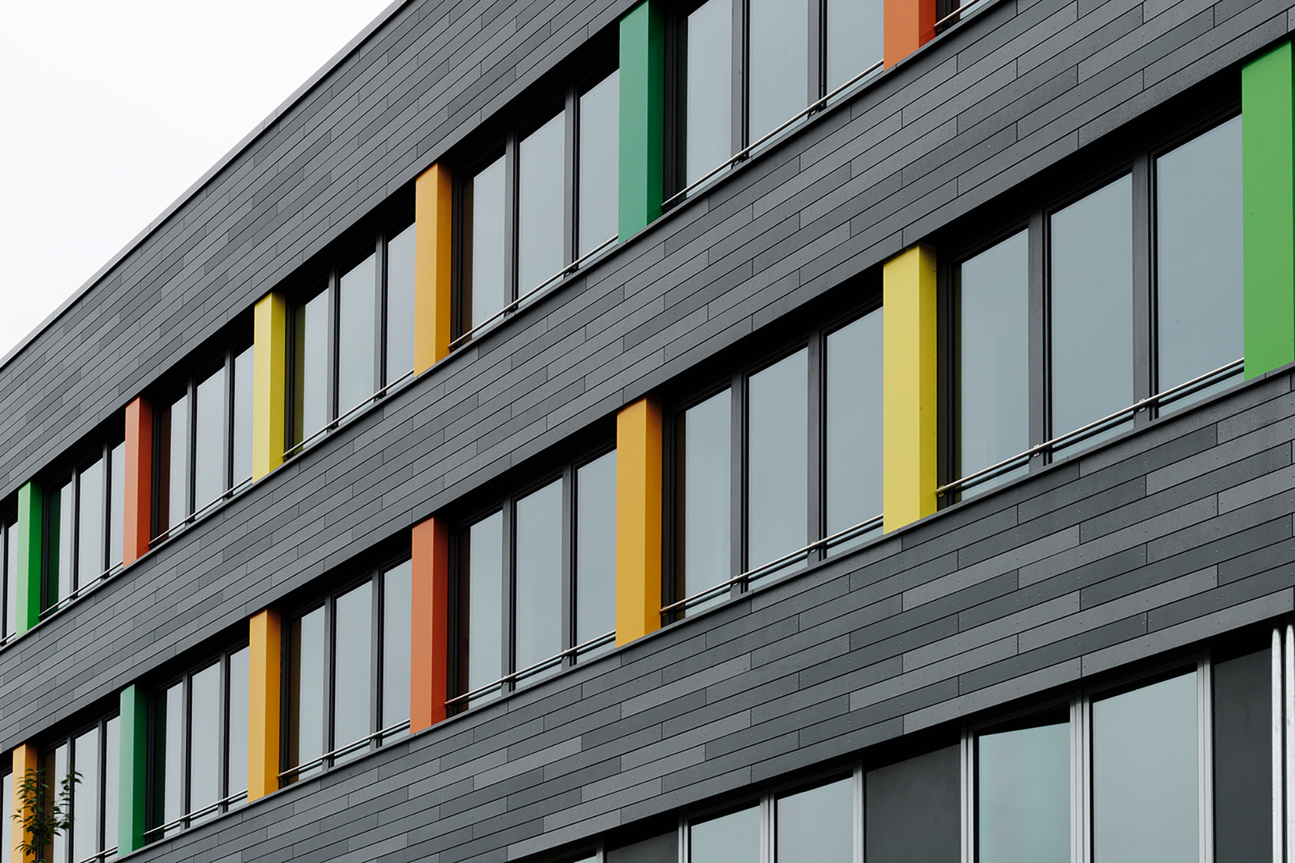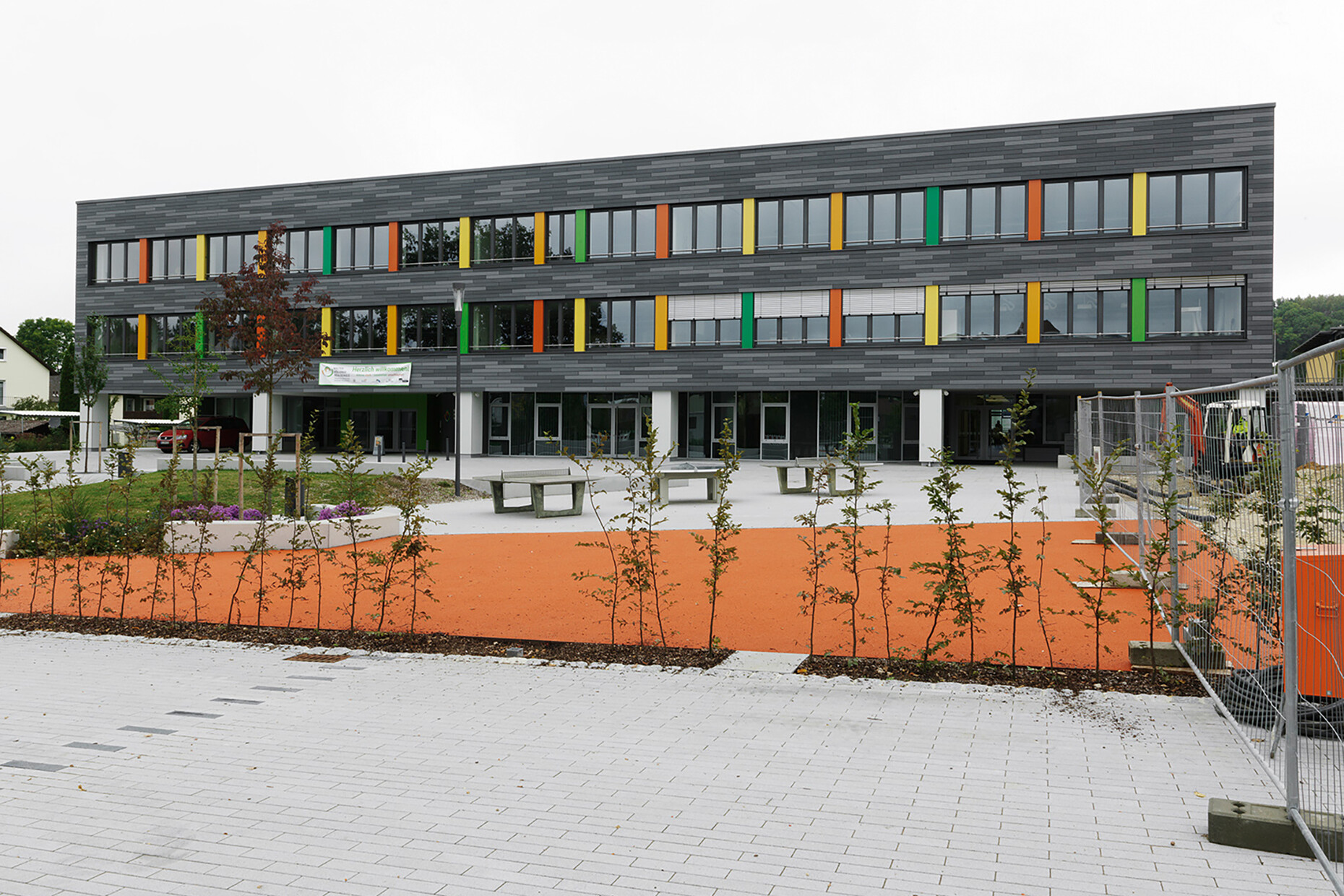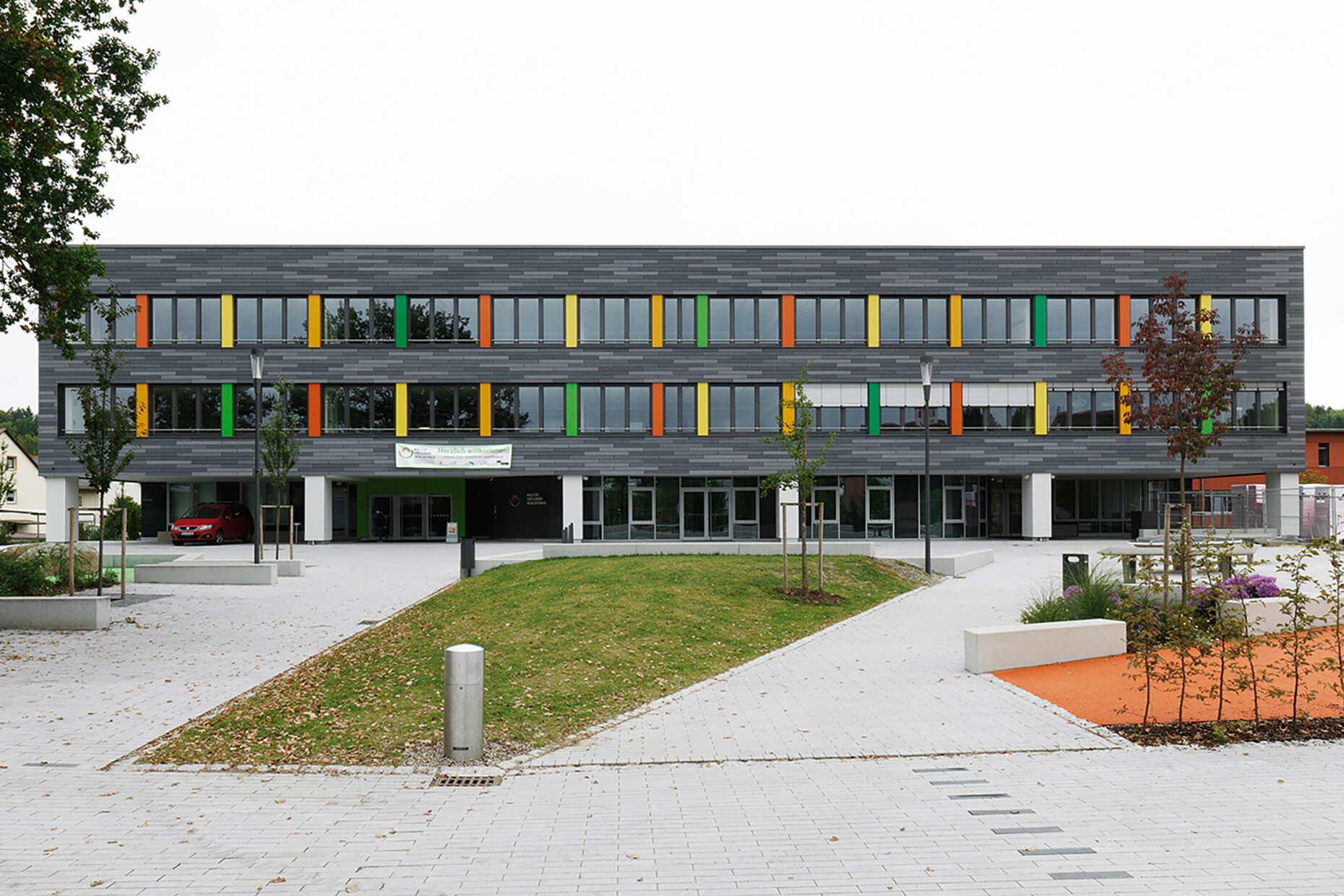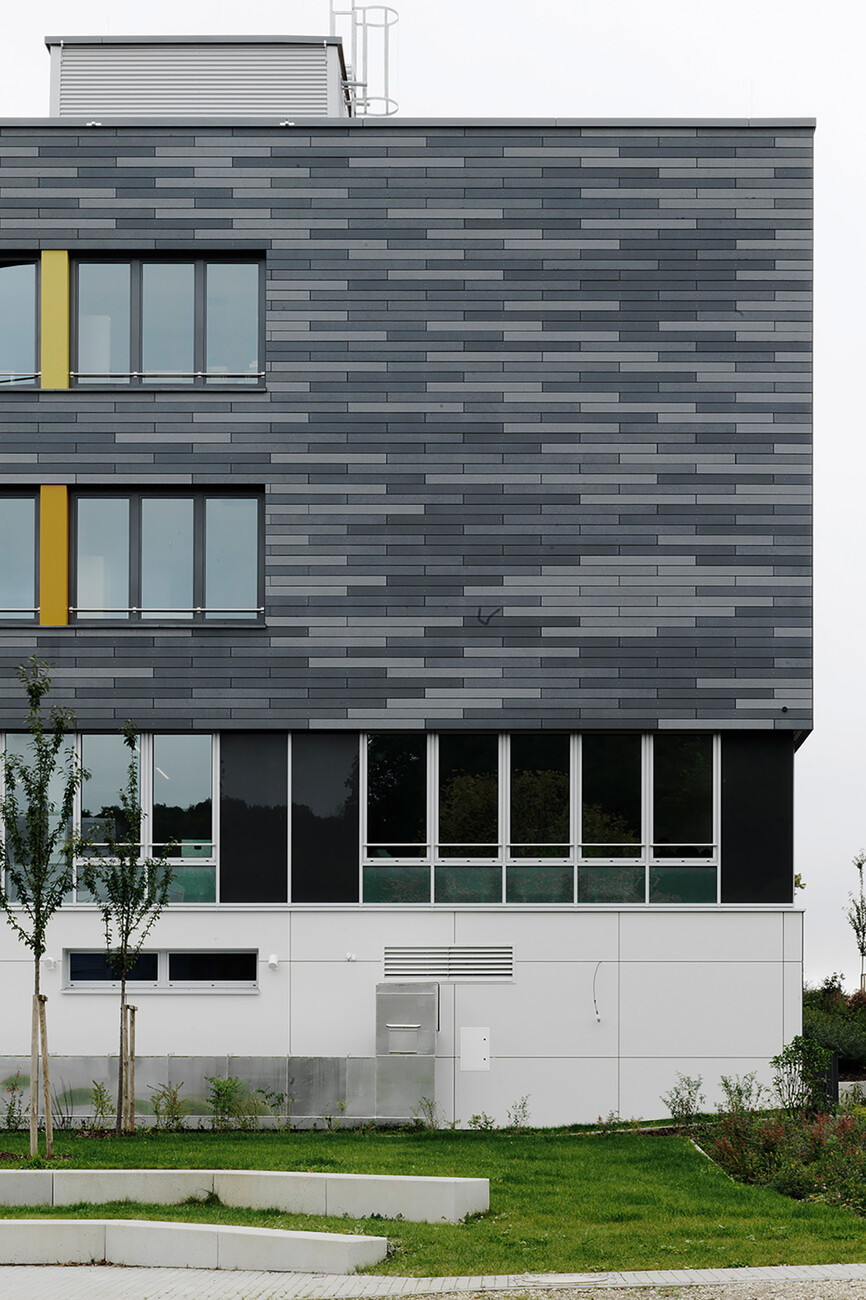 A special focus of the planning was on the sustainability and longevity of the building materials used. For this reason, the architects opted for products from Rieder when designing the new façade: "öko skin" was selected, a cladding made of glass fiber concrete in lath format, the production of which consumes only little fossil primary energy. Since the 13 millimeter thin battens are available in widths of 70 to 302 millimeters and in lengths of 700 to 2500 millimeters, the architects had numerous design options for the structure of the facade. In addition, there was a wide variety in the choice of colors and textures, as the elements are available in different surfaces as well as four different color worlds. Coplan AG opted for the color "anthracite" in combination with the surfaces "ferro", "ferro light" and "matt", which, arranged horizontally, create a lively and varied interplay on the facade. The color fields in green, red and yellow placed between the ribbon windows additionally loosen up the appearance of the school as a contrast to the slats. Because fiberglass-reinforced concrete does not need to be sanded or painted, the new façade of the Walter Höllerer Secondary School features low maintenance and a long service life of more than 50 years. Thanks to its proven ball impact resistance, "öko skin" is particularly suitable for facades on sports fields and playgrounds. The individual battens made of glass-fiber reinforced concrete are lightweight yet extremely durable. Moreover, they are easy to process during installation and have absolute fire resistance due to their thermal values. In addition, all Rieder products are free of crystalline silica or other ingredients that are hazardous to health. With its architecturally sustainable façade solutions, Rieder thus meets the high demands placed on educational buildings.