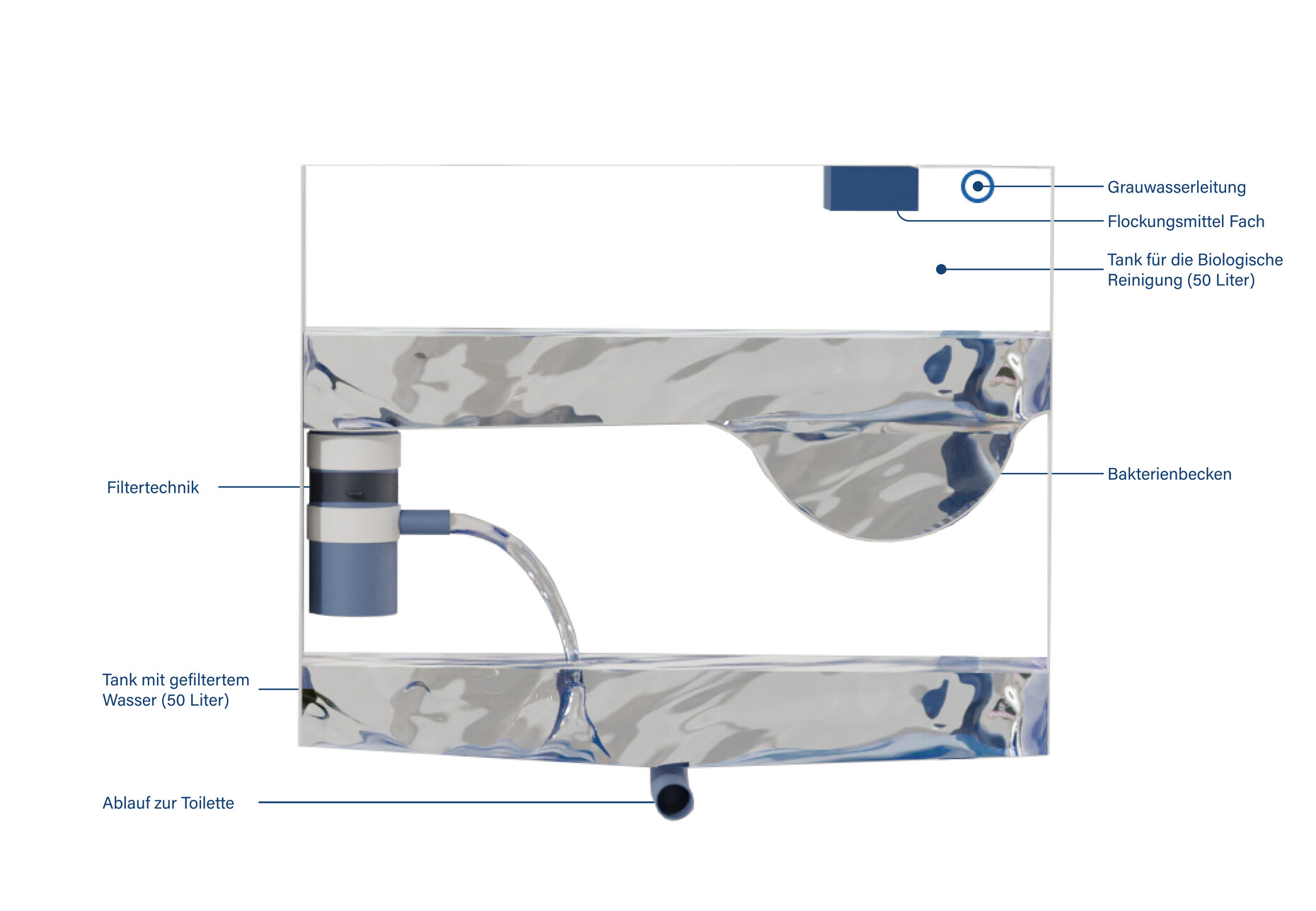 Helena Fricke: The problem is when grey water is collected and reused for whatever purpose: it starts to stink or the system gets dirty. The main task was to ensure that the filter system doesn't break down after three months or five years. We didn't want to design a product that needs a filter change once a week. We have now designed it so that the filter has to be changed once a year. And that it is as maintenance-free and resistant as possible, so that it doesn't destroy itself.