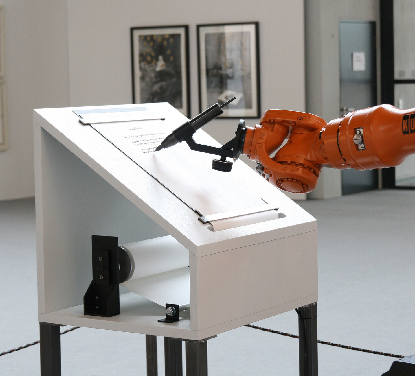 In this section too there are furniture and objects printed by, and in some cases designed by, machines, such as the 3D printed Cantilever Chair by CurVoxels at the Bartlett School of Architecture in London. Another industrial robot in the room, programmed by the German Robotlab, is busy writing out manifestos. These manifestos are randomly generated and make sense, but the robot has no awareness of what they mean – no semantics are involved here. Thus, in the words of ABB CEO Ulrich Speisshofer, who built YuMi: “Human fantasy is still much farther ahead of where reality is”. Although it might appear that the Fourth Industrial Revolution is well advanced, the reality has yet to match the hype. Will robots steal our jobs? “This is a question that has been around since the first industrial revolution”, says Klein, “maybe they will create new kinds of jobs instead.”